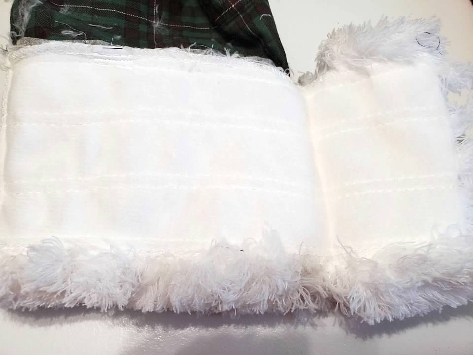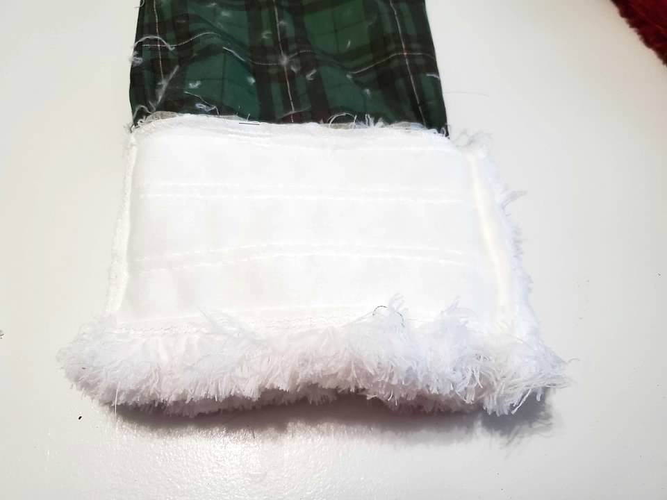 I pinned all around the top of the stocking.  Using a simple stitch I attached the pad to the stocking, leaving the one end of the pads unstitched.