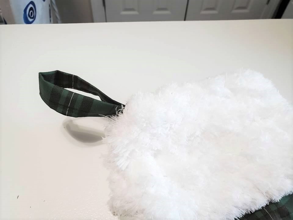 I also stitched down the side of the opened piece of fur and cut the extra piece off. I placed the hanger between the fur and the stocking.  I stitched the unfinished seam closed.