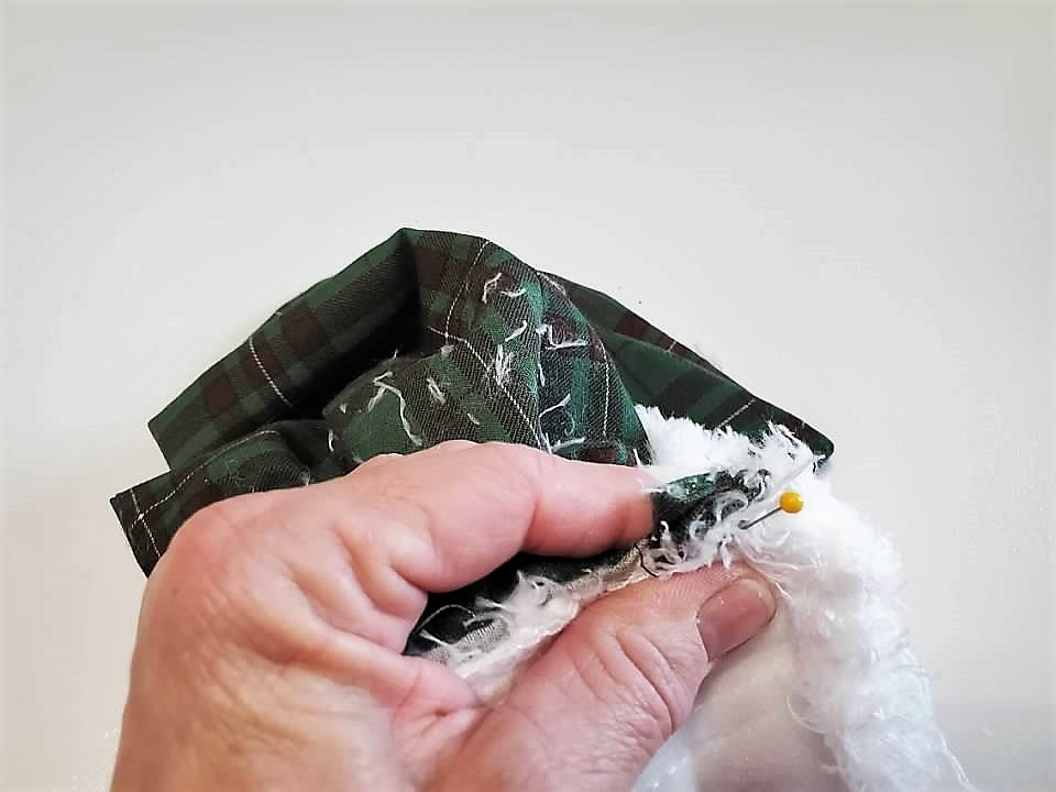 I lined up the seam of the stocking with the seam of the dusting pad.  Pinning the fur side of the pad to the inside of the stocking.   Hope this make sense.  The padding should be inside of your stocking with the fur facing the wrong side of the material.