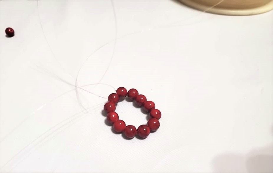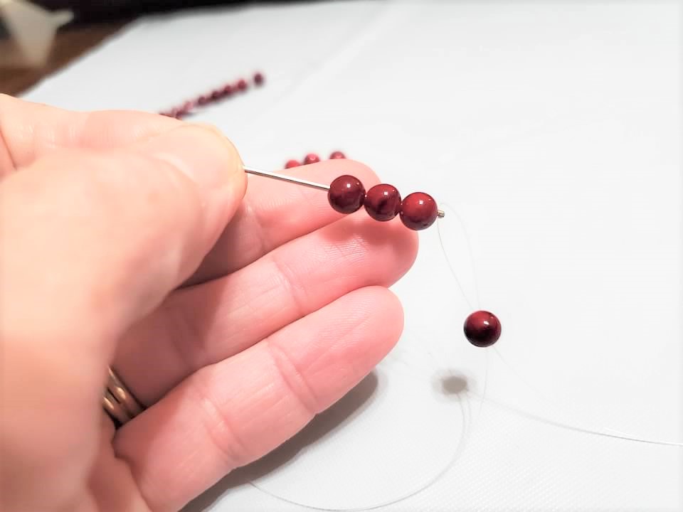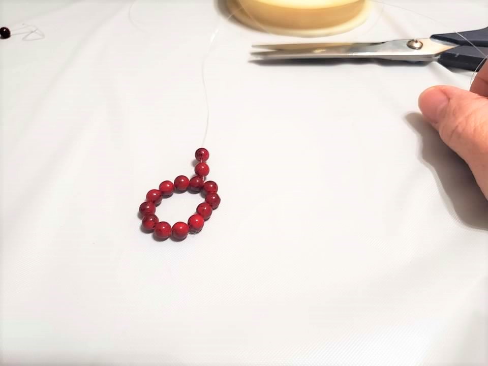 I used fishing line, a needle and the mini red beads Mariah sent me.
