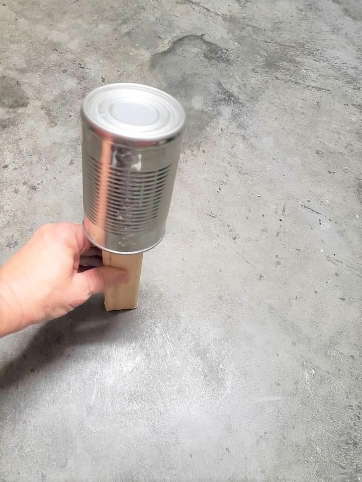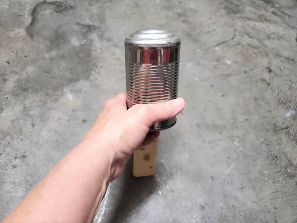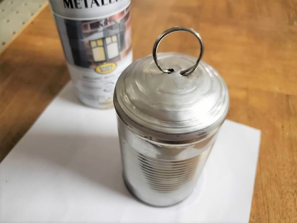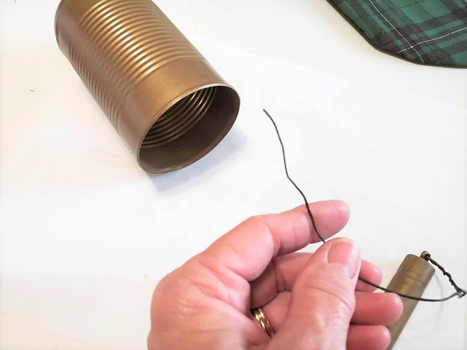 To add a topper to the can I punched two holes with a nail.  I put the scrap piece of wood inside the can while I punched the holes to support the shape.