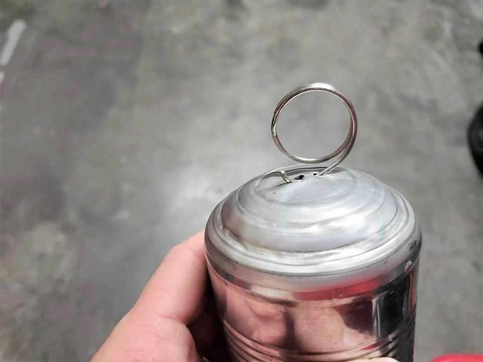 Threading the wire inside the can into one of the holes, I pulled the wire through the hole until I got the clapper where I wanted it in the can.  I wrapped the wire around the key chain neatly.