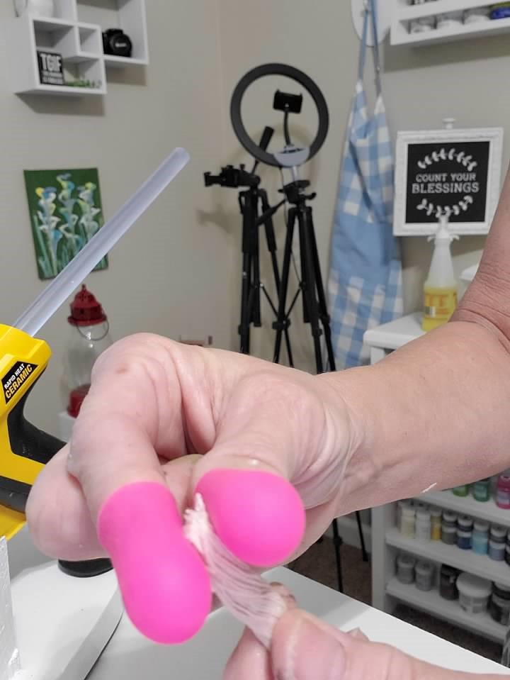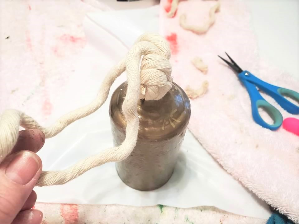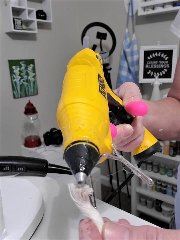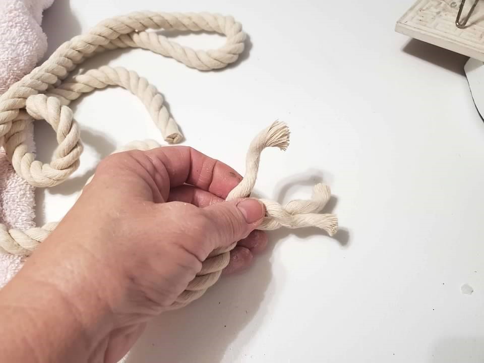 Looking back at the rope in the first attempt it looks to thick, instead of the full rope I used one strand.  I applied hot glue to the ends to prevent from fraying.  I did remember to use my finger protectors, (after I burned one finger).  I tied the rope to my bell.