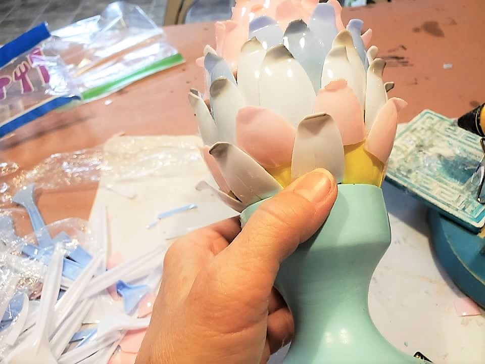 10. I can’t believe the things you can cut and create with–I wouldn’t have known a person could cut plastic spoons– you must have sharp scissors and a strong hand?! What a good artichoke imitation!