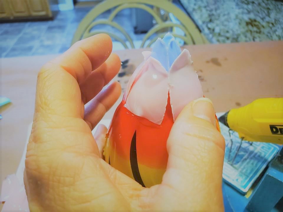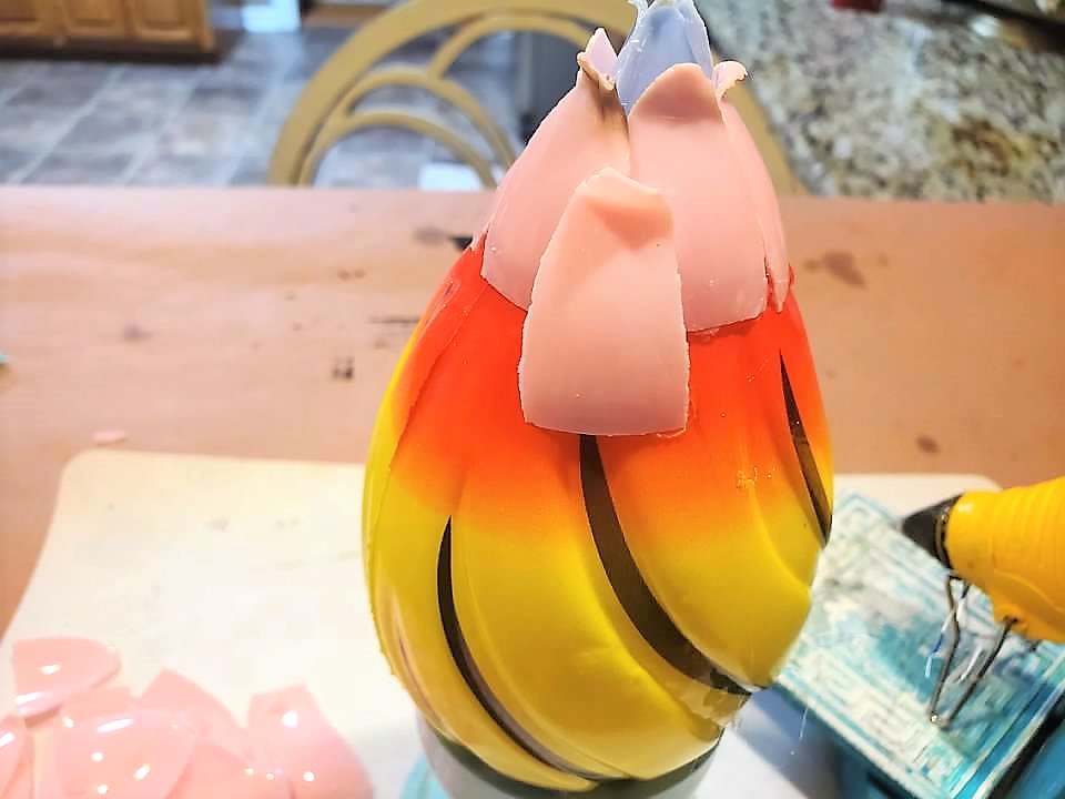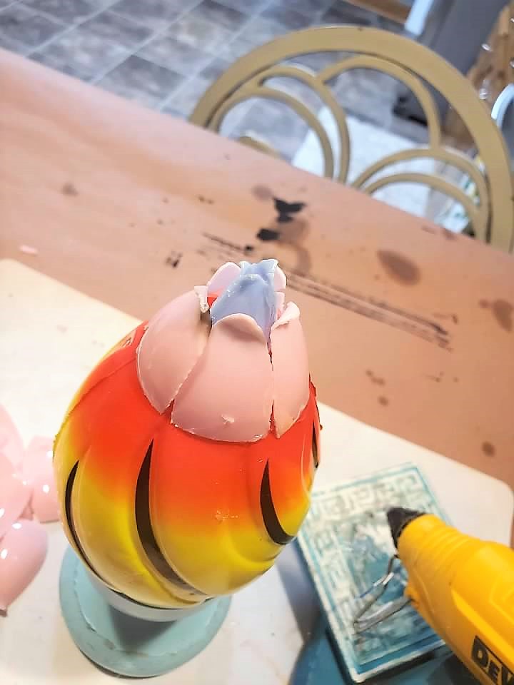 • Apply hot glue to the bottom of each petal.  Glue each petal around the topper.