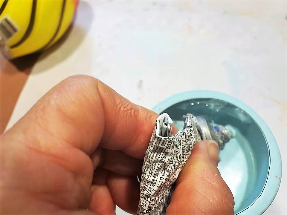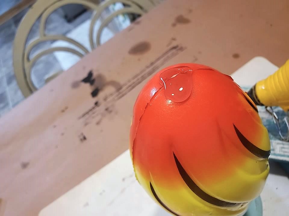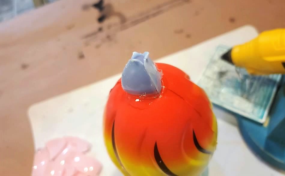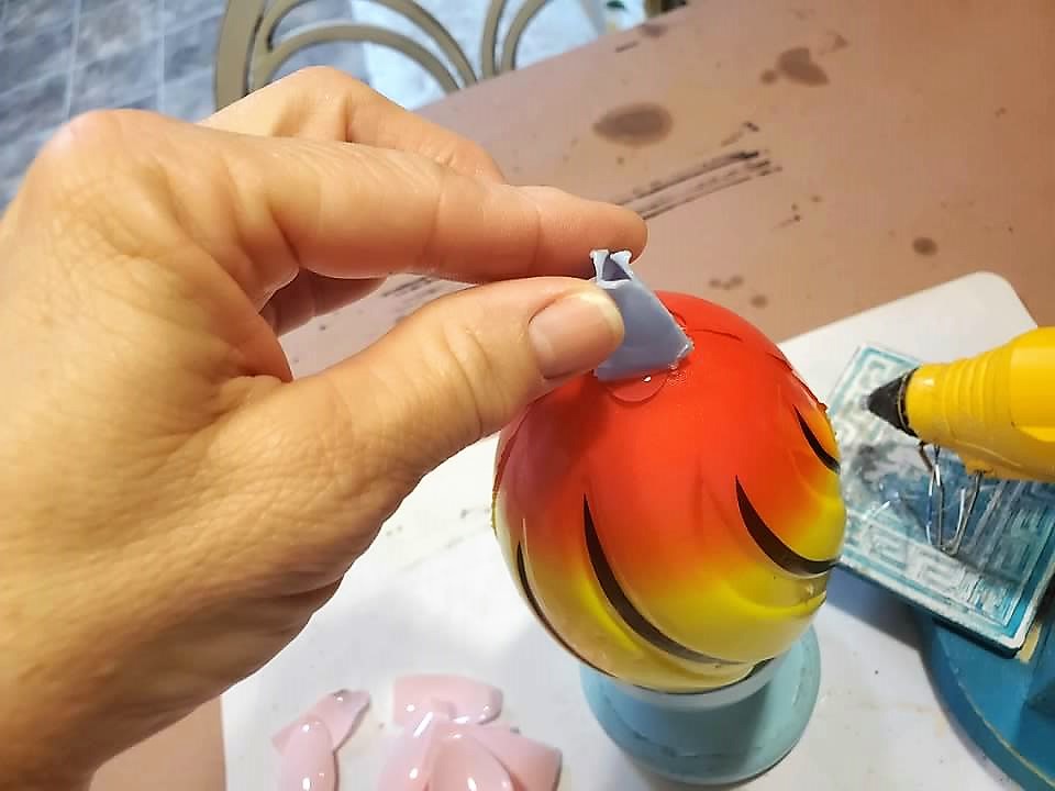 • Adding a drop of glue to the very top of the football.  Apply the topper to the hot glue, hold until it sets.