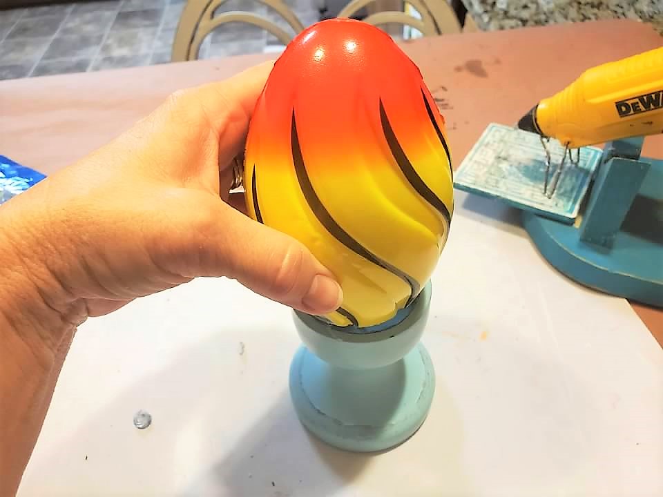 • To keep the football securely on the holder I applied E6000 and hot glue around the opening.  I placed the cut end of the football inside the opening.