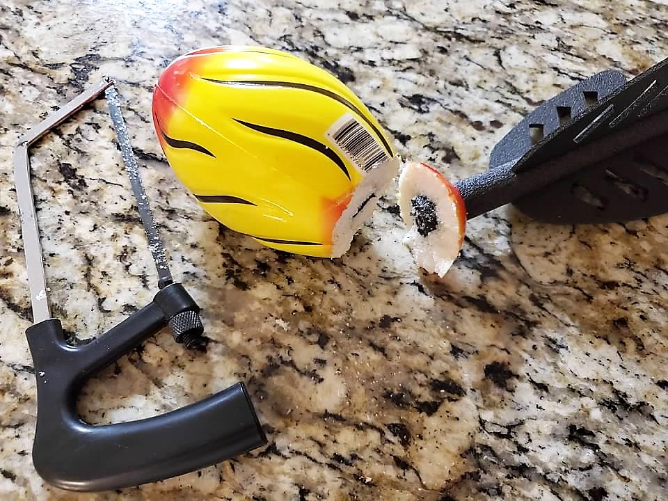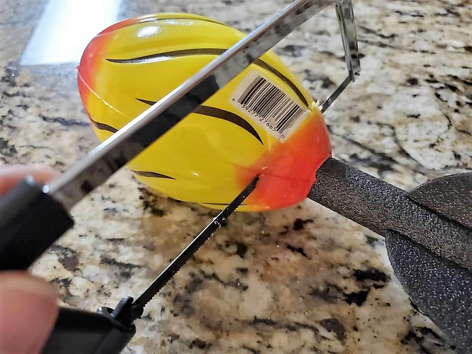• Cut the football off the rocket.  To cut my toy I am using my Dollar Tree hacksaw.   Making sure it is cut evenly.