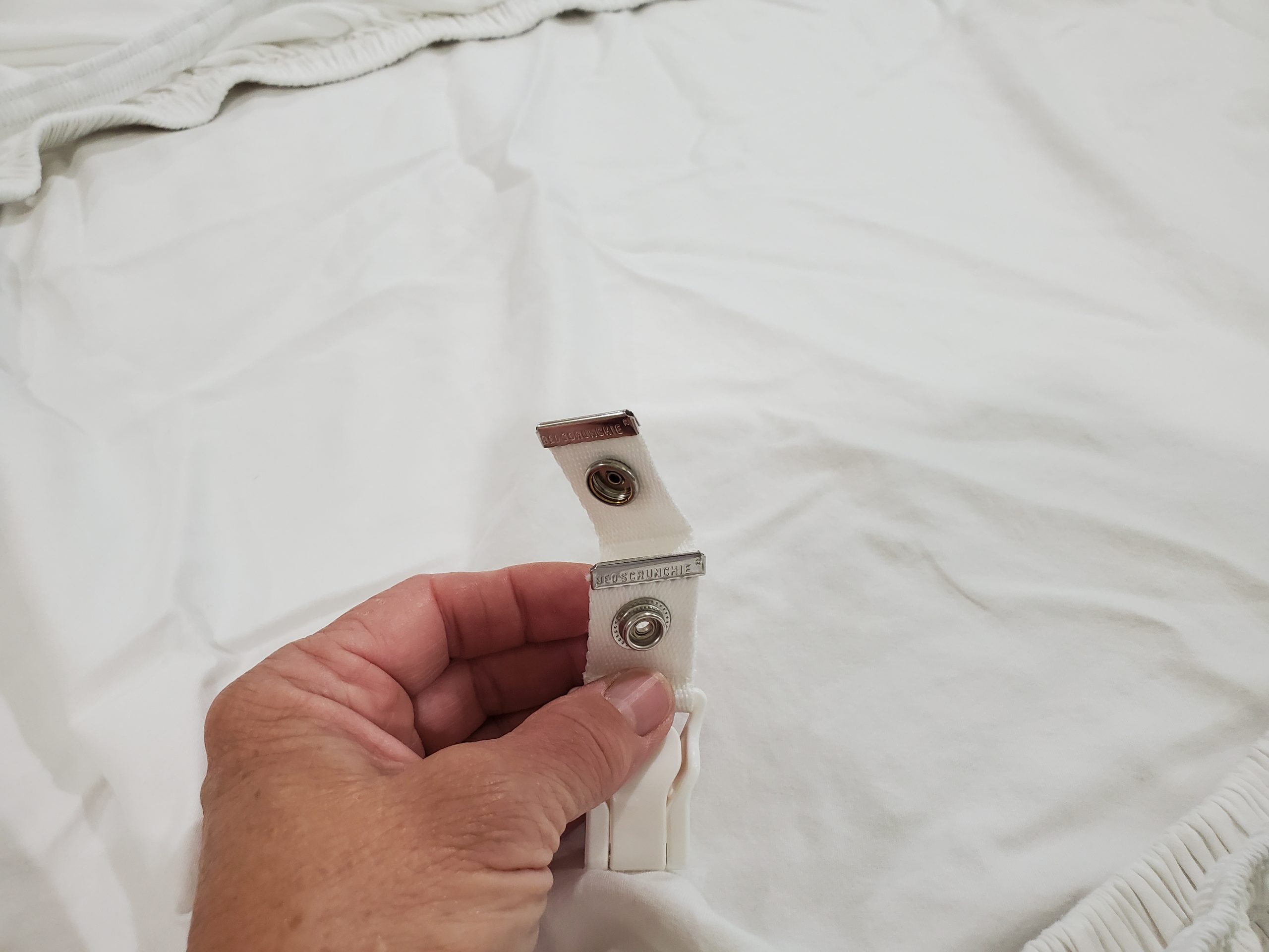 Lay your scrunchie on the fitted sheet and snap on the clips where you want them.