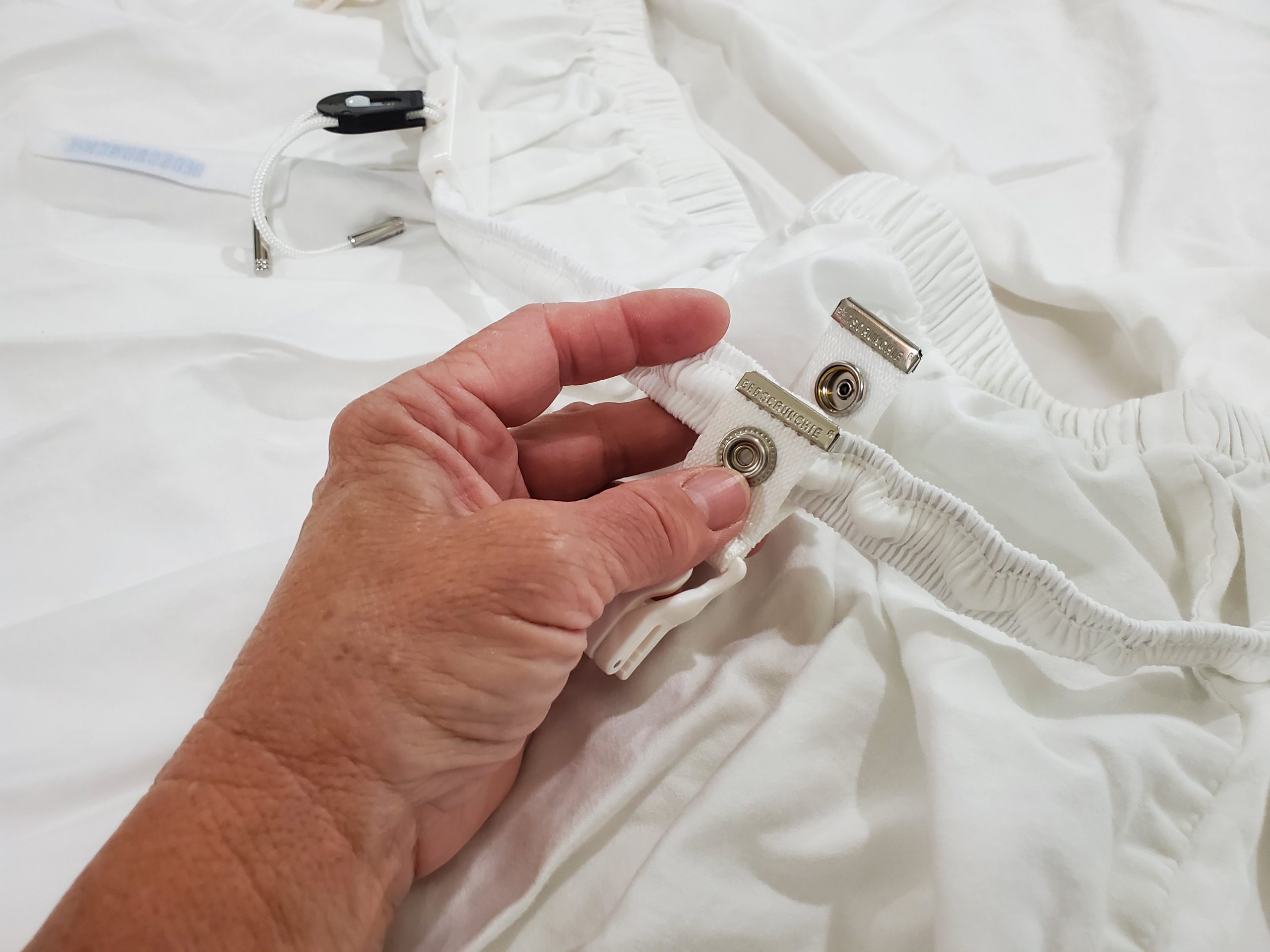 Lay the scrunchie with attached clips on top of the fitted sheet where you want to attach it. I have my drawstring attachment in the center of one end.
