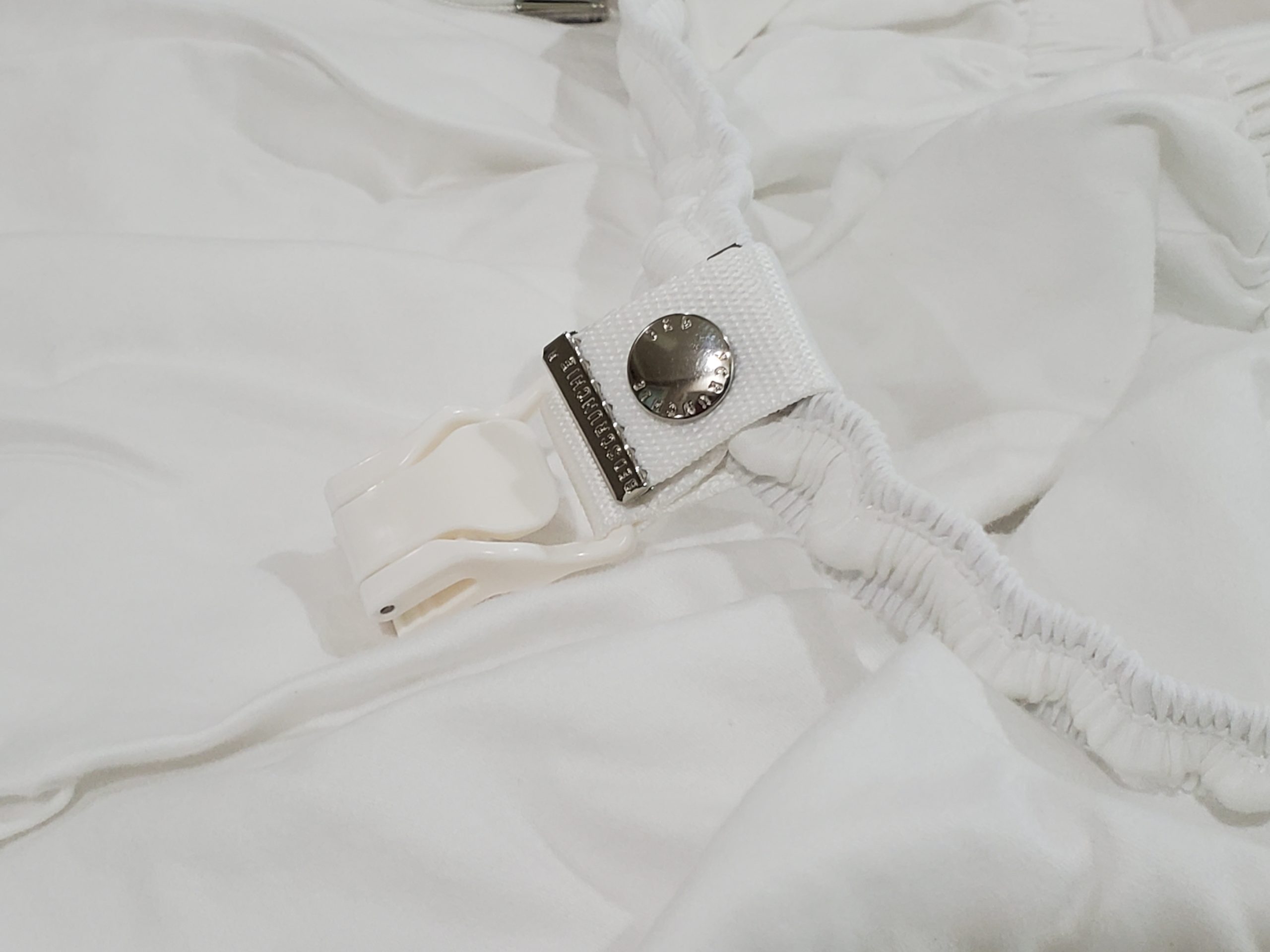 Unlatch the mattress clip and place the elastic edge of the sheet into the unlatched clip, lock back into place.