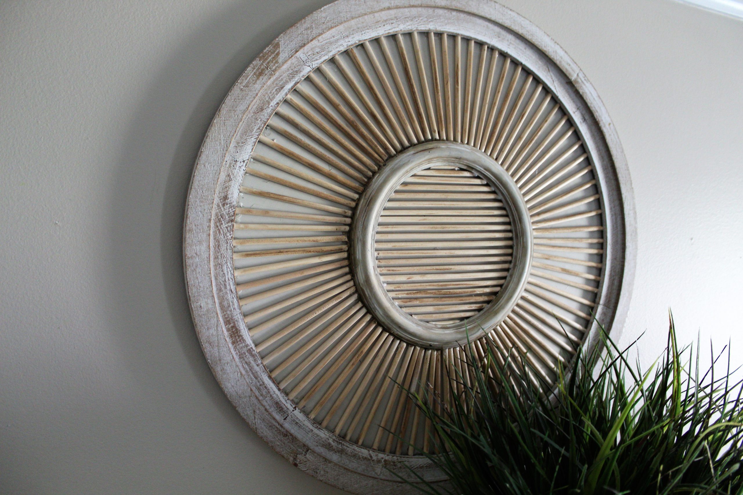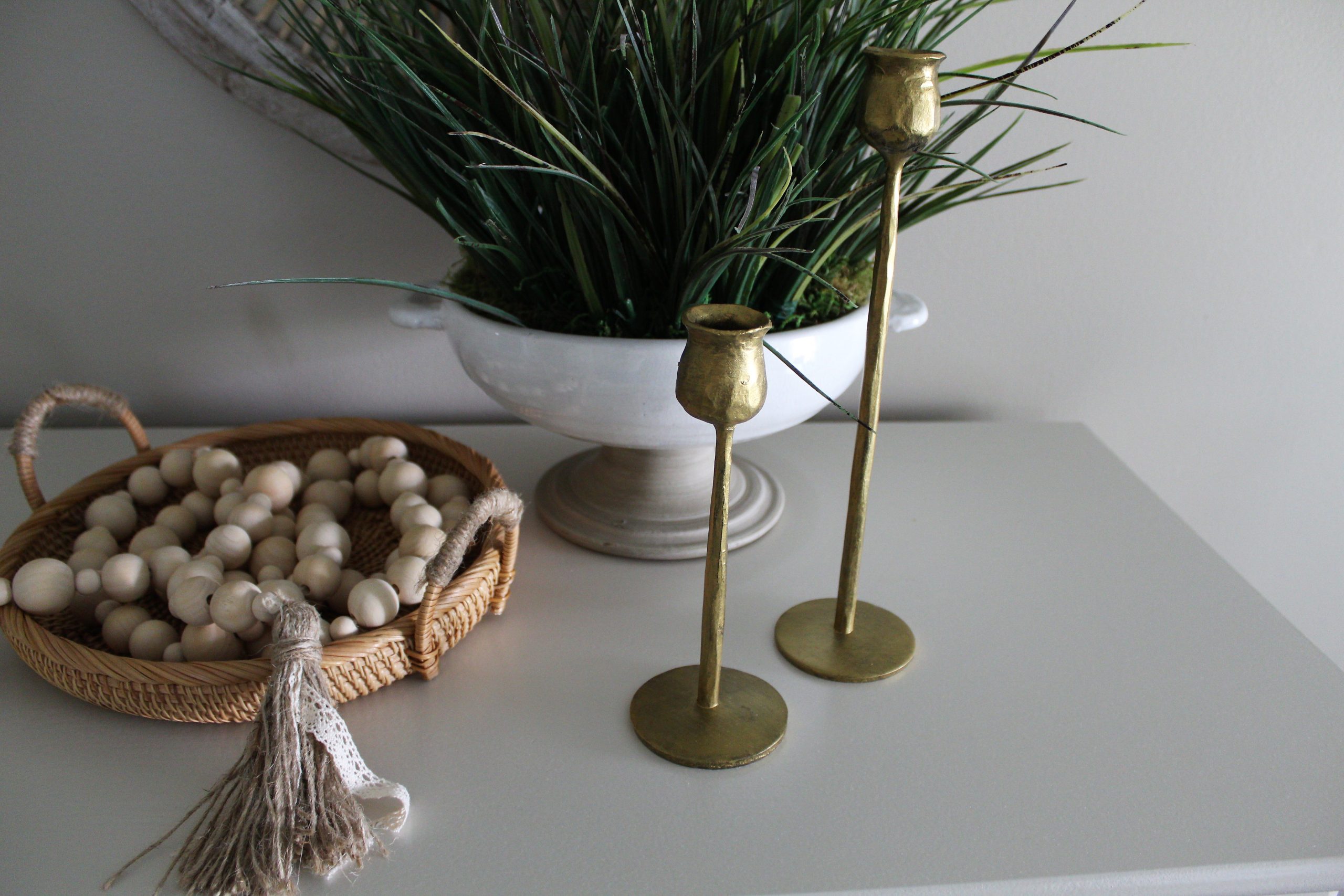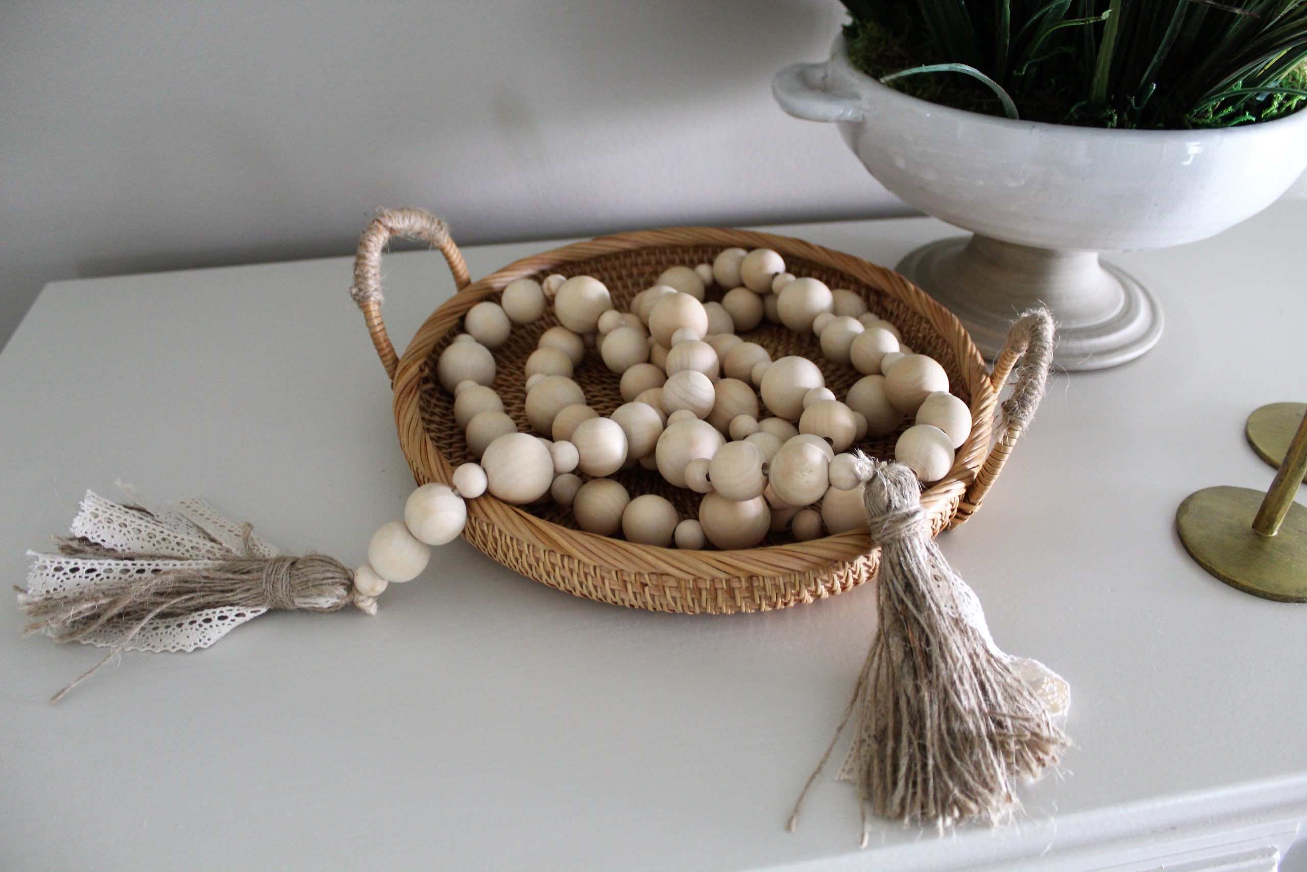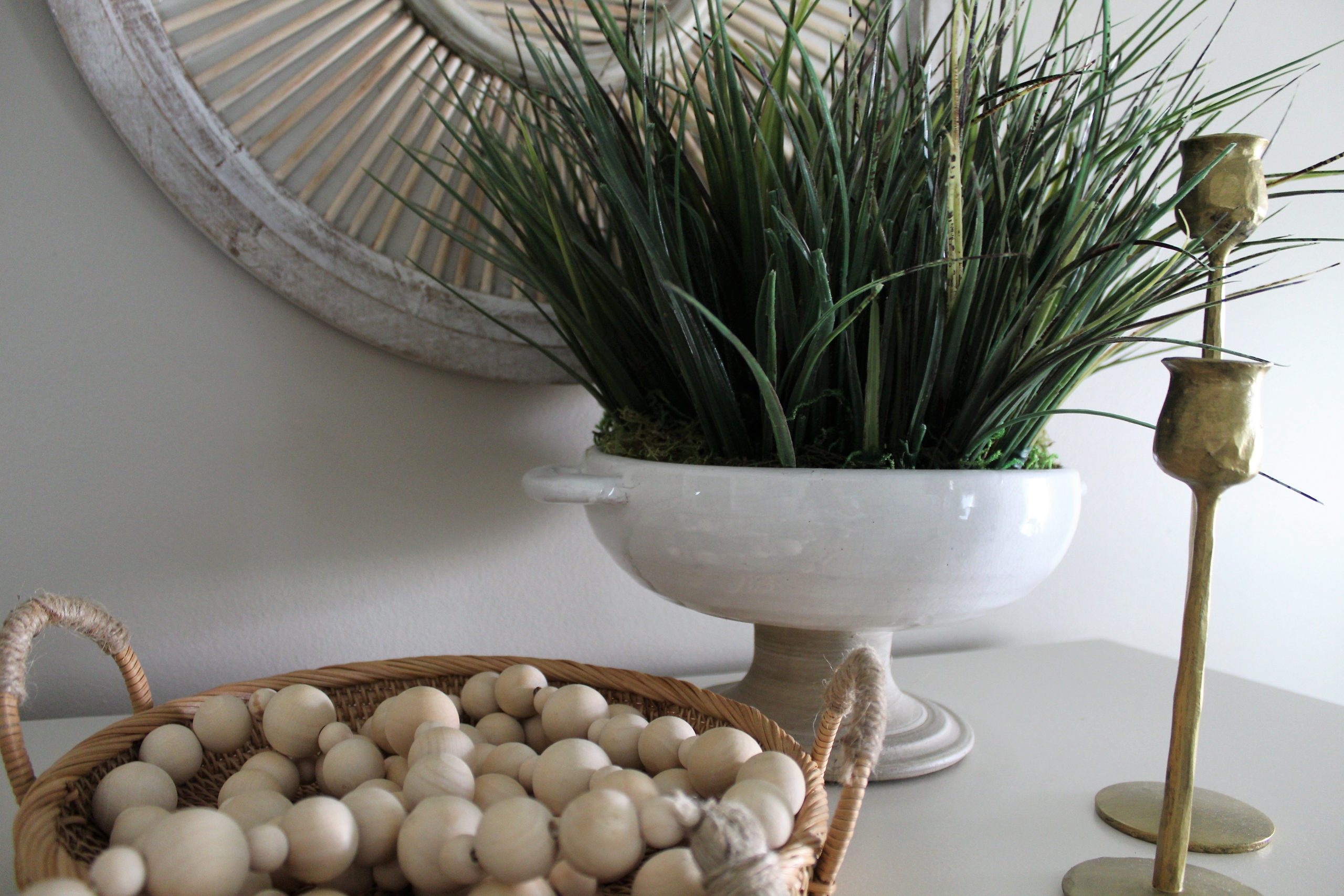 I am keeping the DIY WALL FRAME and the vase with faux grass. I am adding a basket tray and wooden beads along with changing the black candlesticks to gold.