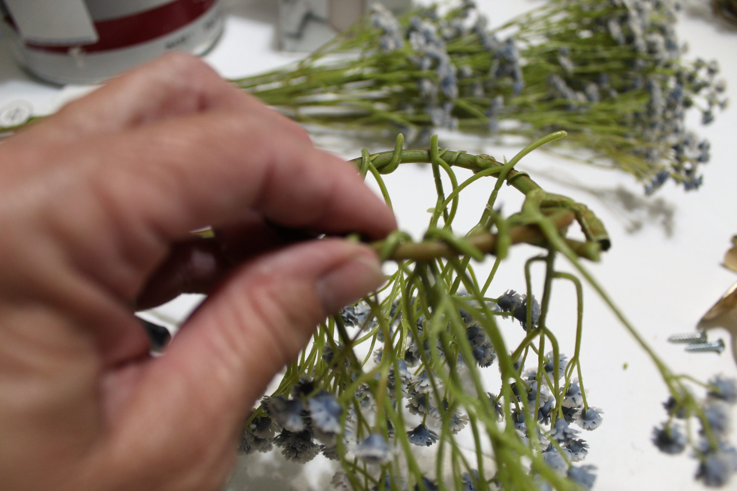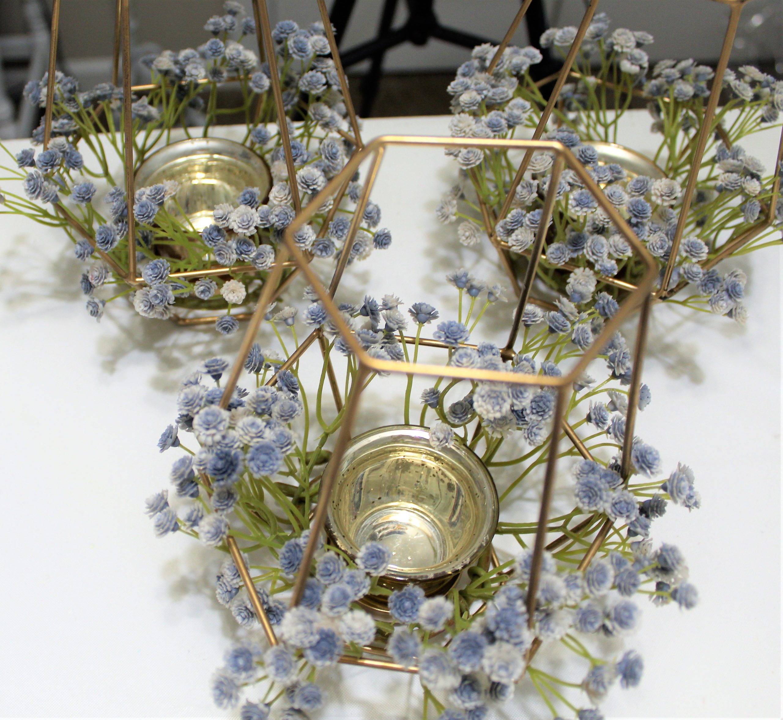 To the top of the shelf, I added three gold wire lanterns. I made little flower wreaths to place inside around the votive cups.