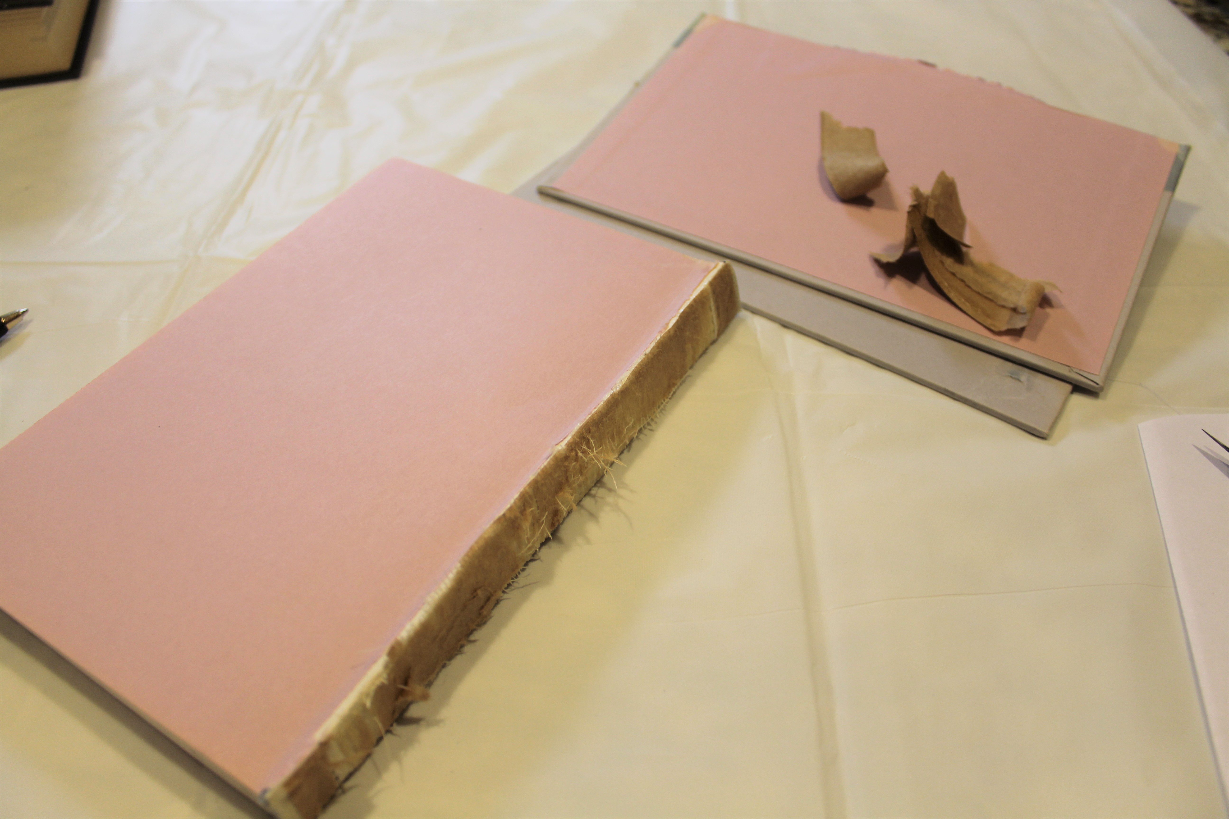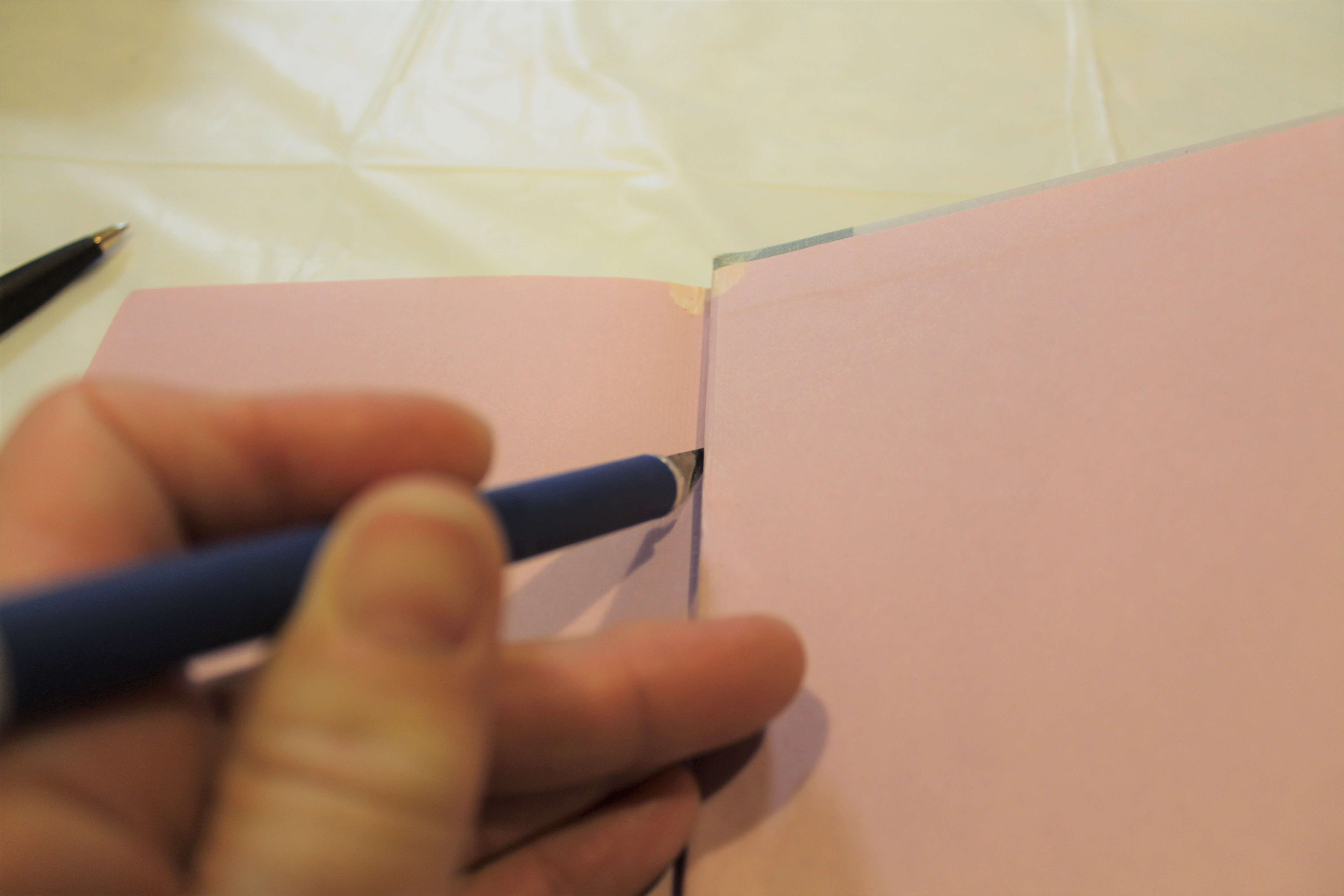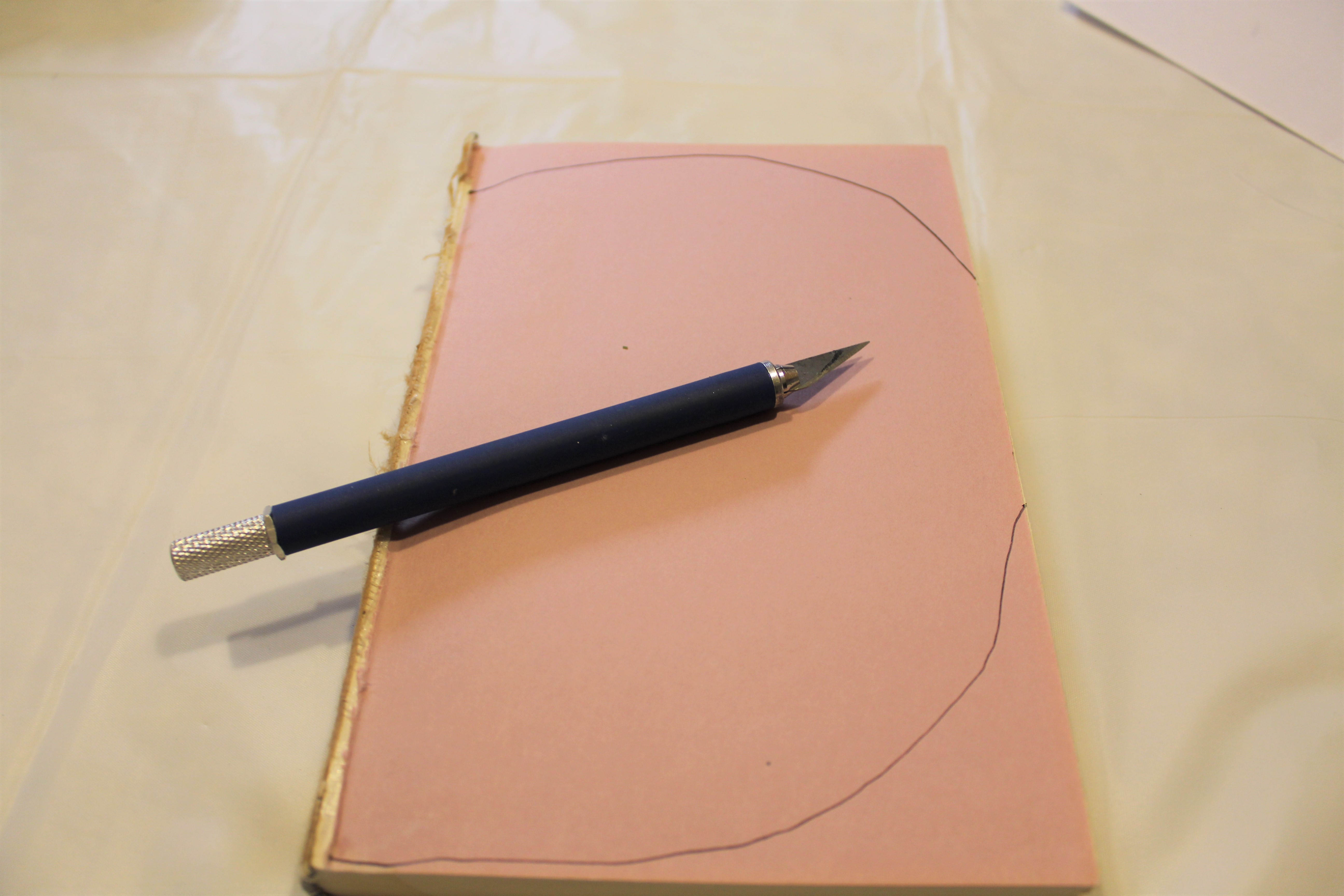 Taking my book and my craft knife cutting the cover off the binder.  If you use soft back books you can just rip off the cover.
