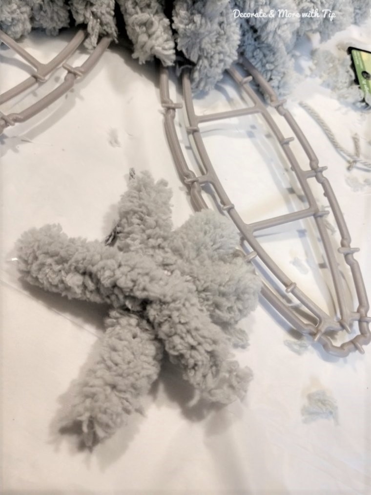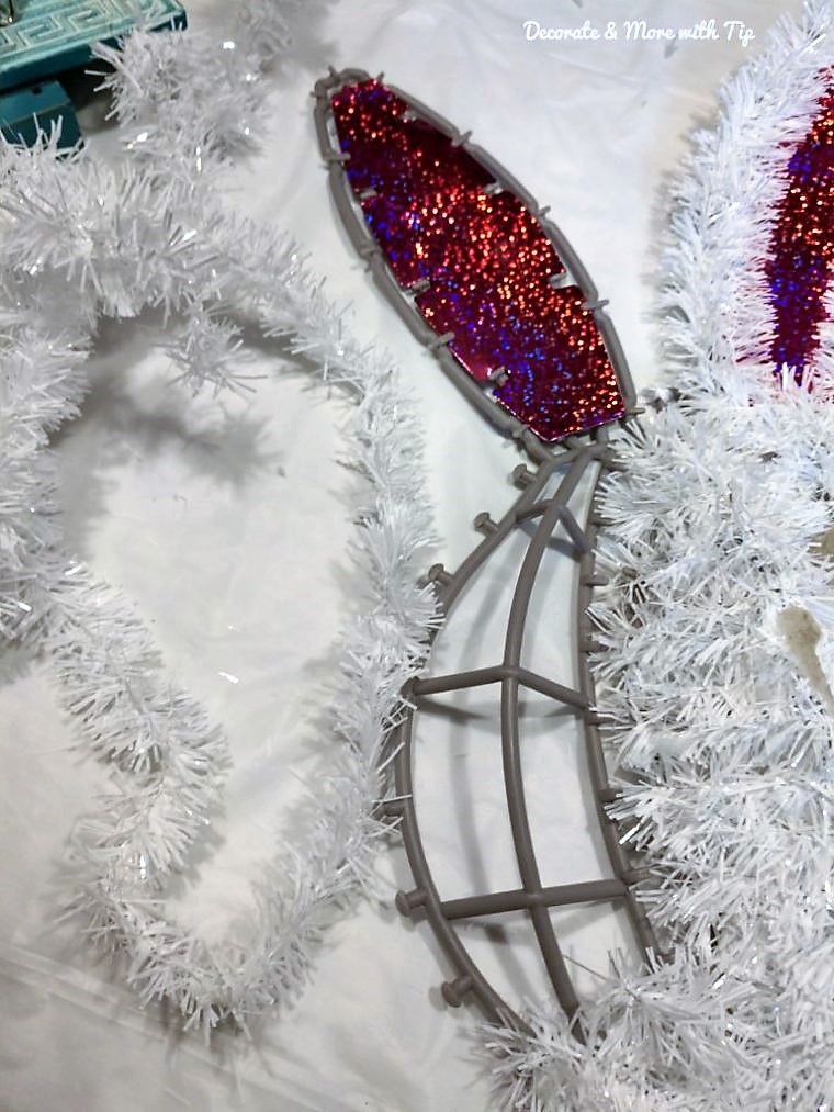 First step is to take the tinsel rabbit and remove all the garland.  It’s really easy to remove.  Just snip a place and start unraveling.  Remove the ear pieces.