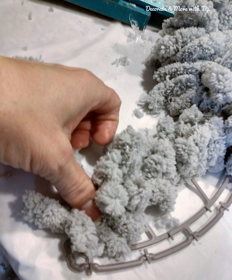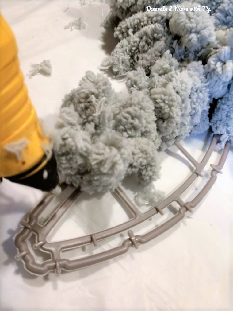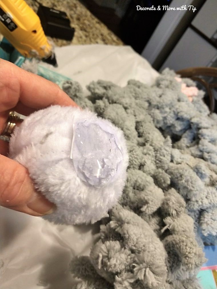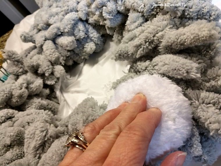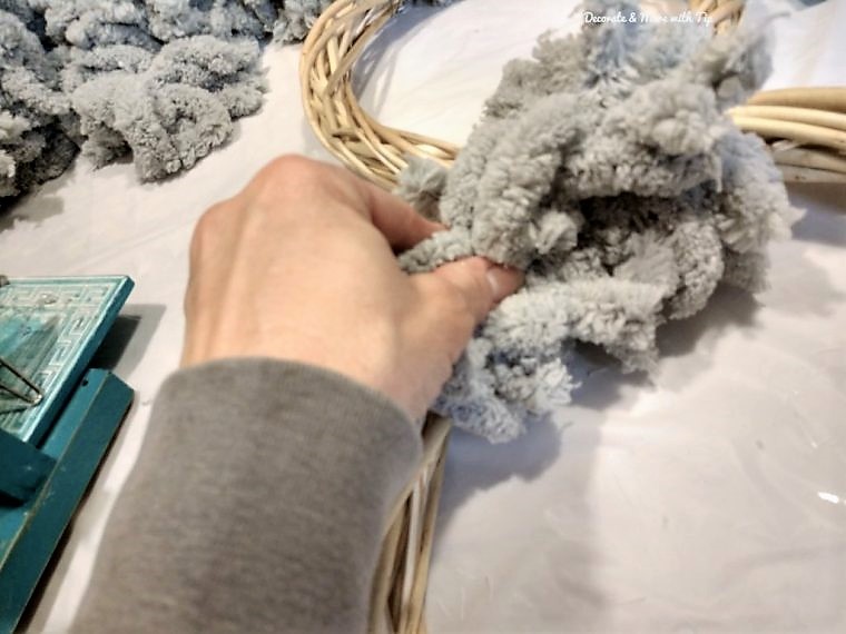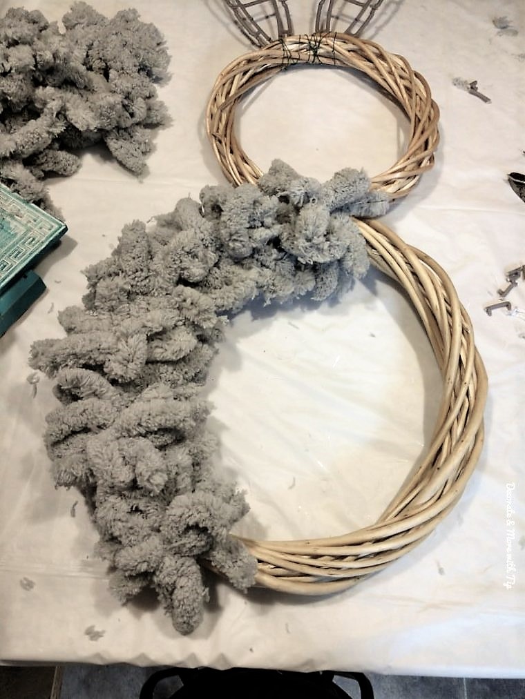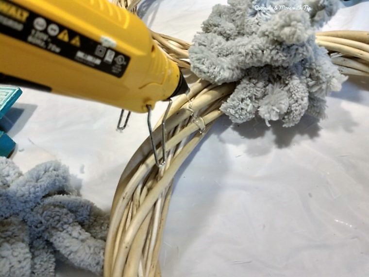 Start hot gluing the poms to the front of the two willow wreaths.  I started with the body and worked my way up to the head.