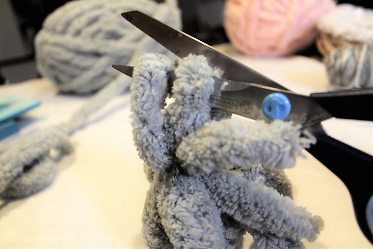 • cut and bundle the yarn together.  Tie it with a piece of your scrap yarn and cut the loops.  Making 24 smaller poms.