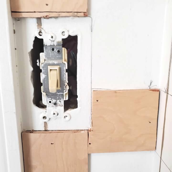 I am pretty sure this is not the proper way to cut around the light switches, but it worked for me. I drew a line around the plate, measured and cut the boards to fit.