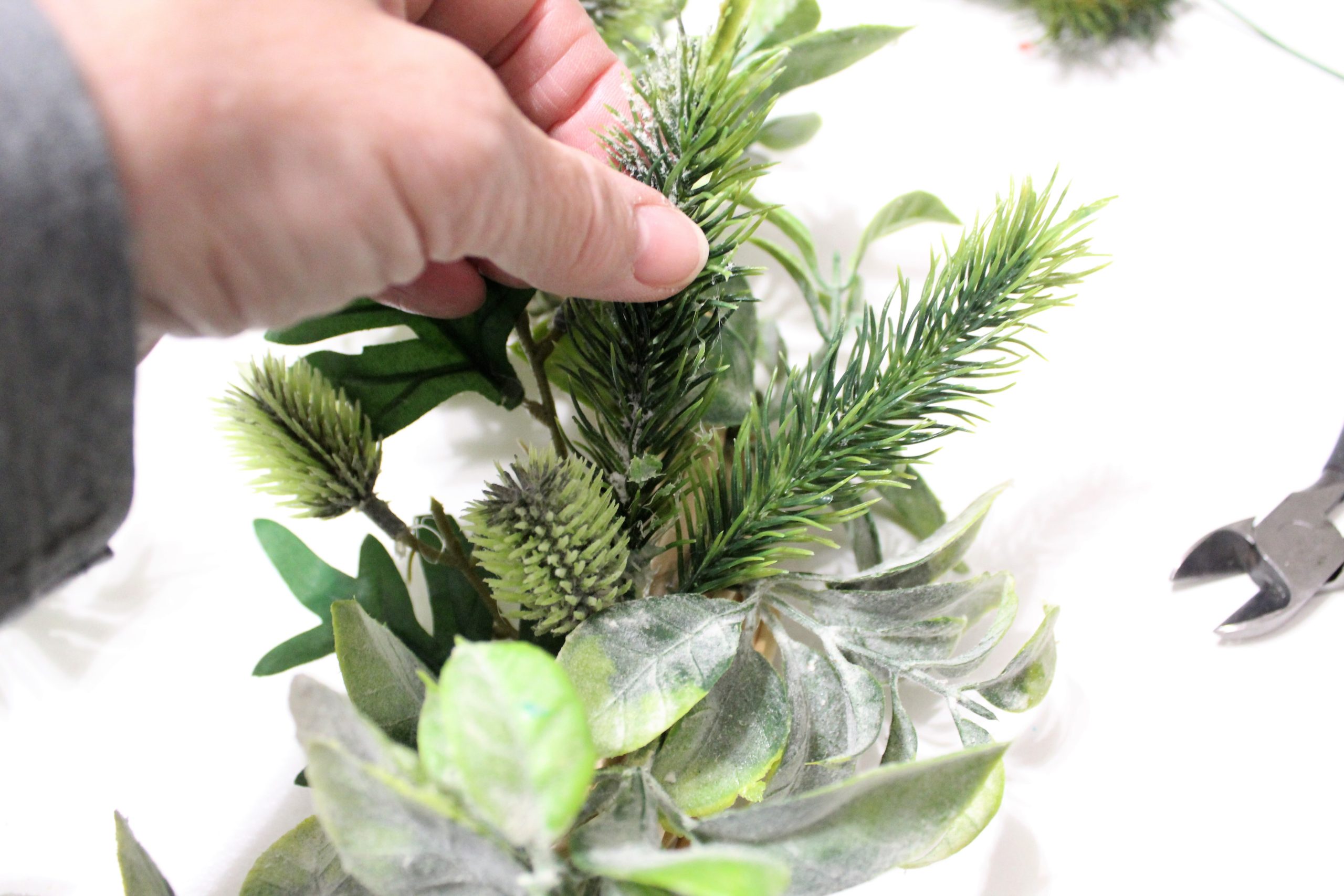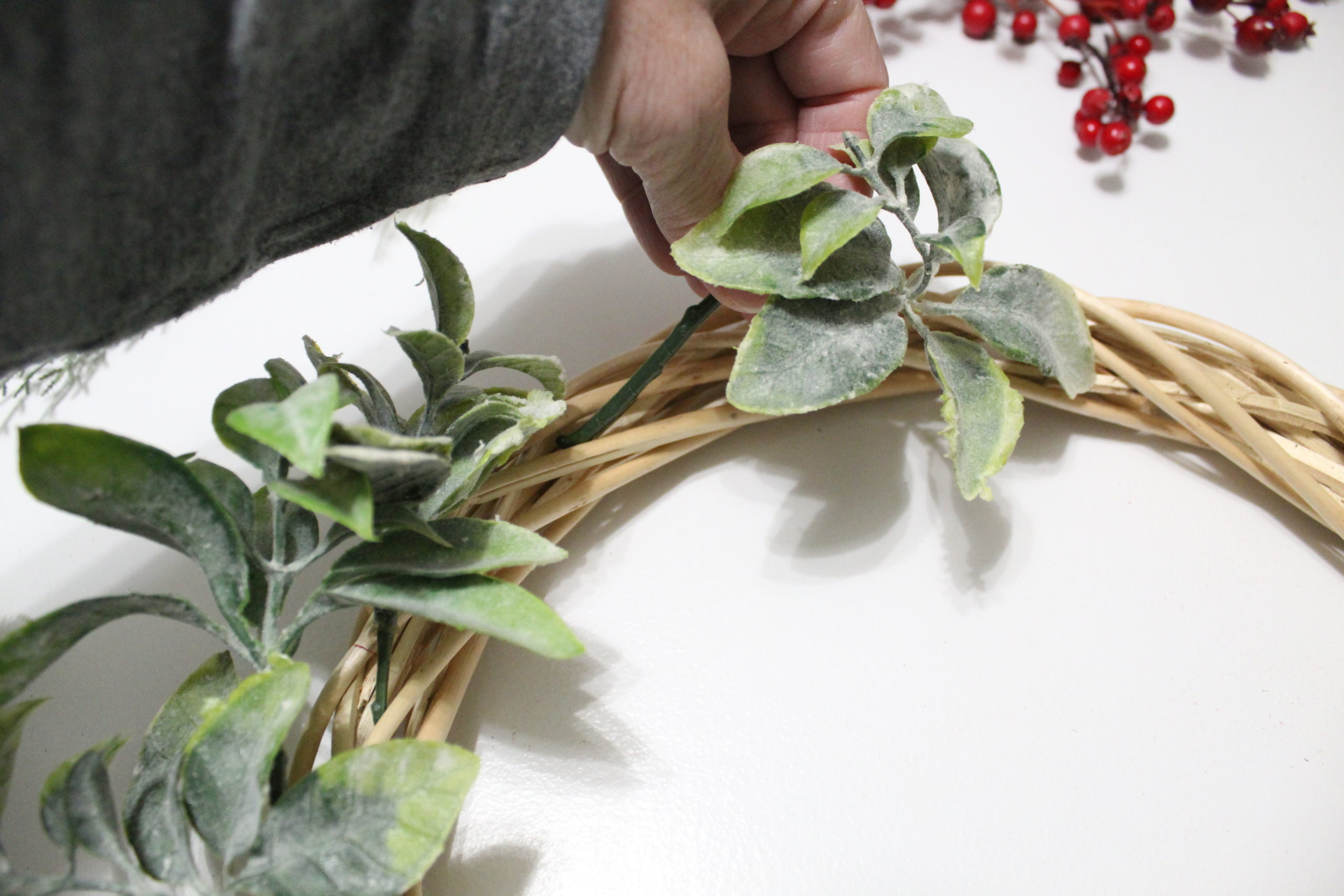 To fill the wreath with greenery I first poked the flocked greenery stem into the wreath.