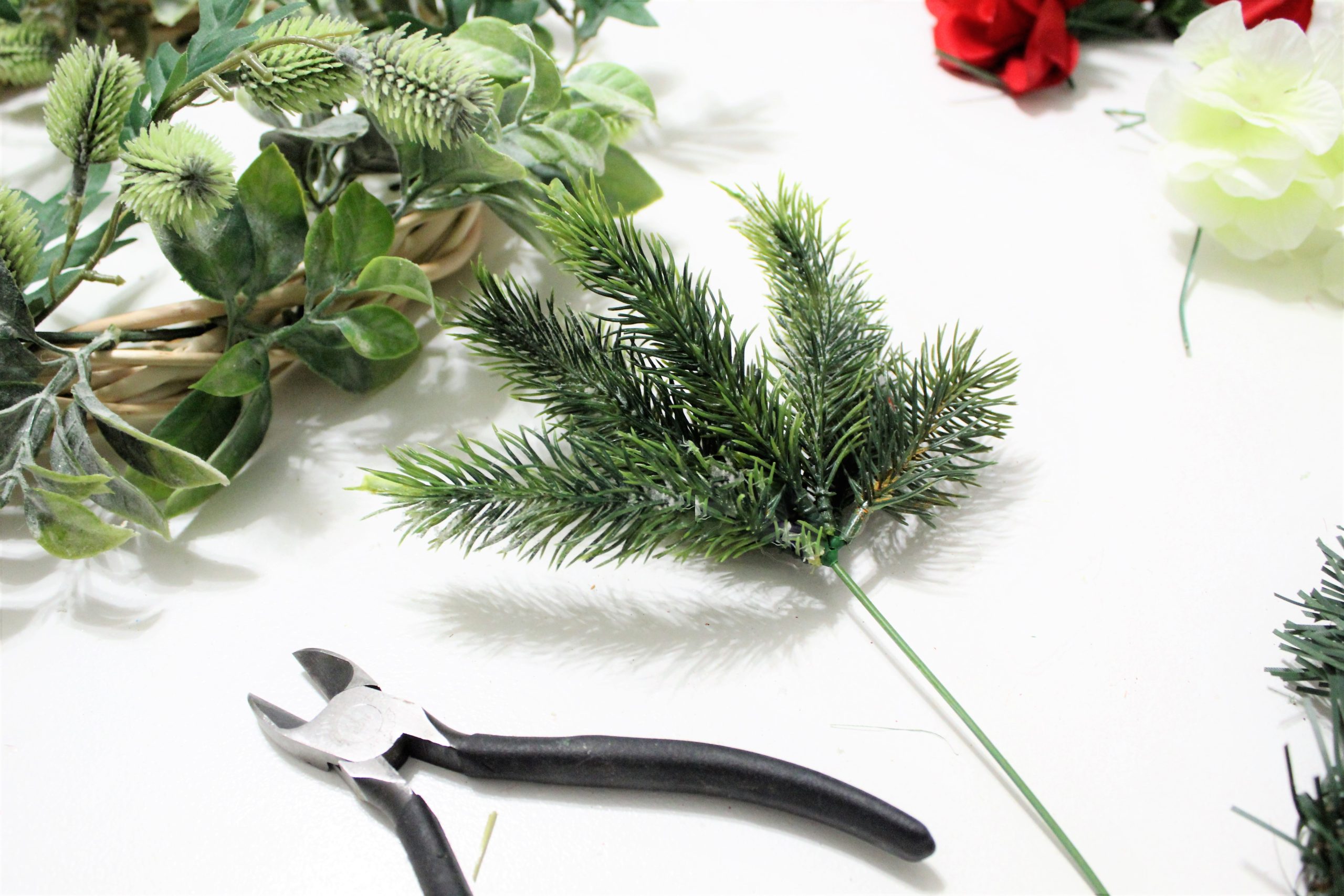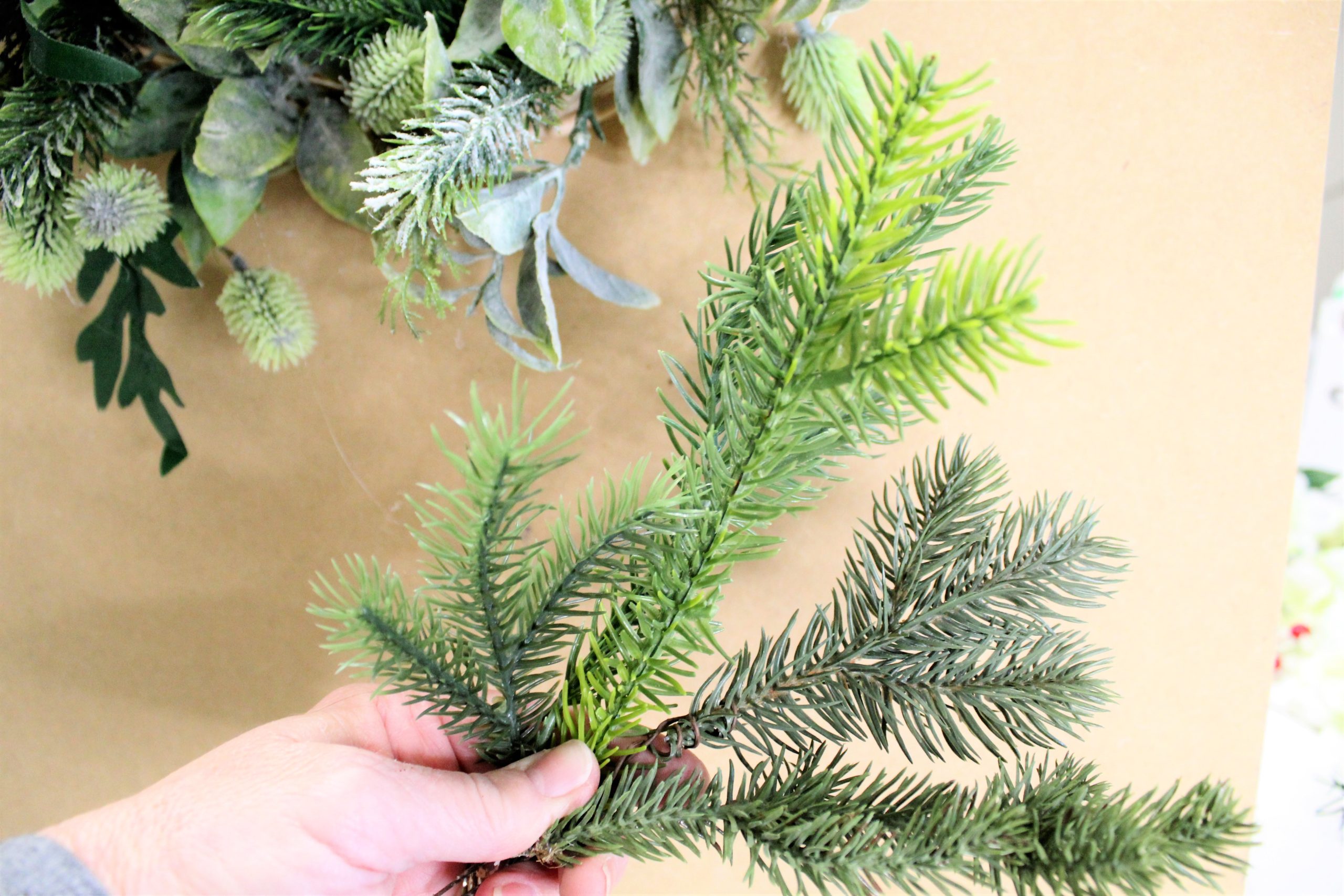 To fill in the gaps with more greenery, the picks I used were an evergreen pick and cypress pick. Removing it off the stem and gluing it on the wreath form.