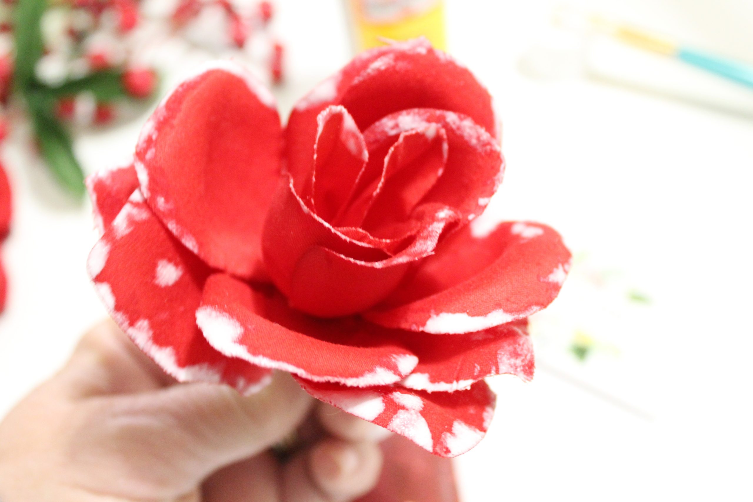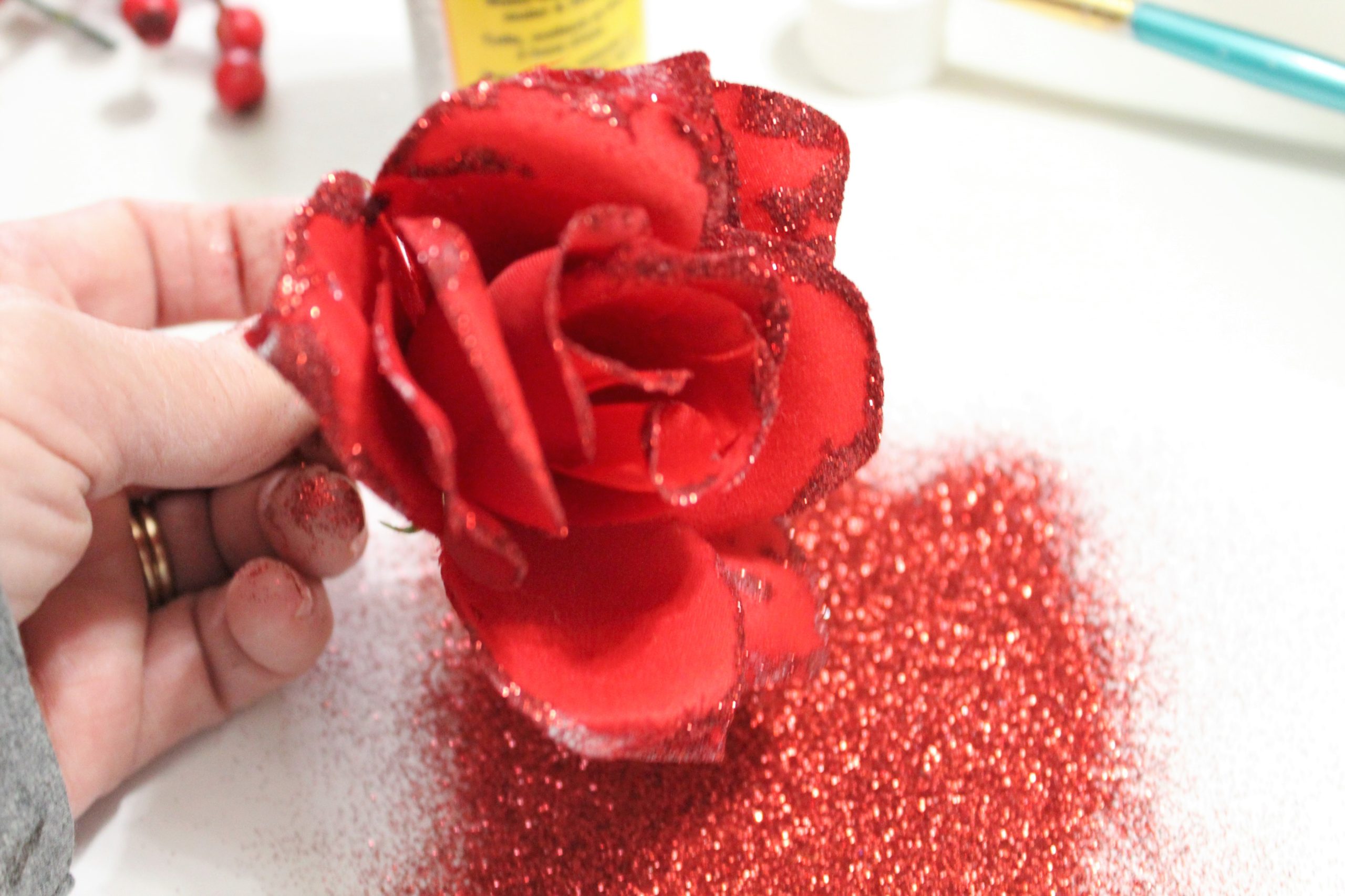 That’s definitely not the look I want for my wreath. I pulled the roses off the wreath and grabbed my red glitter to add to the tips of the petals.