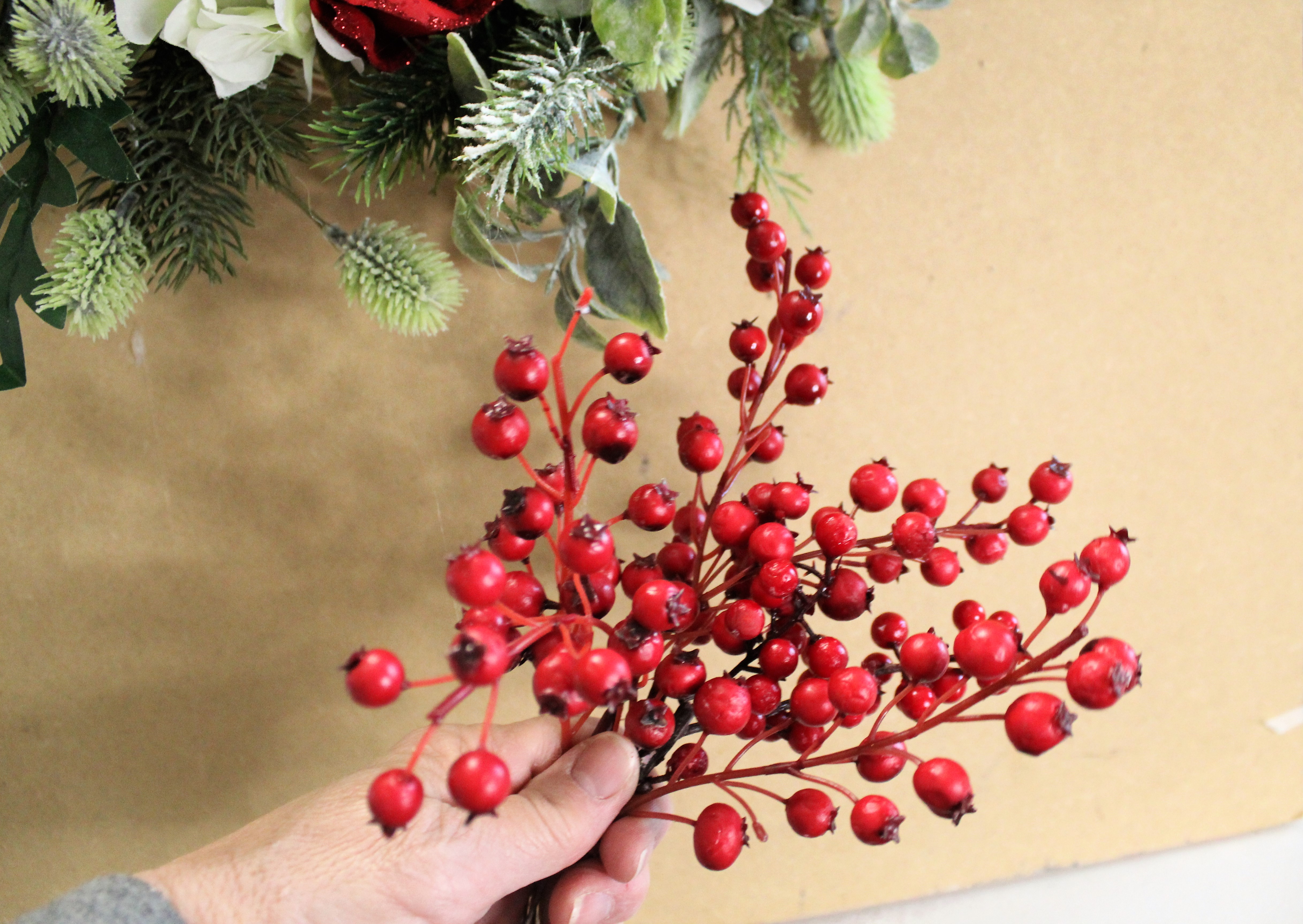 Next, I added some berries to the wreath. I had bits and pieces from left over projects, hot gluing them to the wreath in random places.