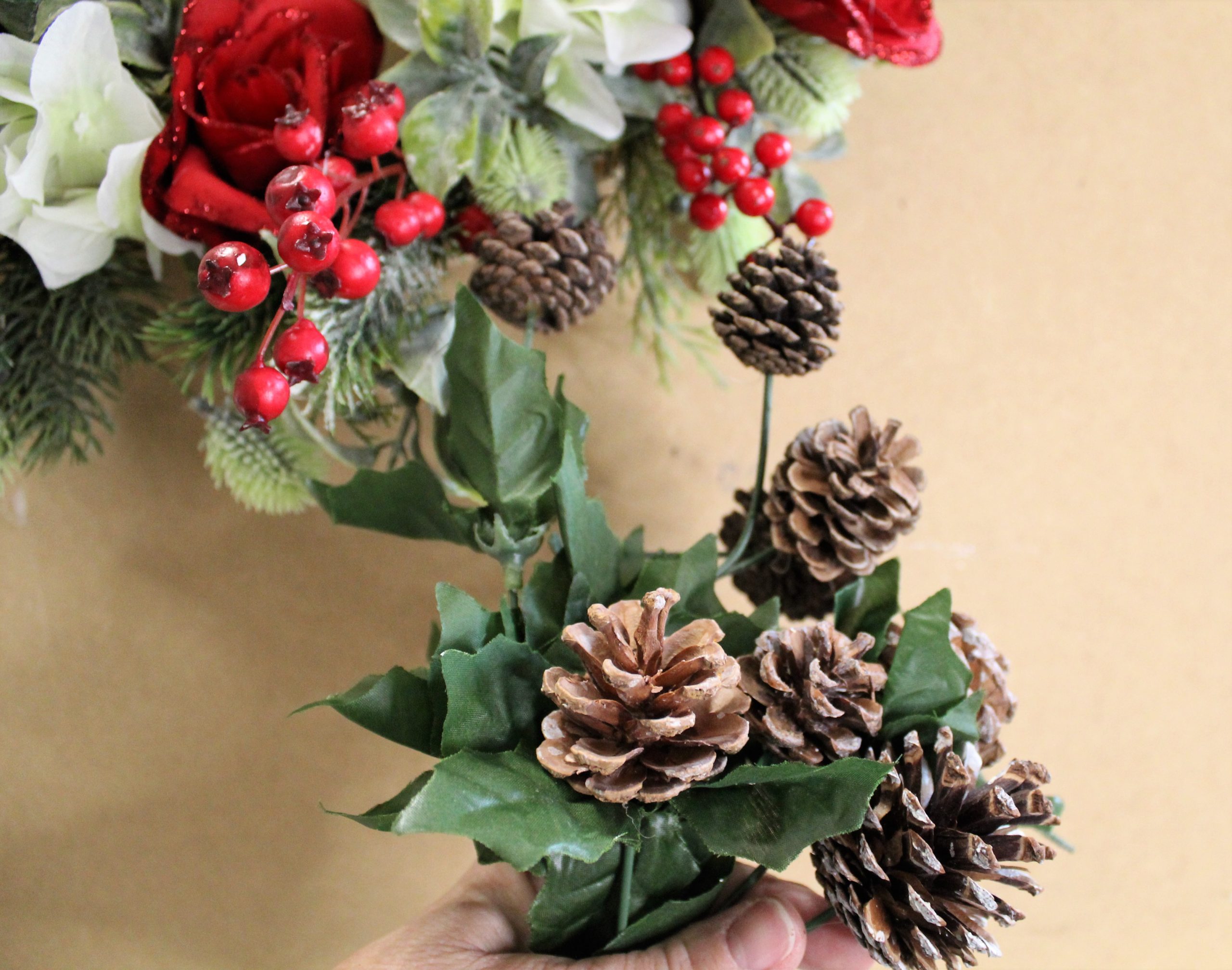 I had some pinecones left on the bundle, I cut the pinecones off the stem and hot glued them onto the wreath.