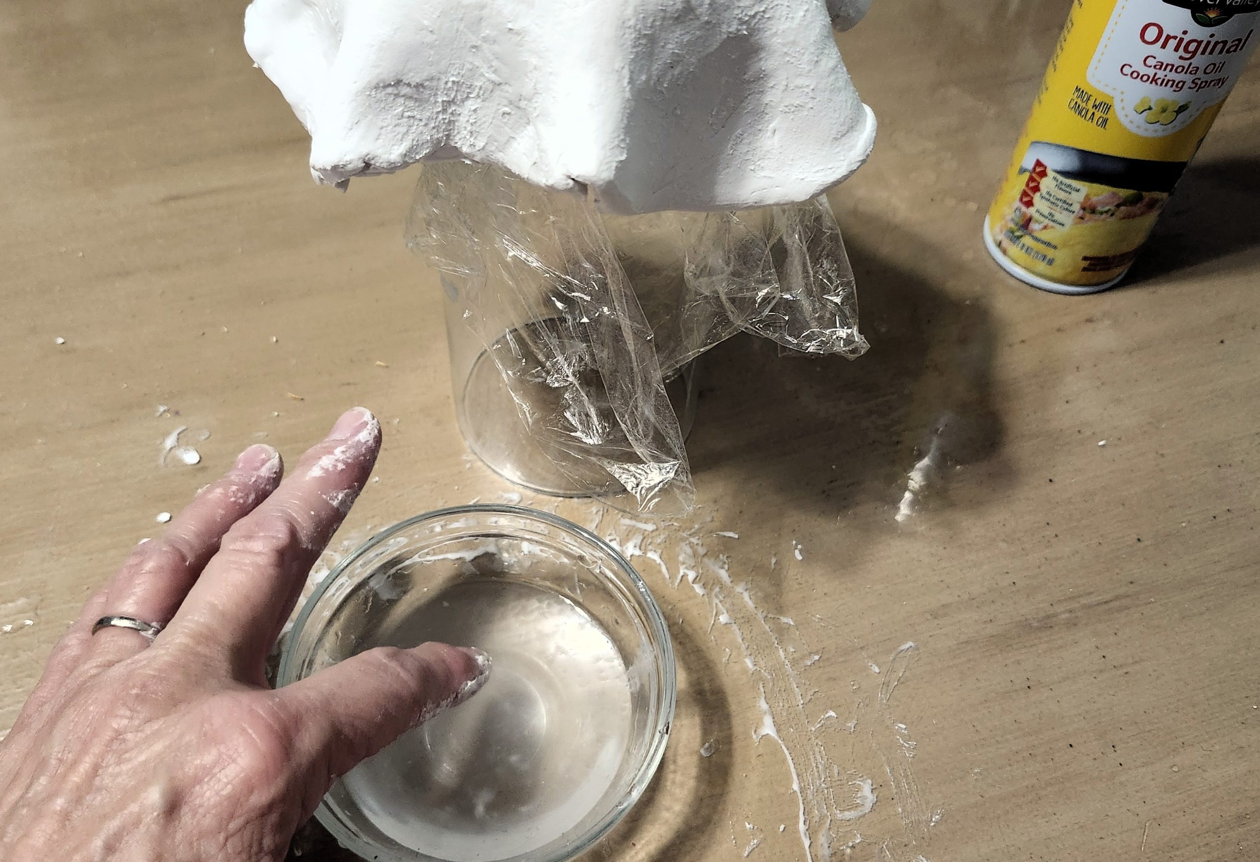 Step Four:  Take a piece of saran wrap or waxed paper sprayed with oil to the container.