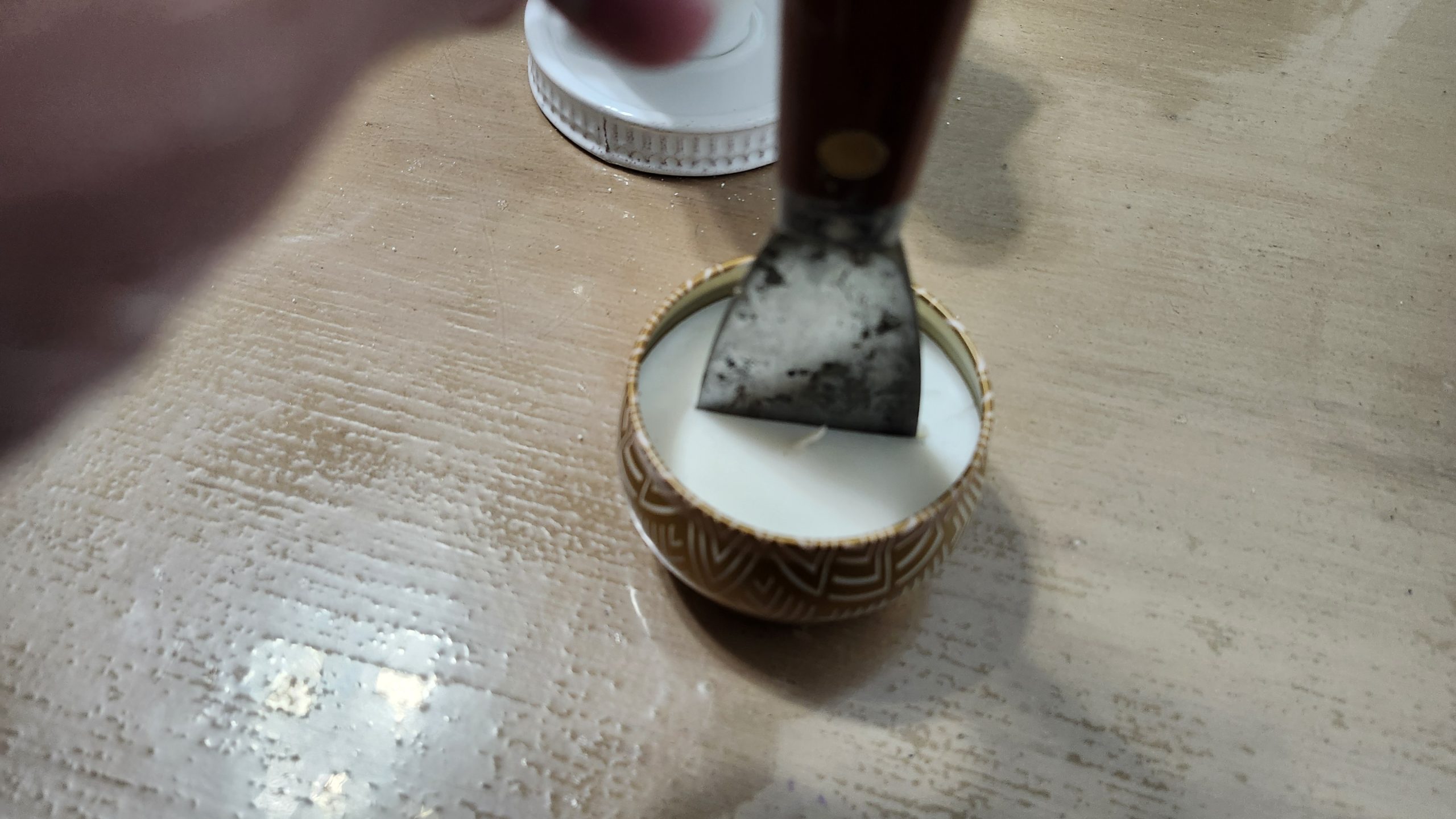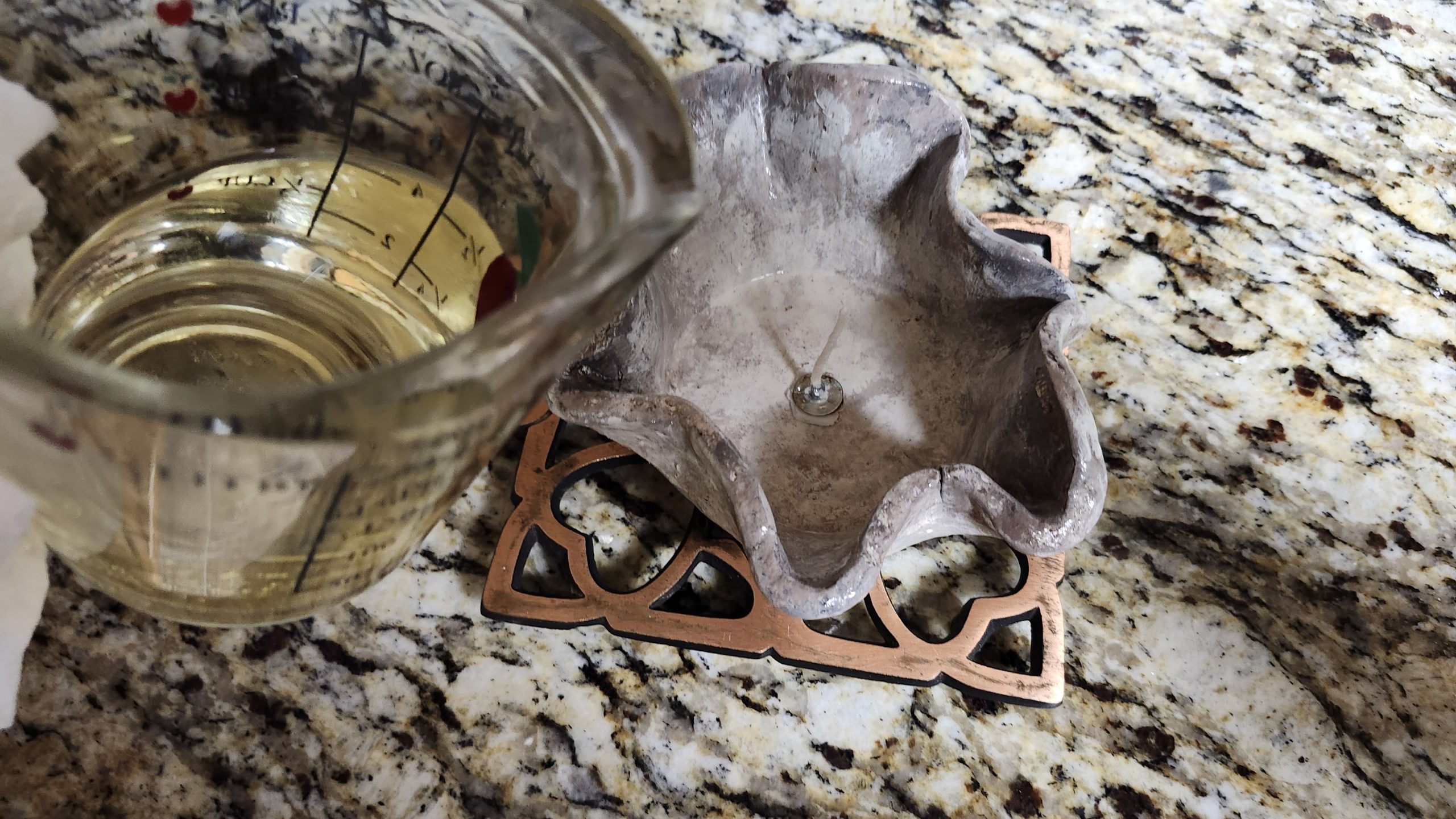 I used the wick from the candle.  Gluing the wick in the center of the bowl.