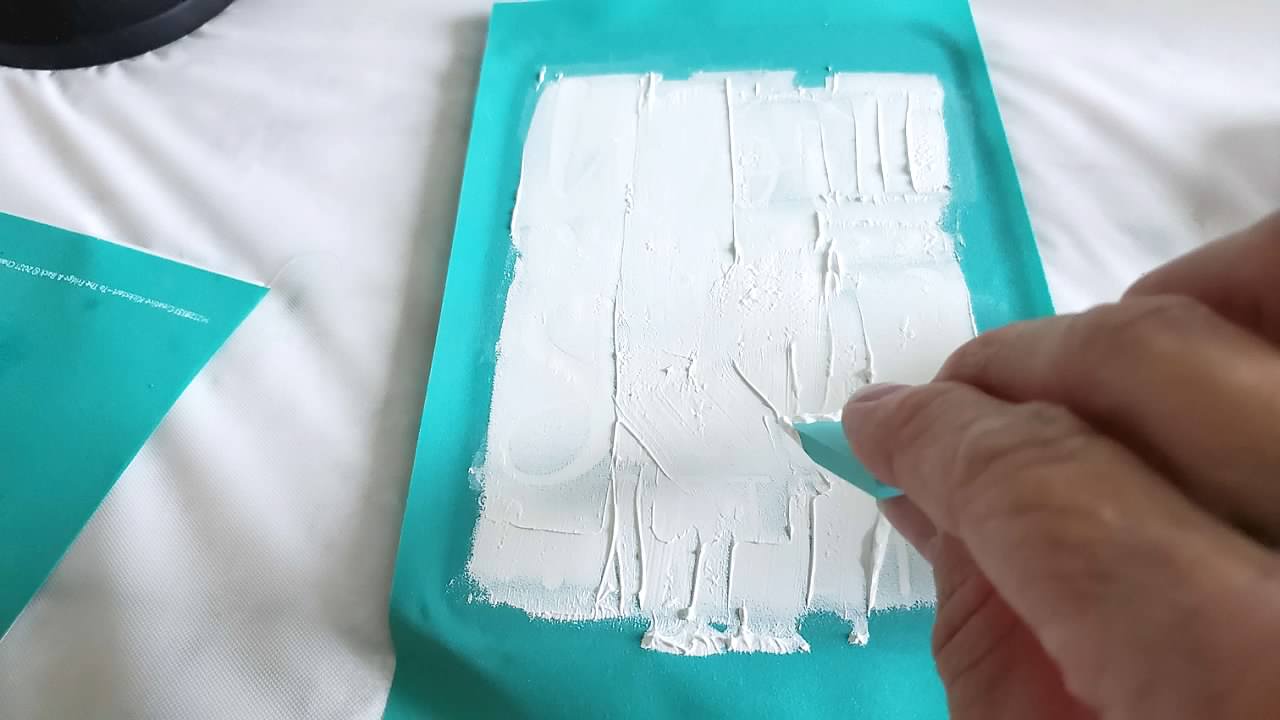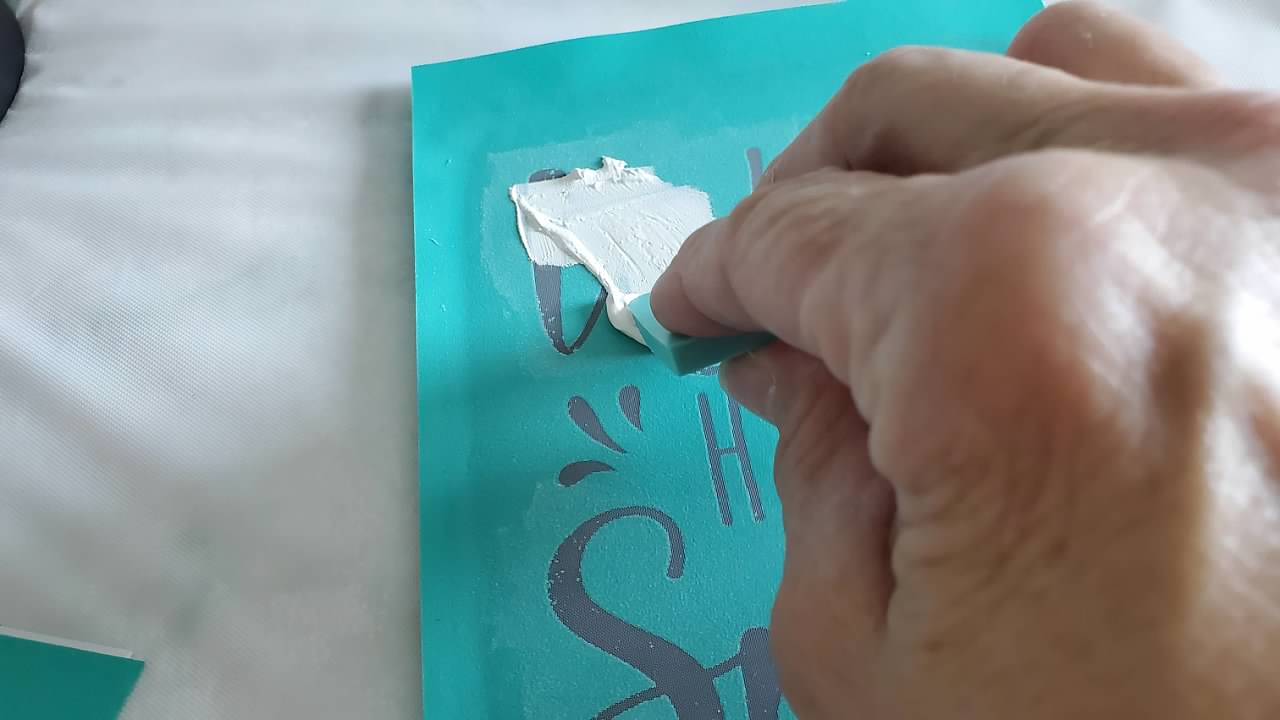 With the squeegee, scrap off any excess paste from the transfer. Making sure there is no clumps or lines of paint.