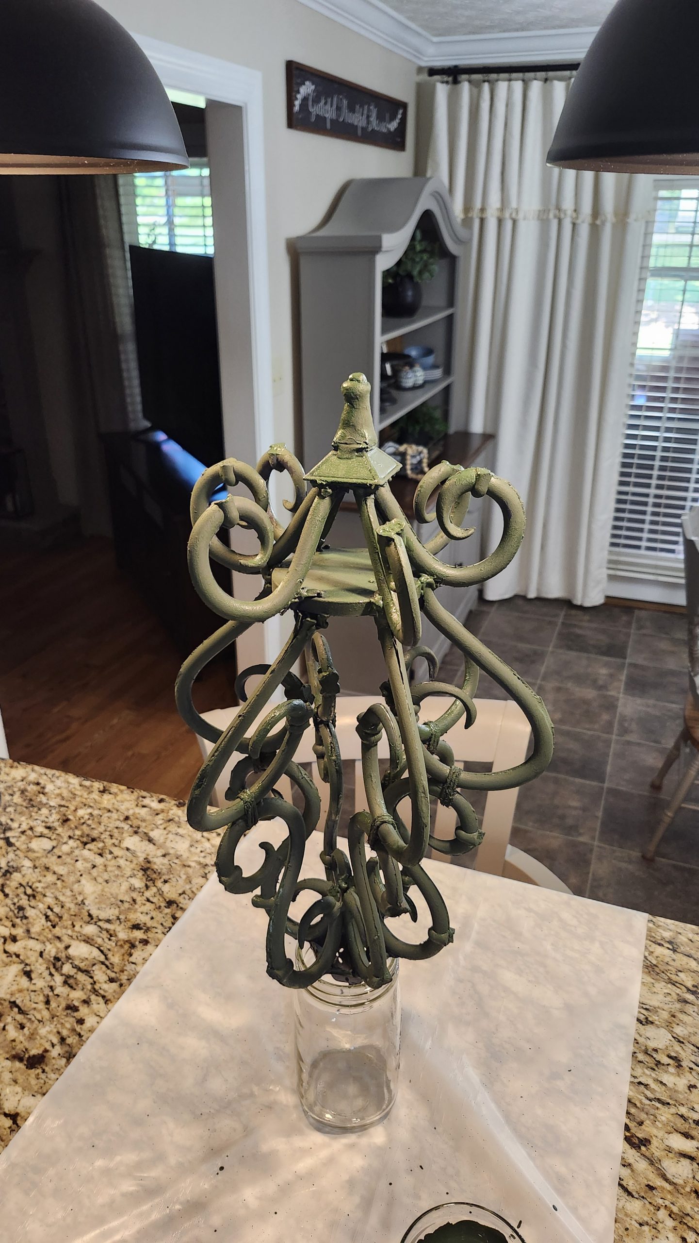I placed it upside down in a jar to get the underneath part of the lantern first.  Once dry I turned it right side up and finished painting.