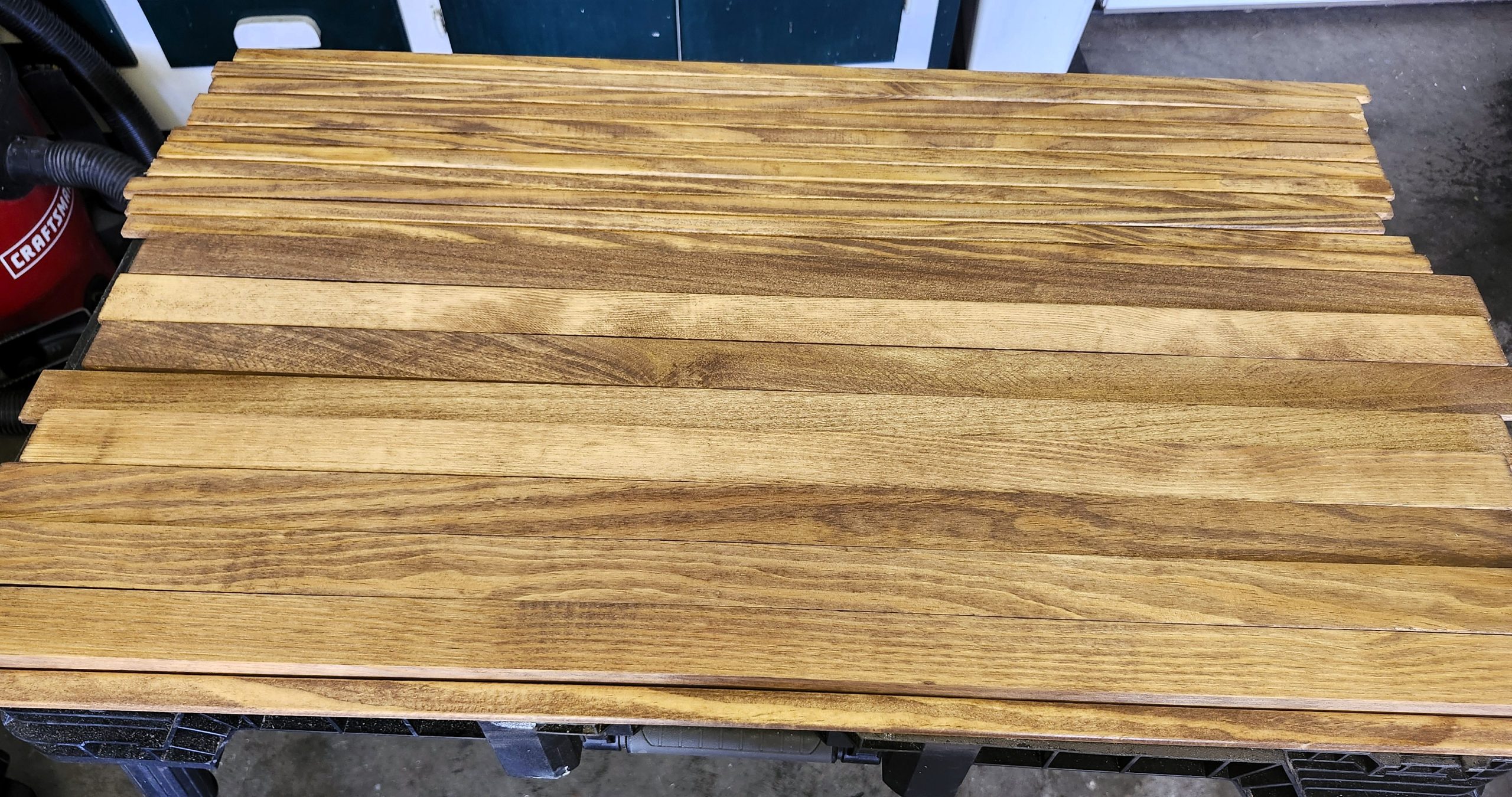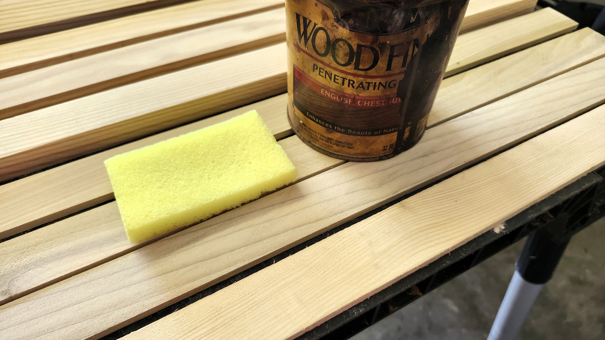 Stain the shelf pieces, the nine crossbars and the four 2 in. x 3 ft.  I used English Chestnut stain applying it on with a sponge and wiping it off with a soft cloth.