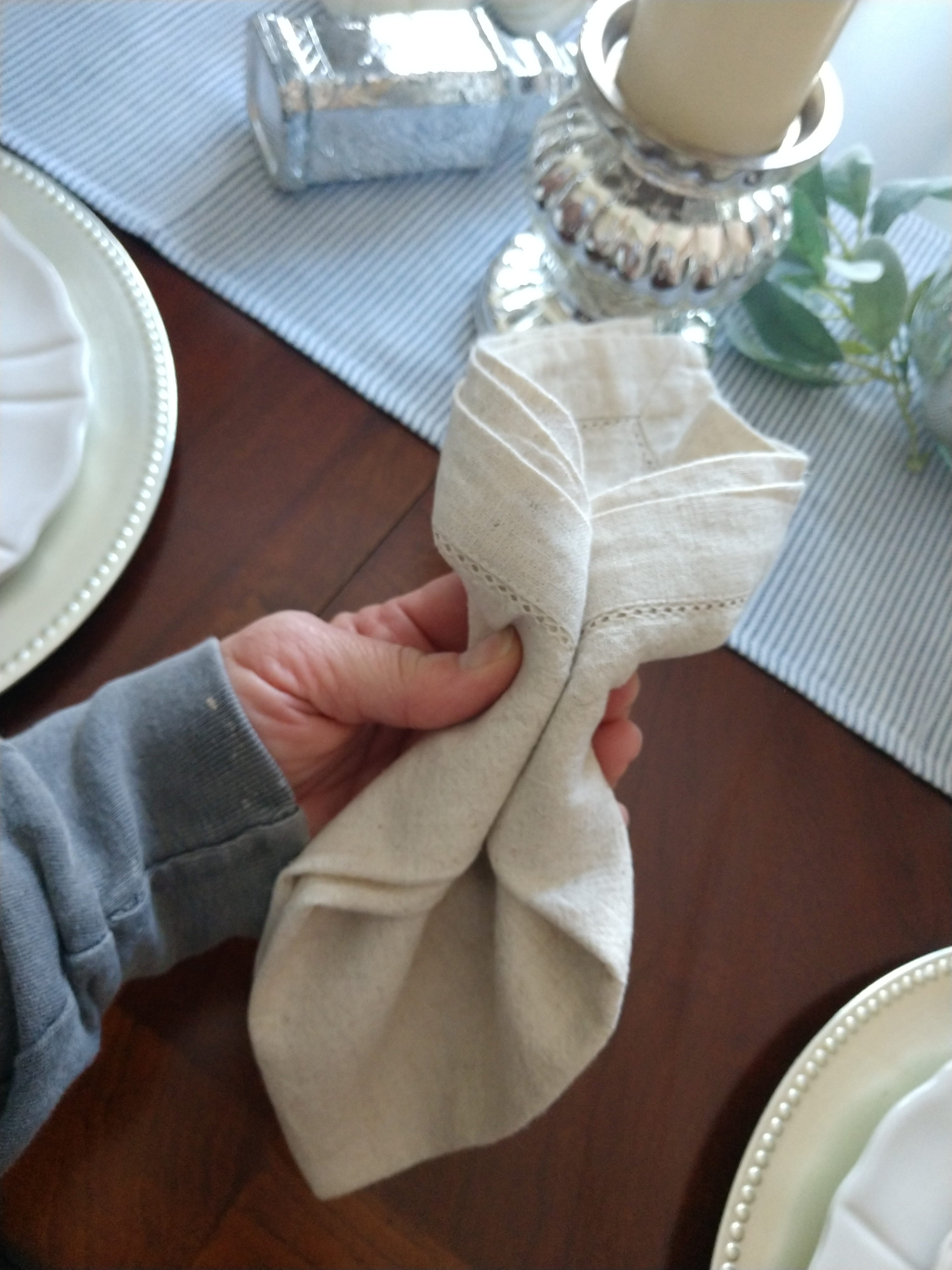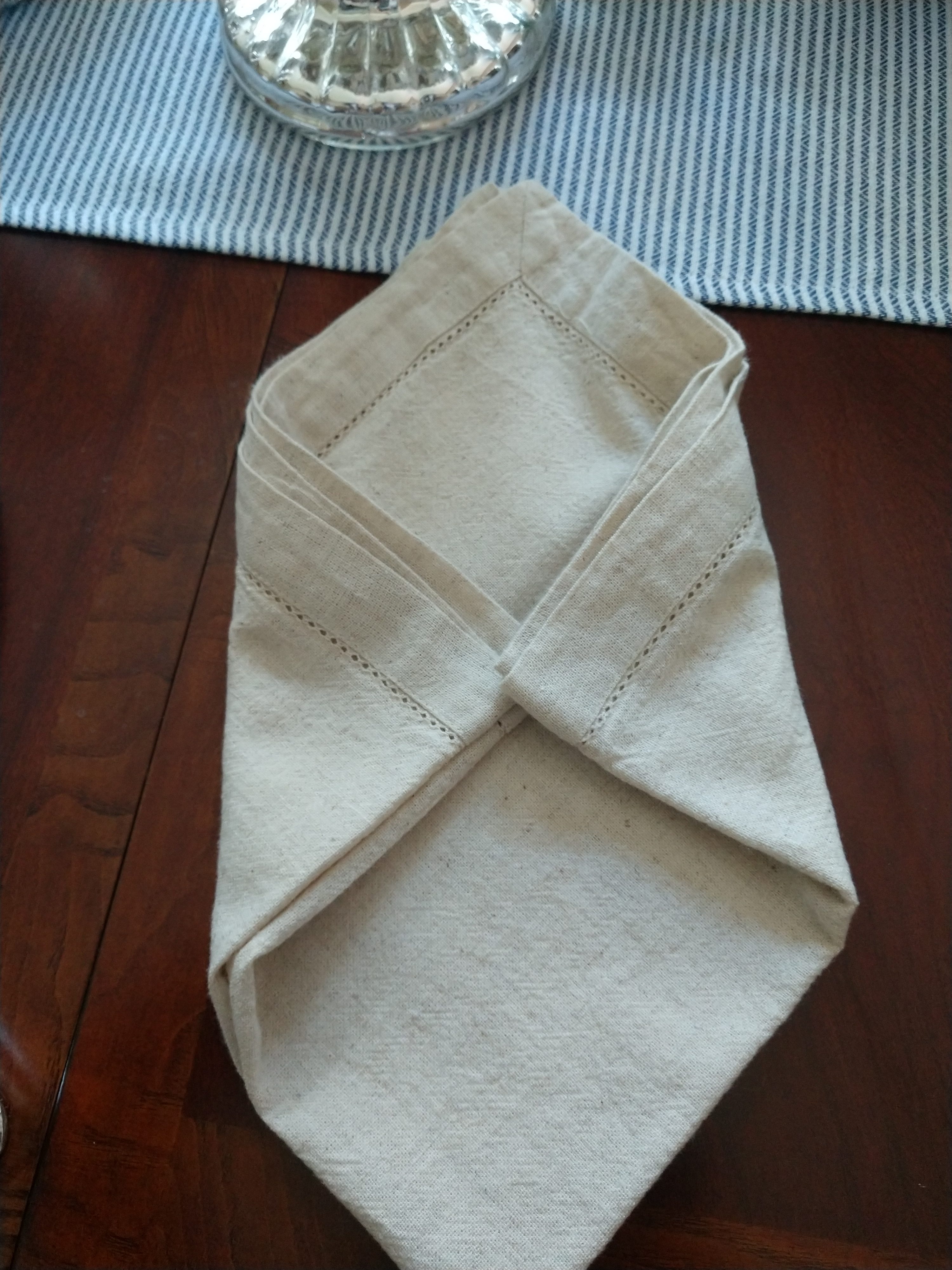 - Folding the napkin into a small square; folding the napkin in half and then folding it in half again