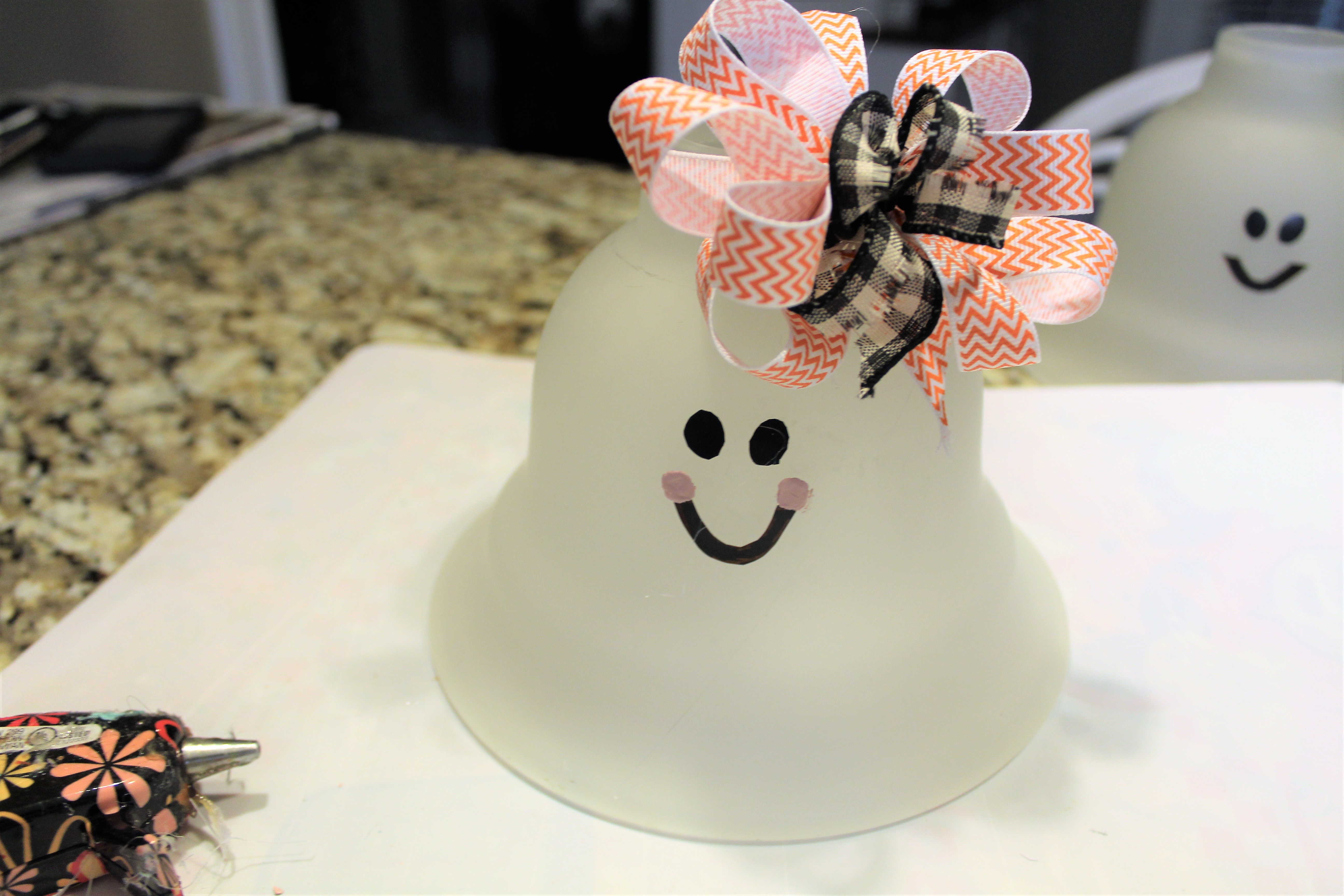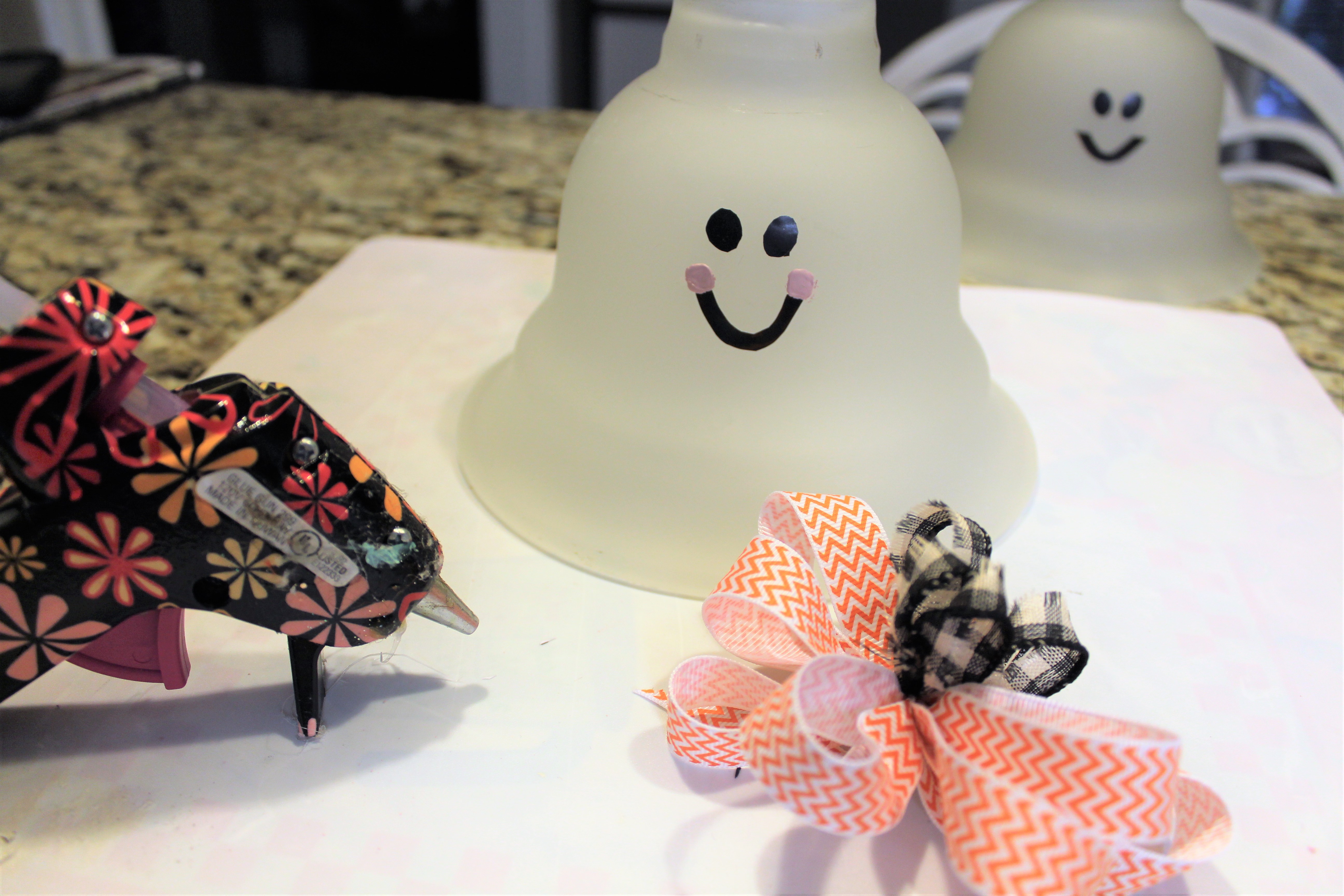 Going into a thrift store or going to a yard sale you normally will find light globes for ceiling fans or vanity globes for a few bucks. I am going to give you a reason to go hunt for them. 🙂 I had 4 globes sitting up in our attic from my daughter’s ceiling fan we removed several months ago. I am going to use items that can be easily removed so if we ever want to sell or use the fan the globes are ready to be used again. I will show you step by step how easy it is to make these cute little ghost globes.