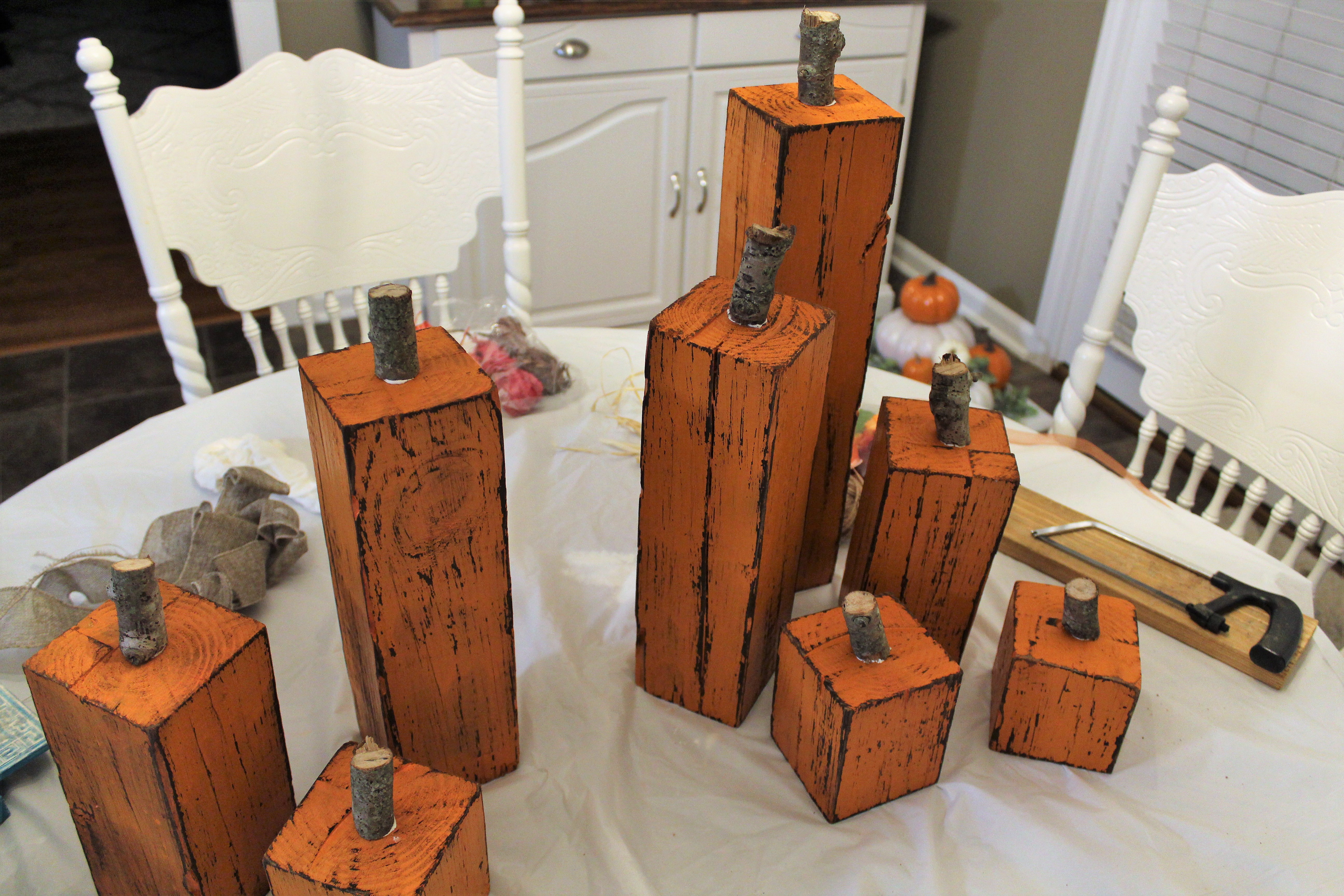So my project today is three wooden pumpkins.  I have seen these around in all different styles and colors.  I thought I would give it a shot and make some.  We have two 4 x 4 sitting in our shed doing nothing but collecting cob webs.  What a great time to pull one out and make some pumpkins.