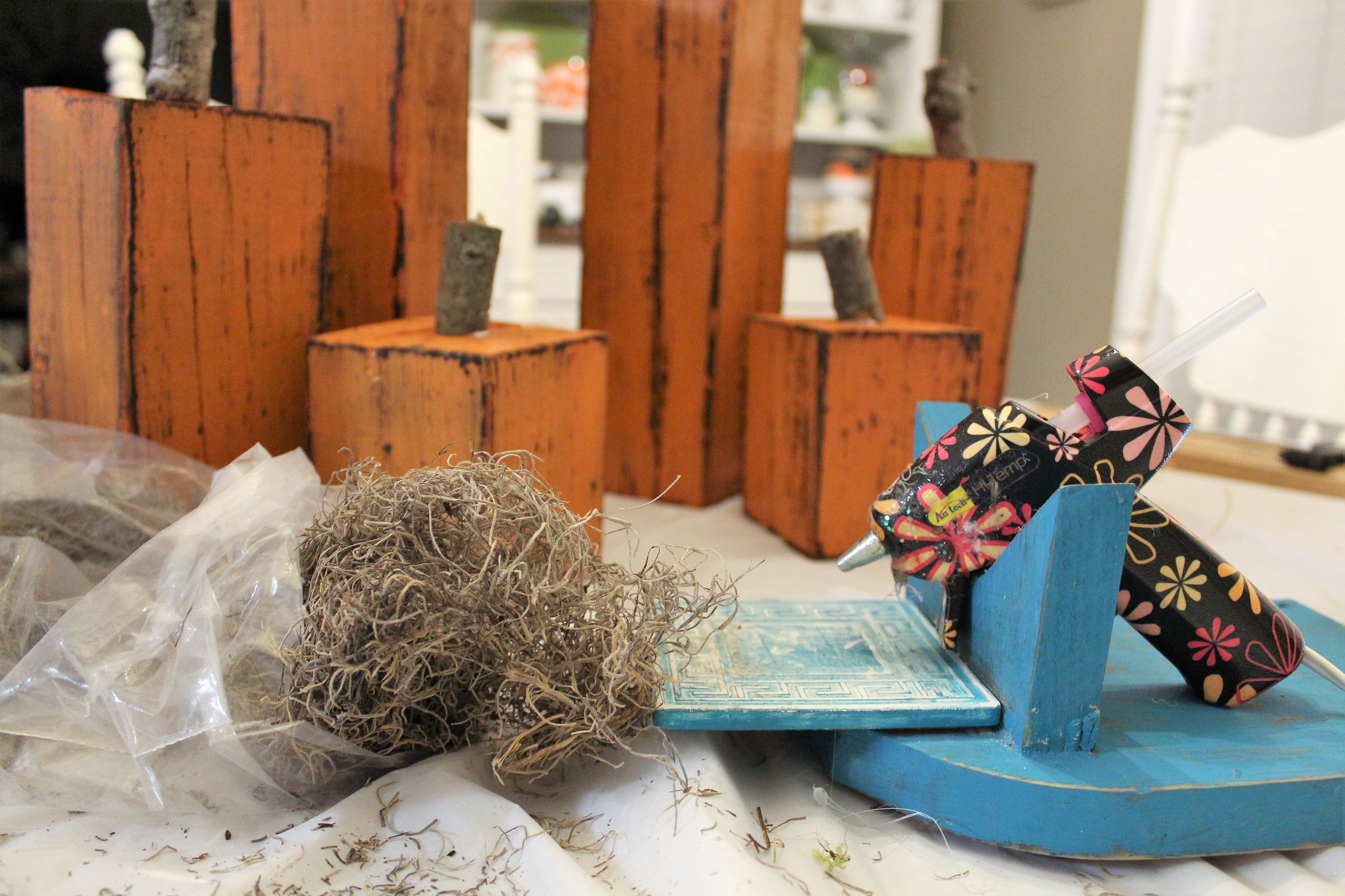I took some hot glue and glued Spanish moss to the top of each pumpkin.