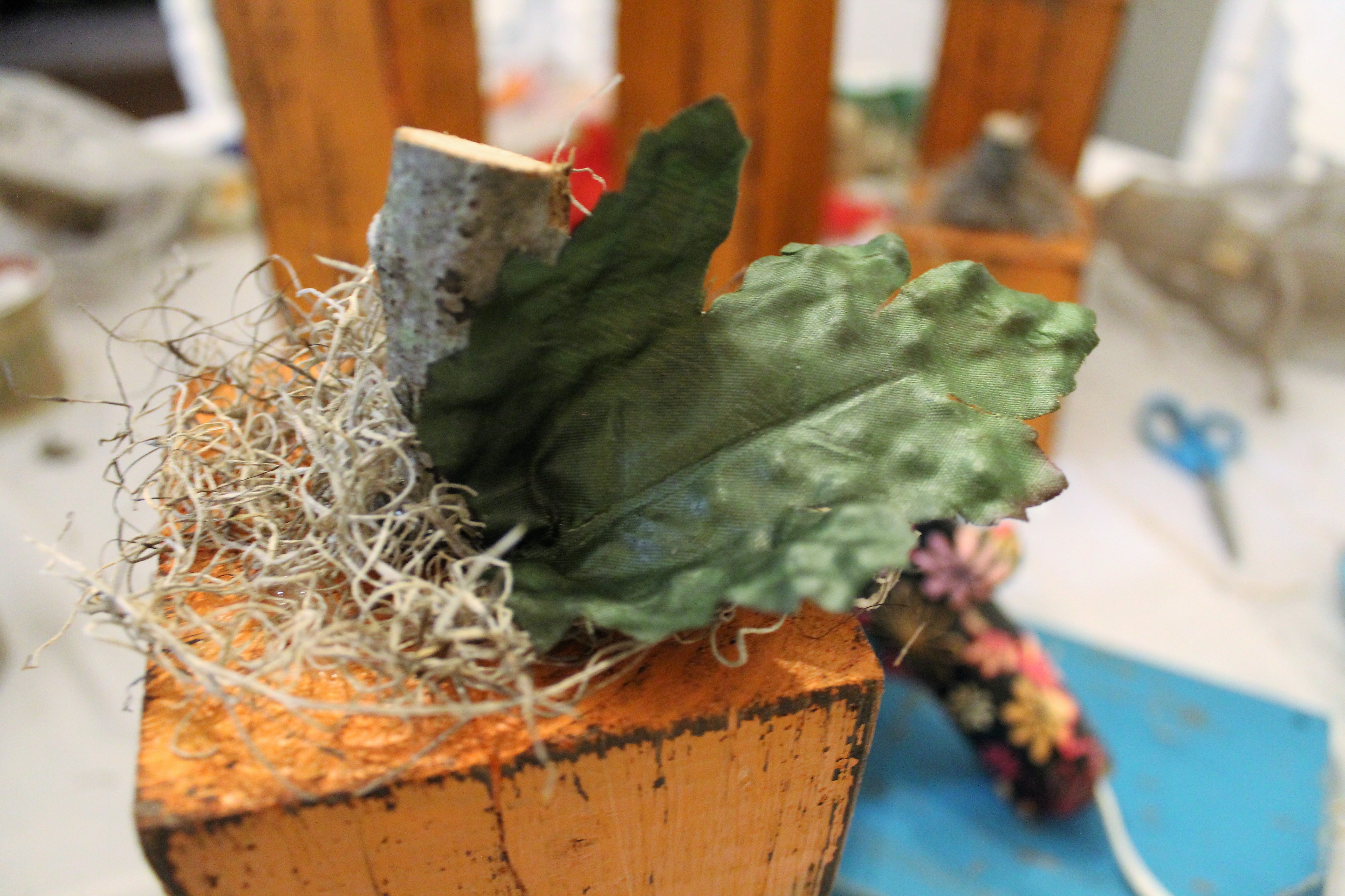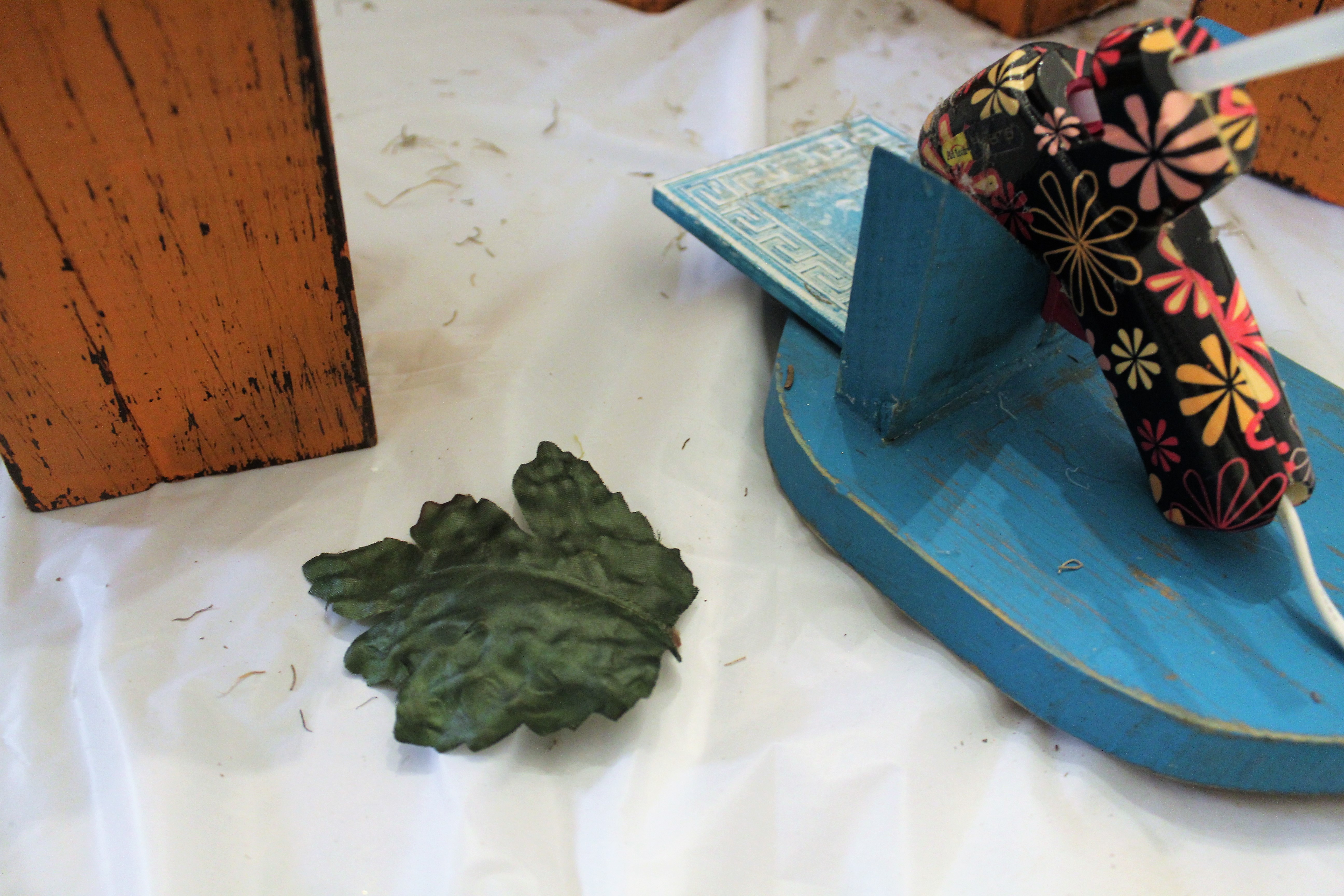 Taking some of my faux leaves and gluing to the top of the pumpkins.