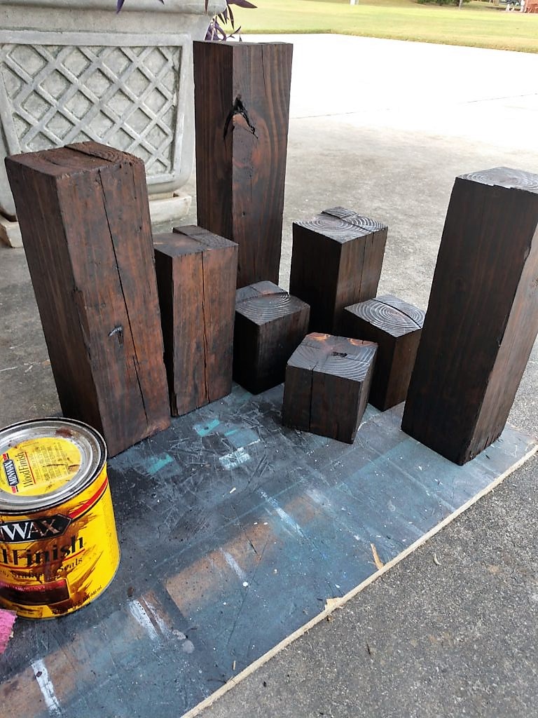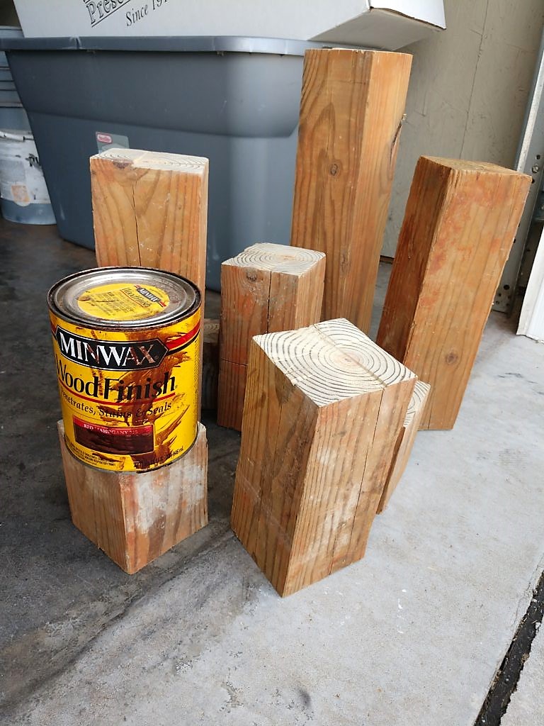 Cut 3 pieces from the 4 x 4 board.  If buying your board at Lowe’s or Home Depot they will cut the pieces for you.  The board is under $7.  I made a couple sets out of my one board.  Here are the sizes.