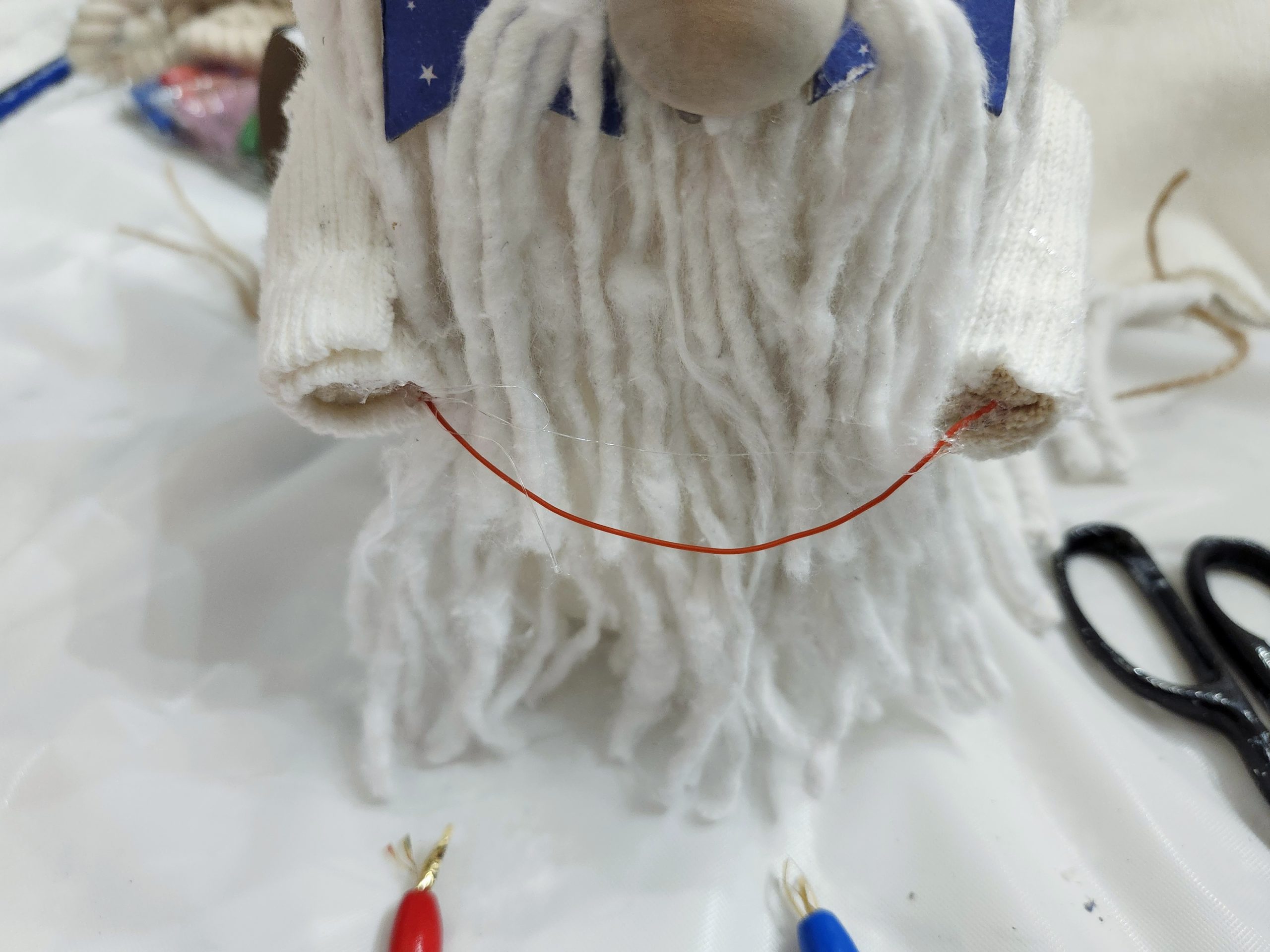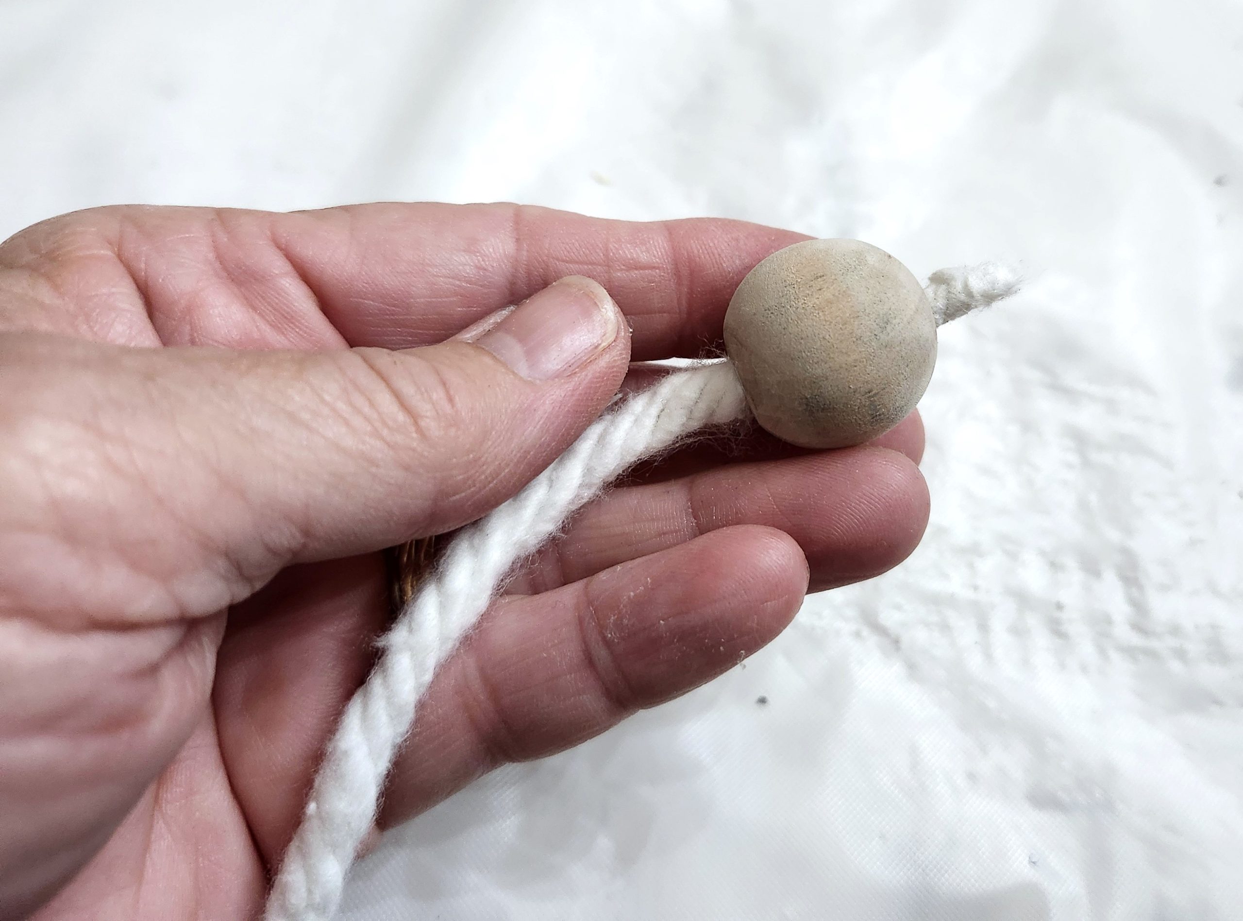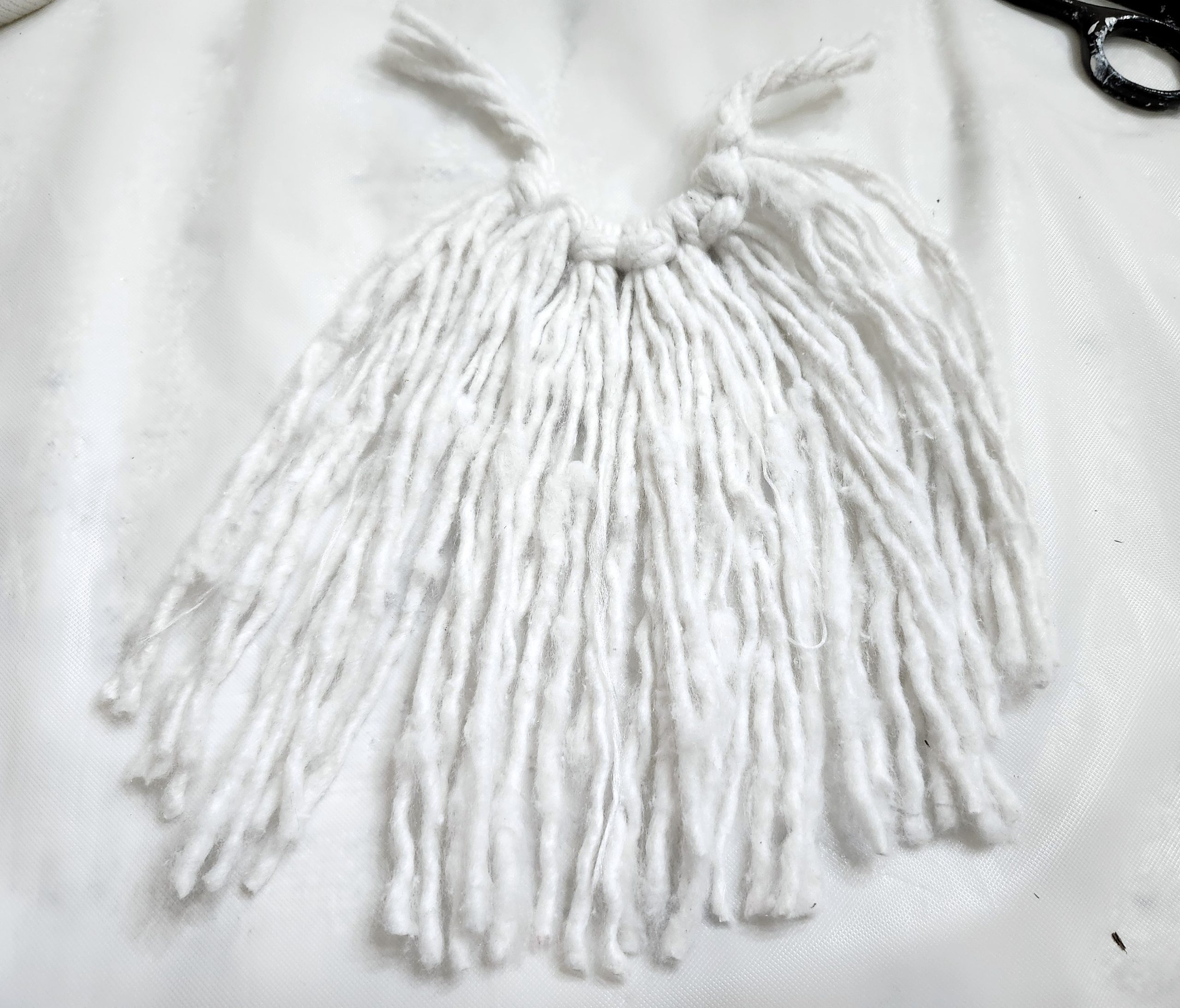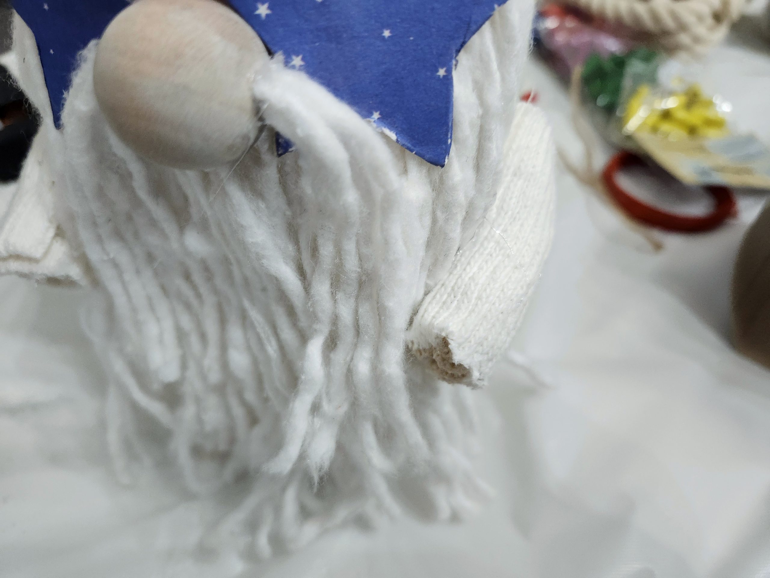 Use a large wooden bead for the nose. Thread one of the short left-over pieces from the beard through the bead. Unravel the pieces, cut ends to make the length you want.