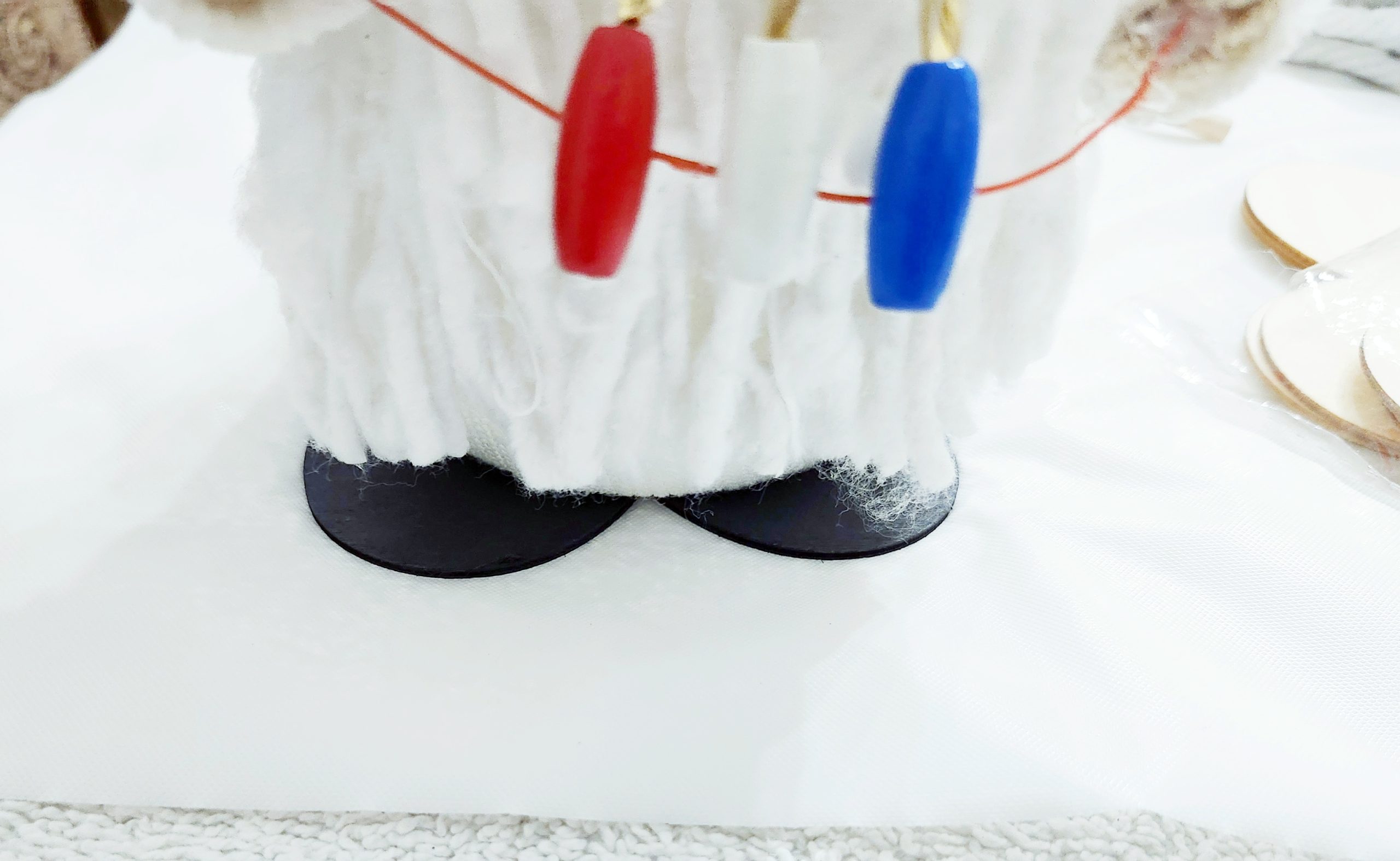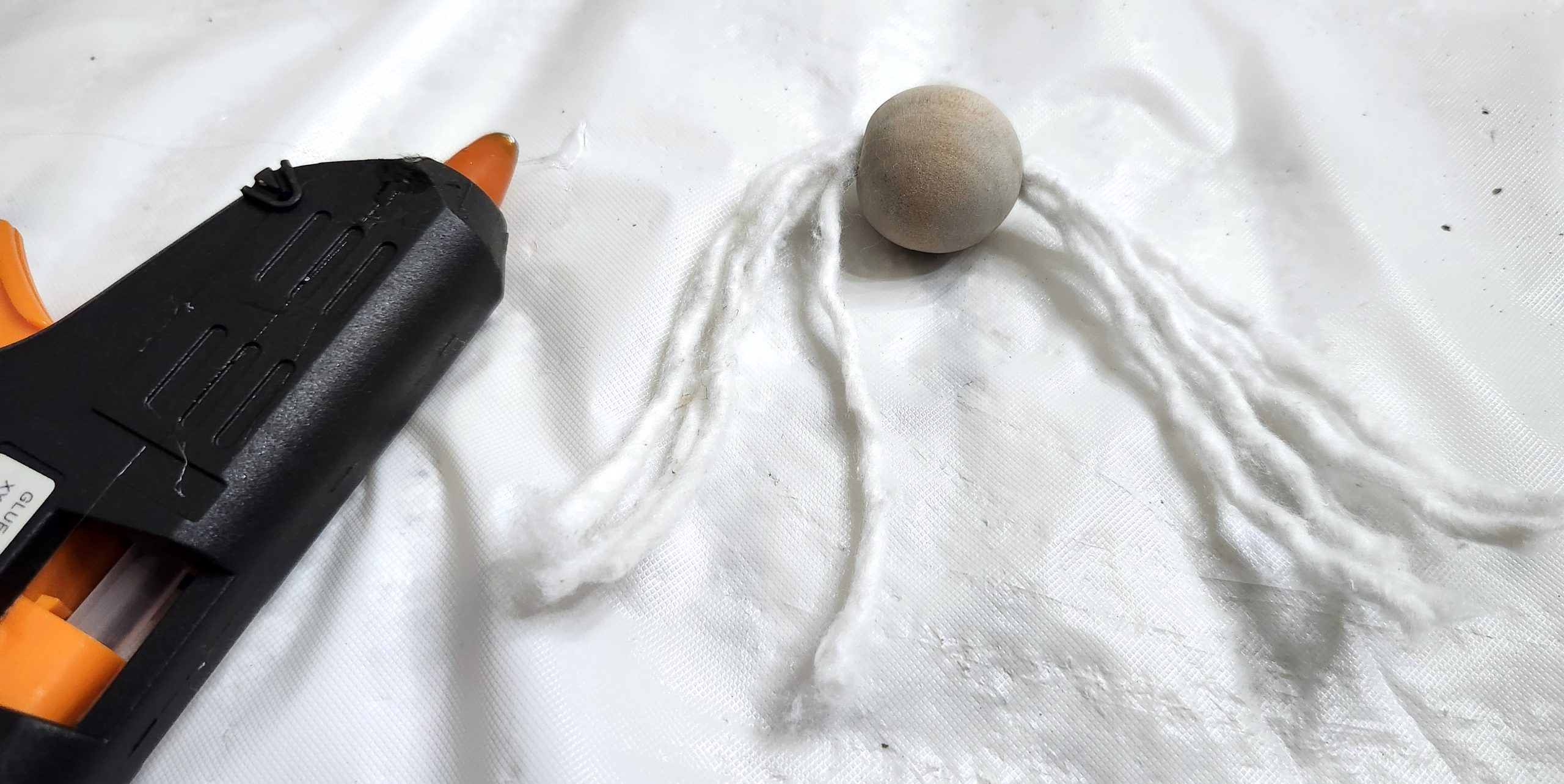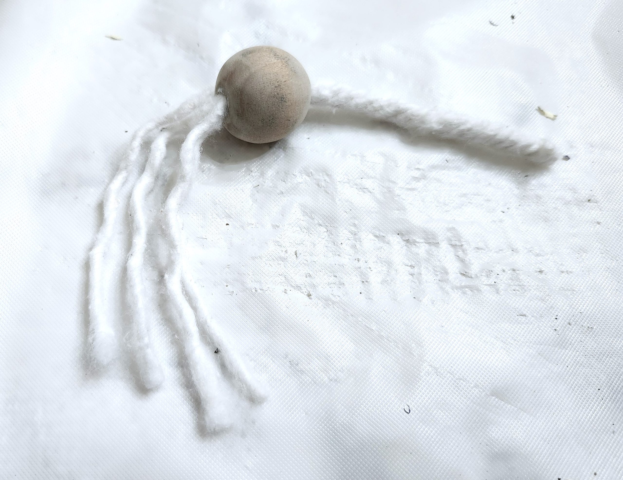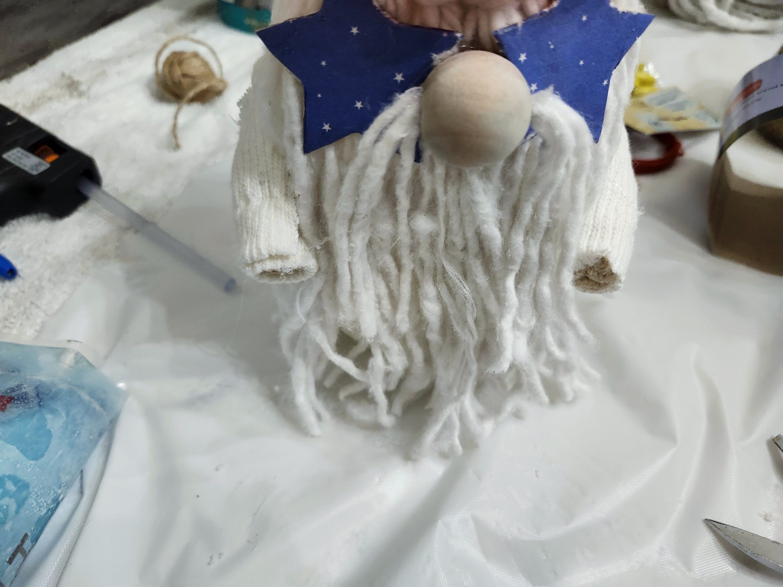 Use a large wooden bead for the nose. Thread one of the short left-over pieces from the beard through the bead. Unravel the pieces, cut ends to make the length you want.