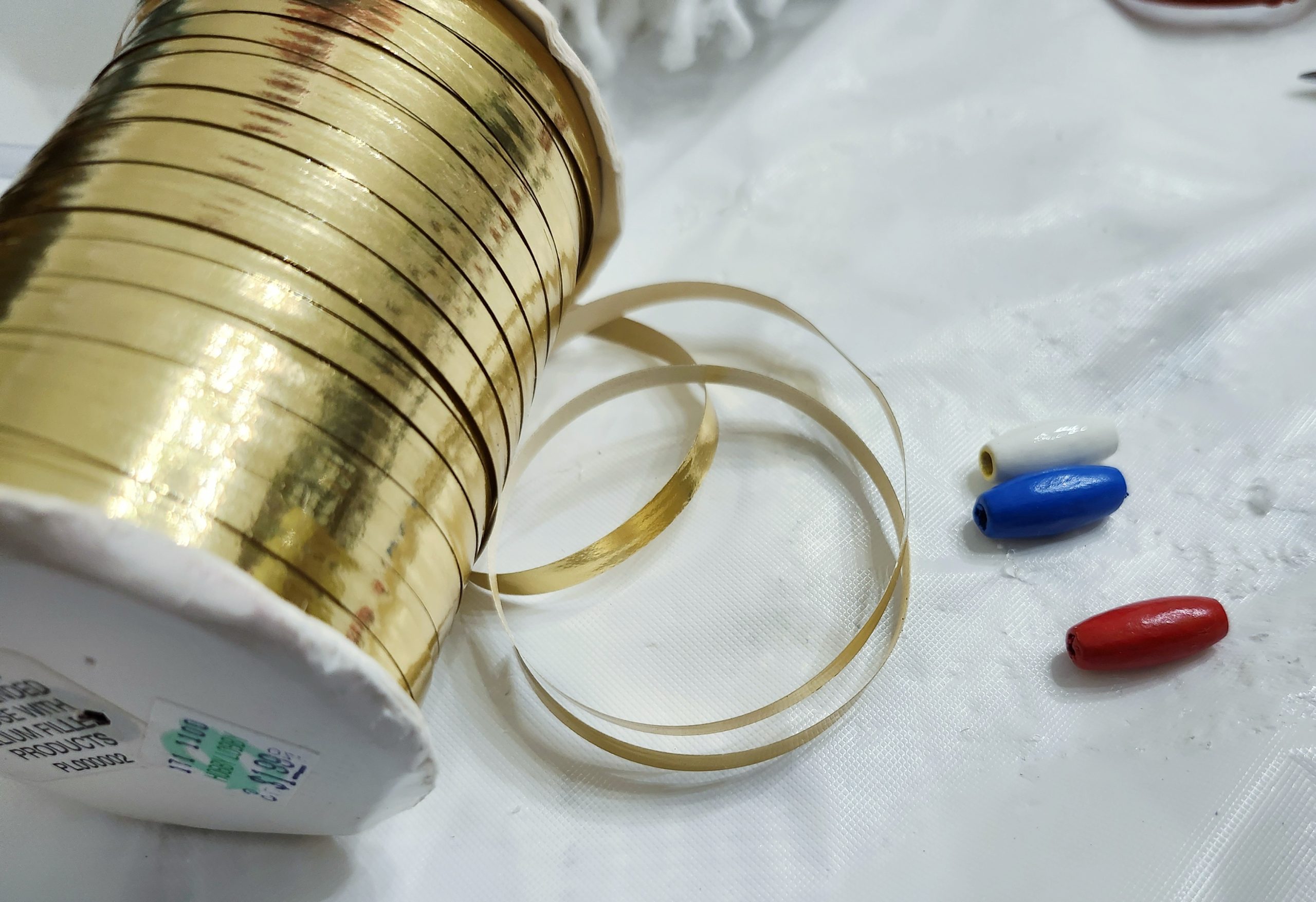 - Cutting three small pieces of gold metallic ribbon making a fringe edge.