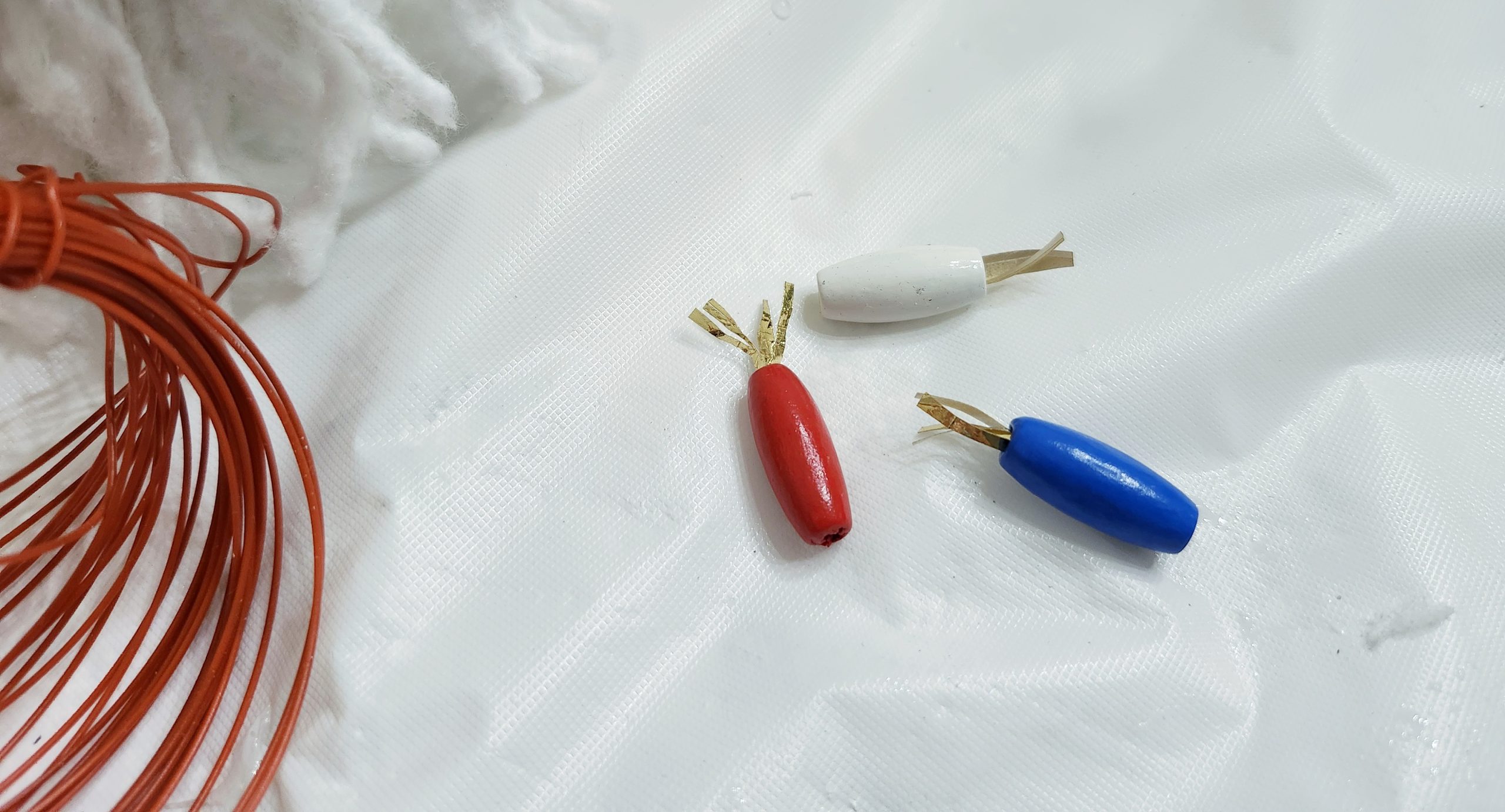 - Pick out three beads, red, blue and white (I painted a yellow bead white).