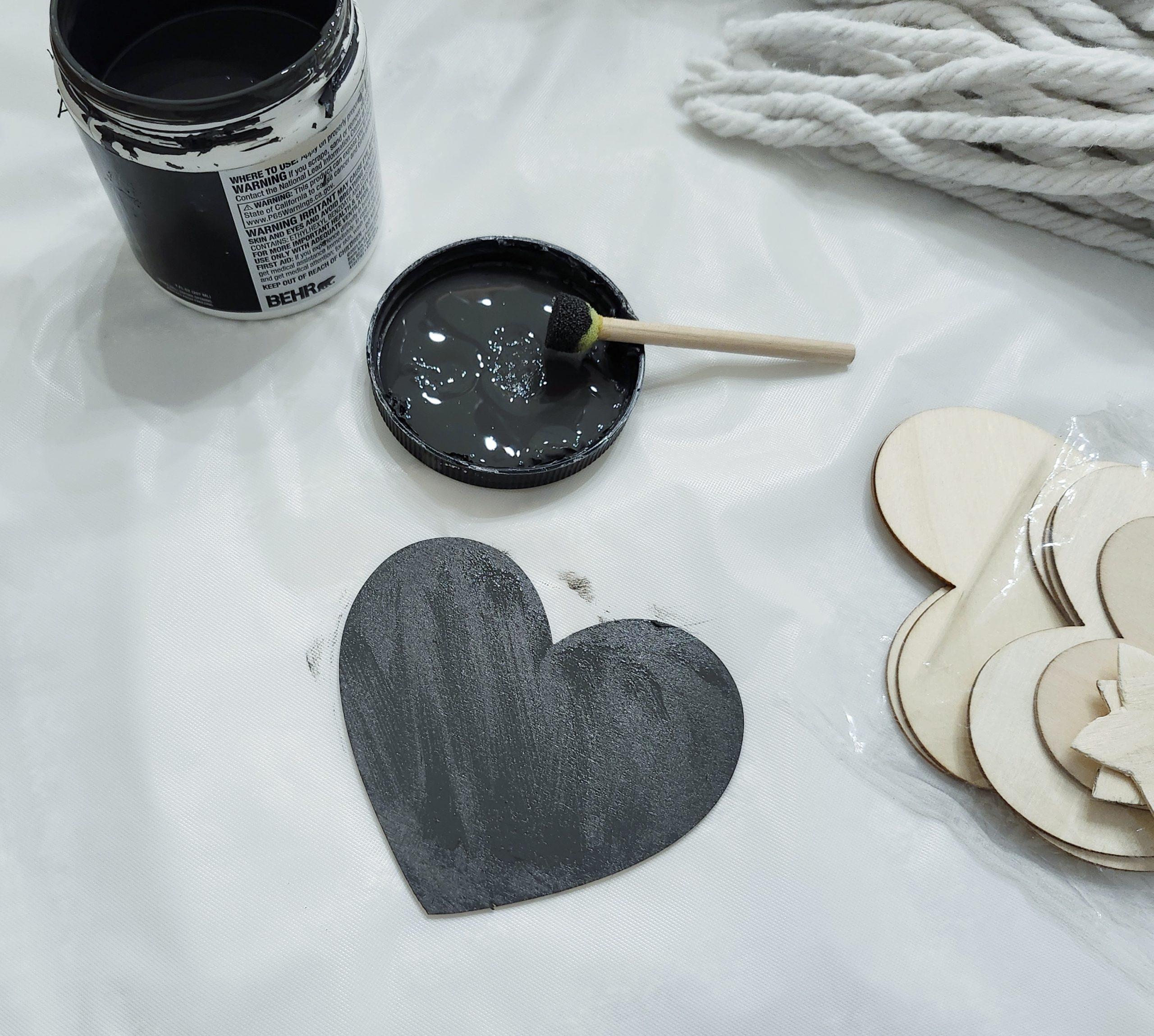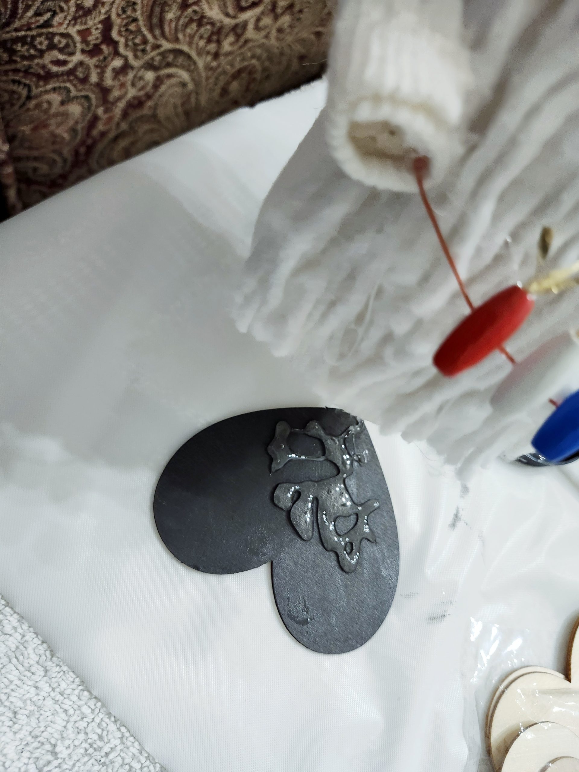 To finish the gnome, take a wooden cut out heart paint it black, glue it to the bottom of the gnome with the point of the heart facing to the back.