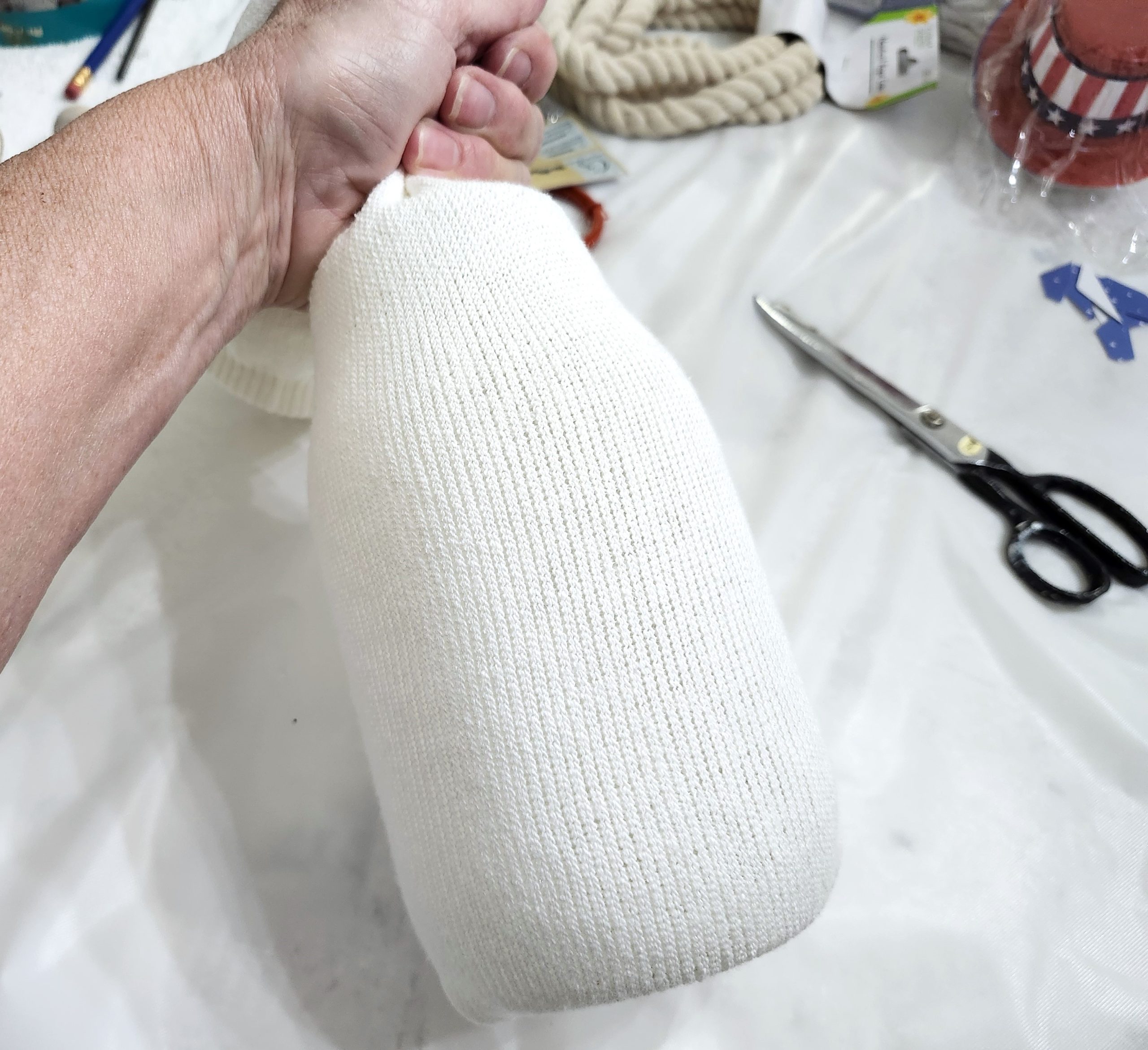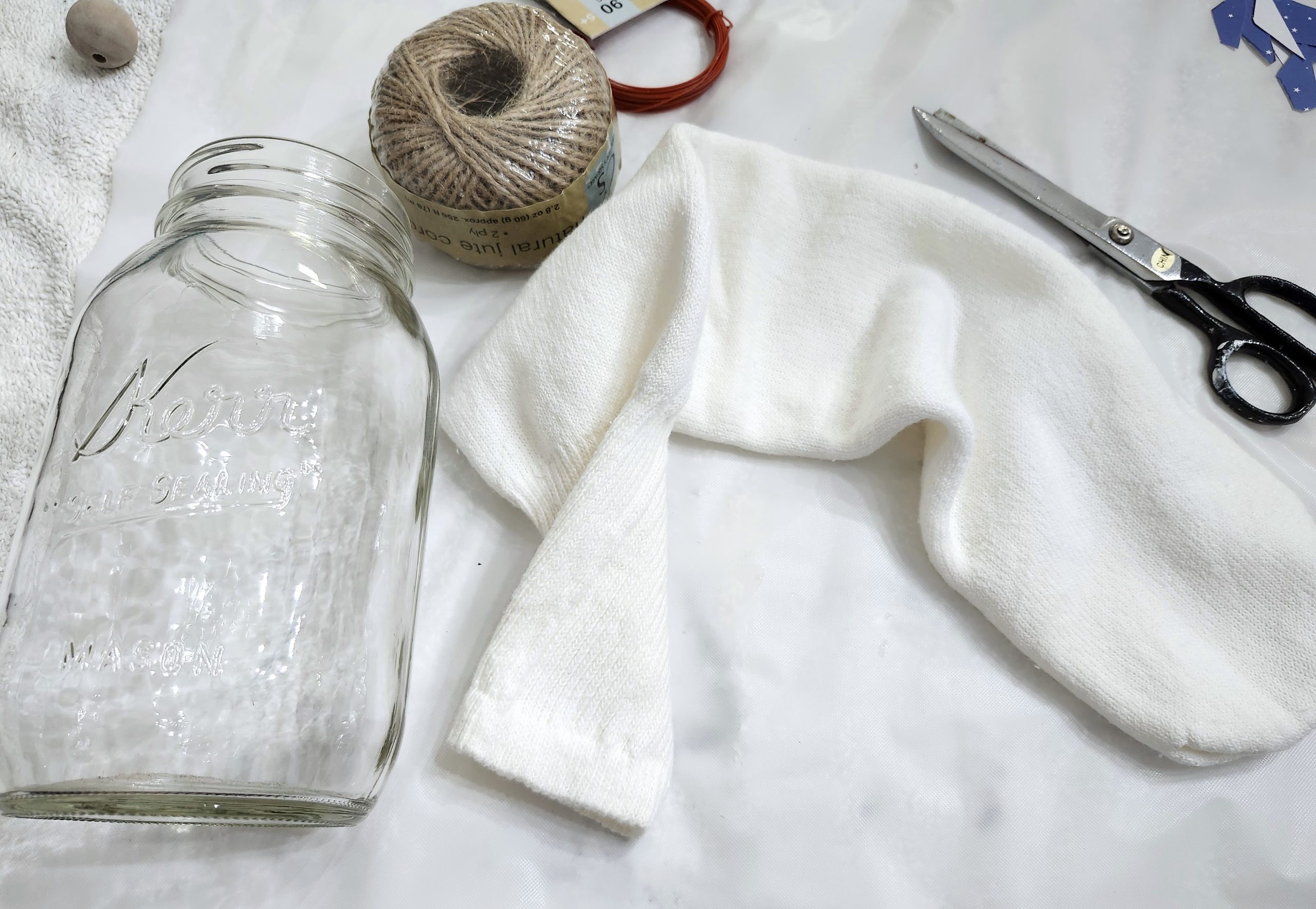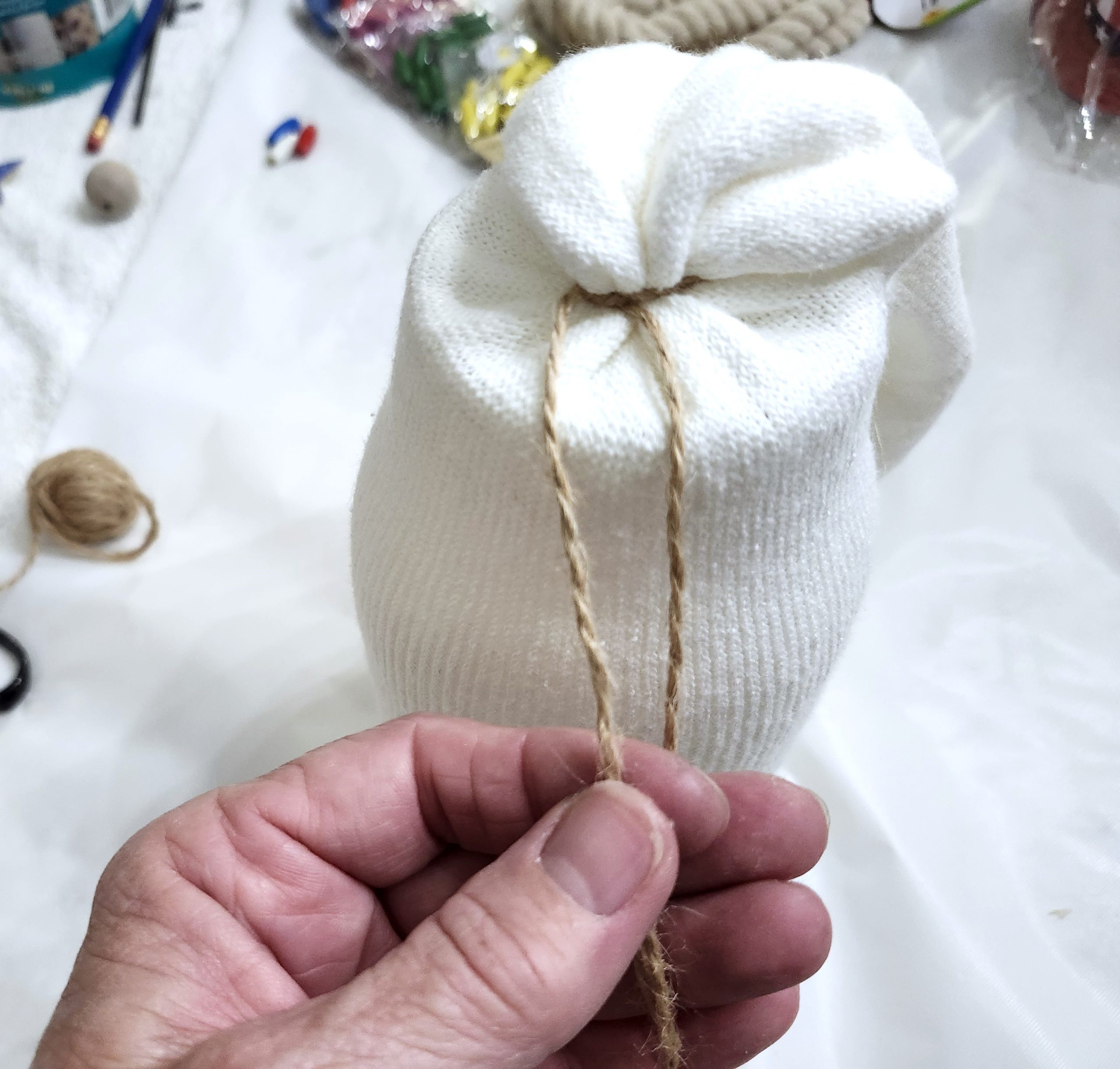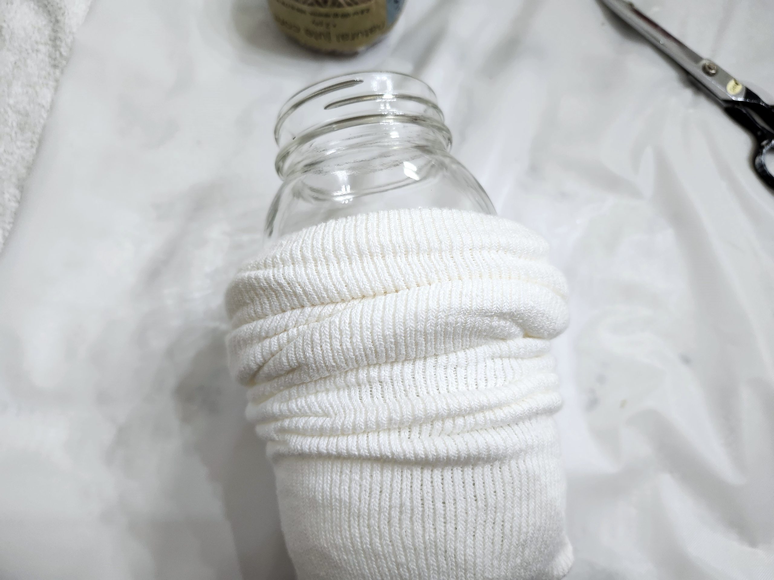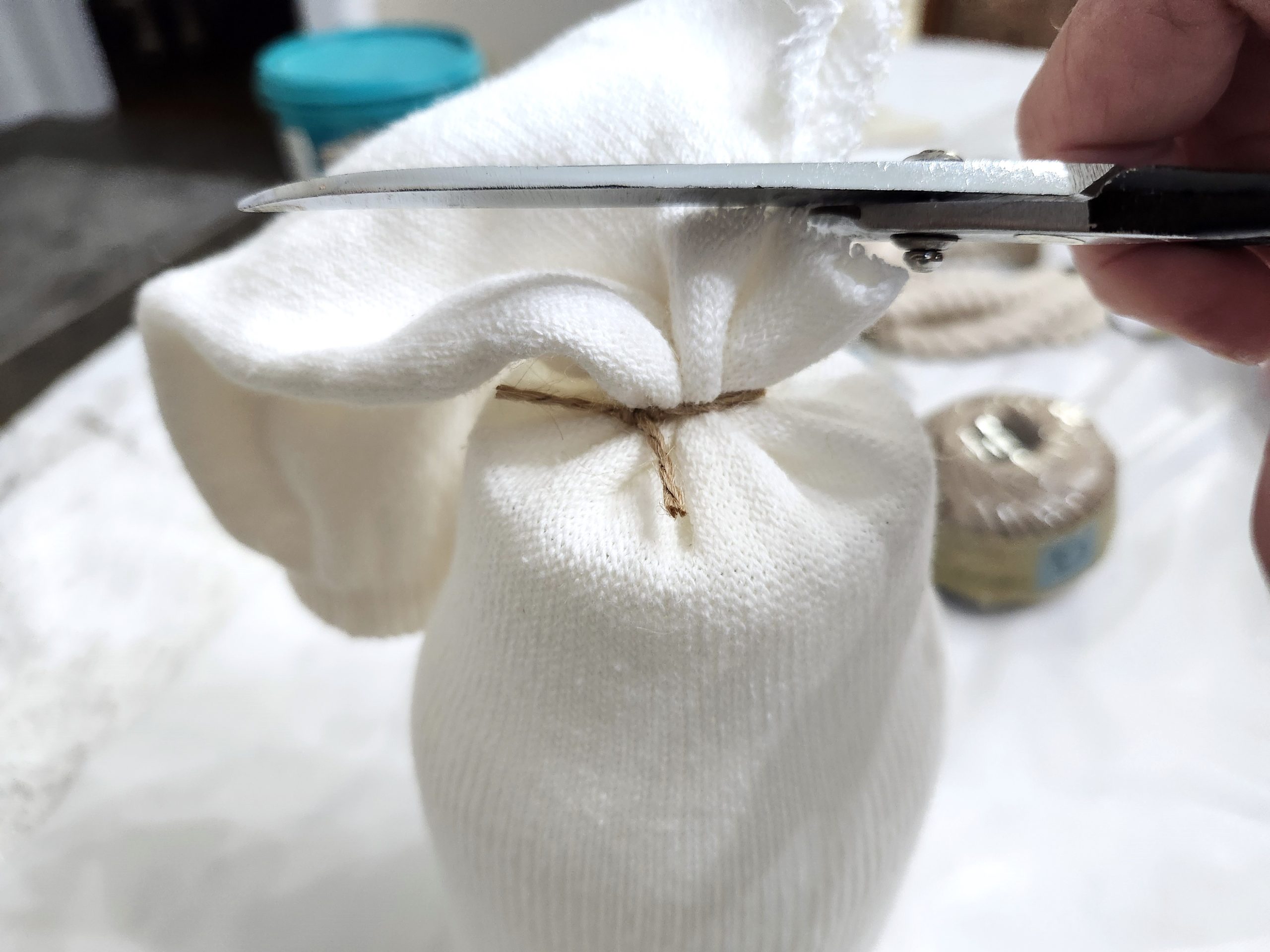 Tie with twine to close the sock at the lip of the jar. Cut off the excess.