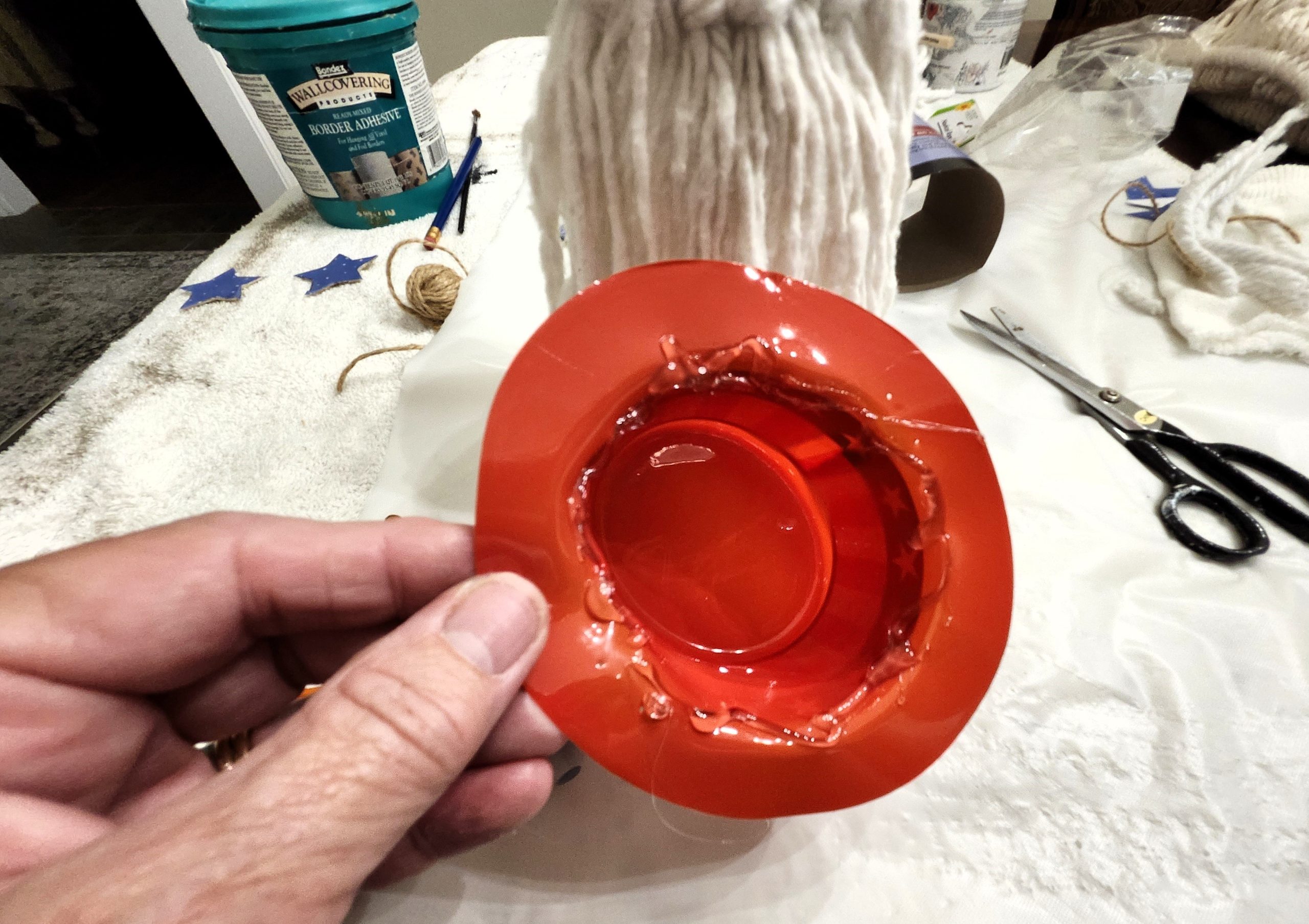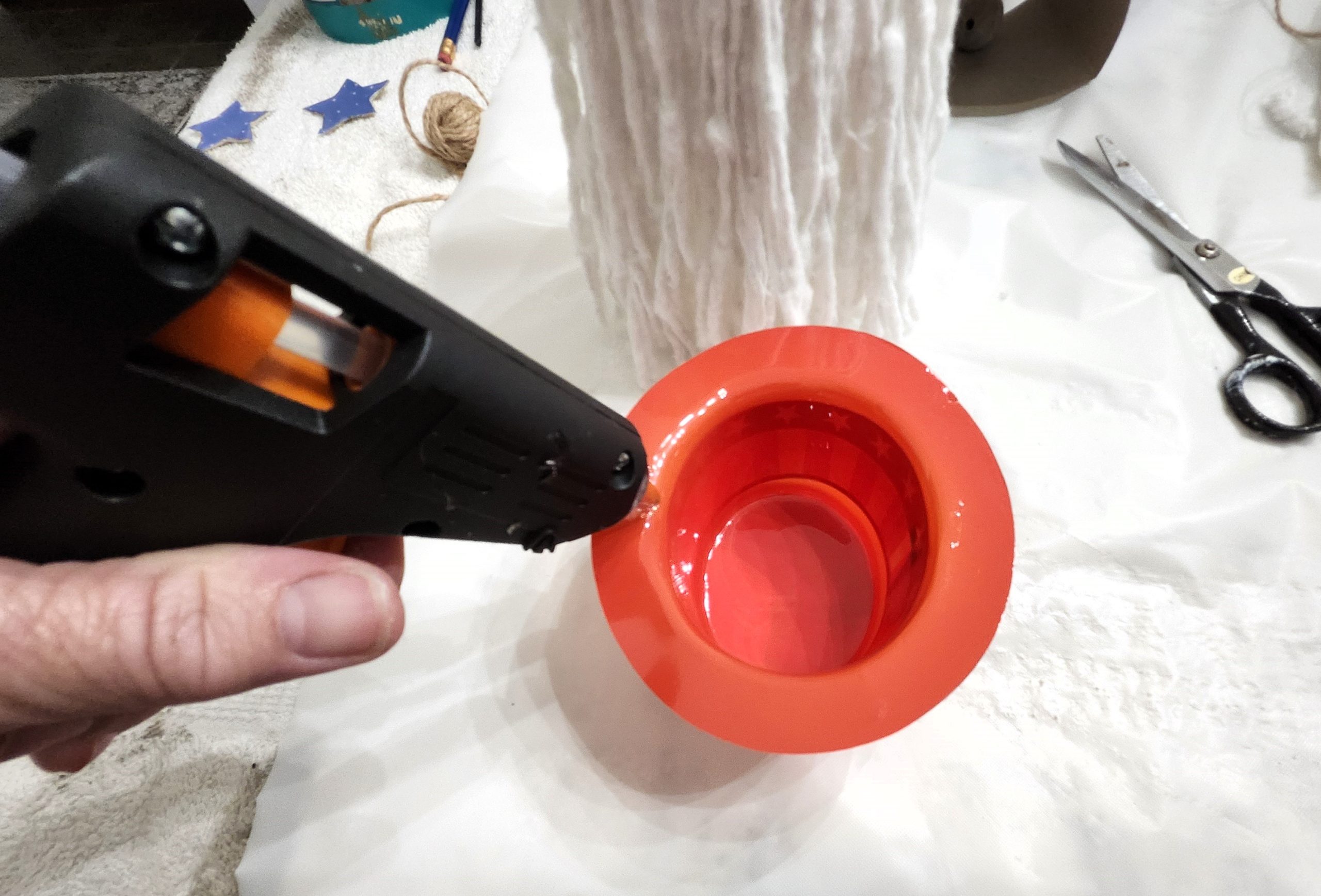 Apply a stream of hot glue to the inside of the hat and place on the top of the jar.