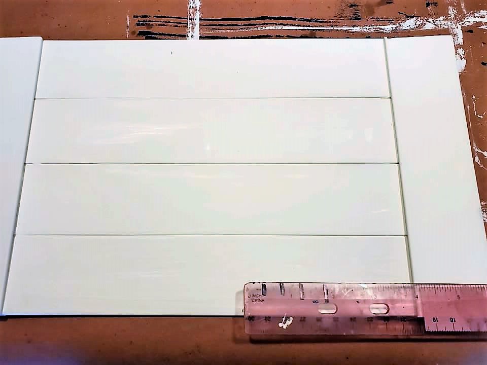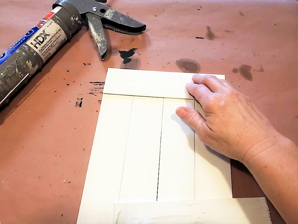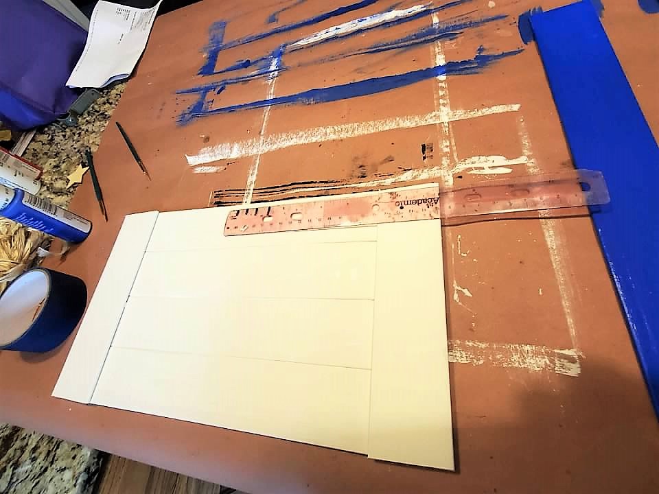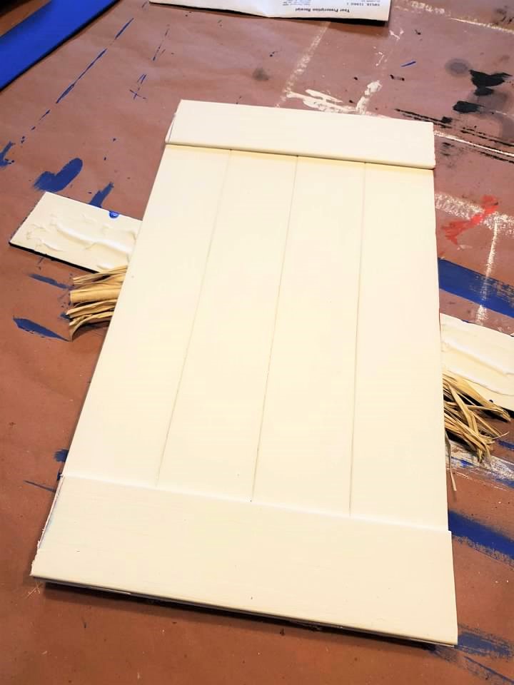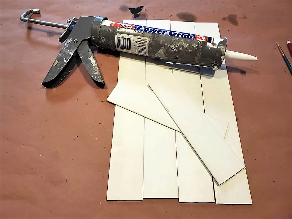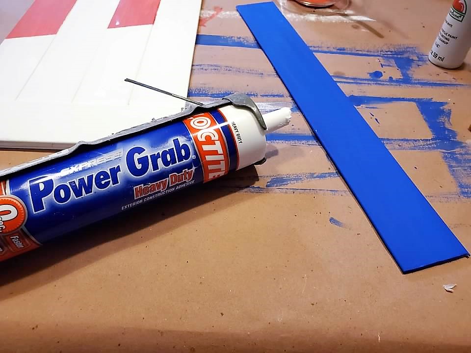 Taking one of the 15 inch blue slats adding power grab to the back.  I placed it on top of the raffia and red and white stripes.