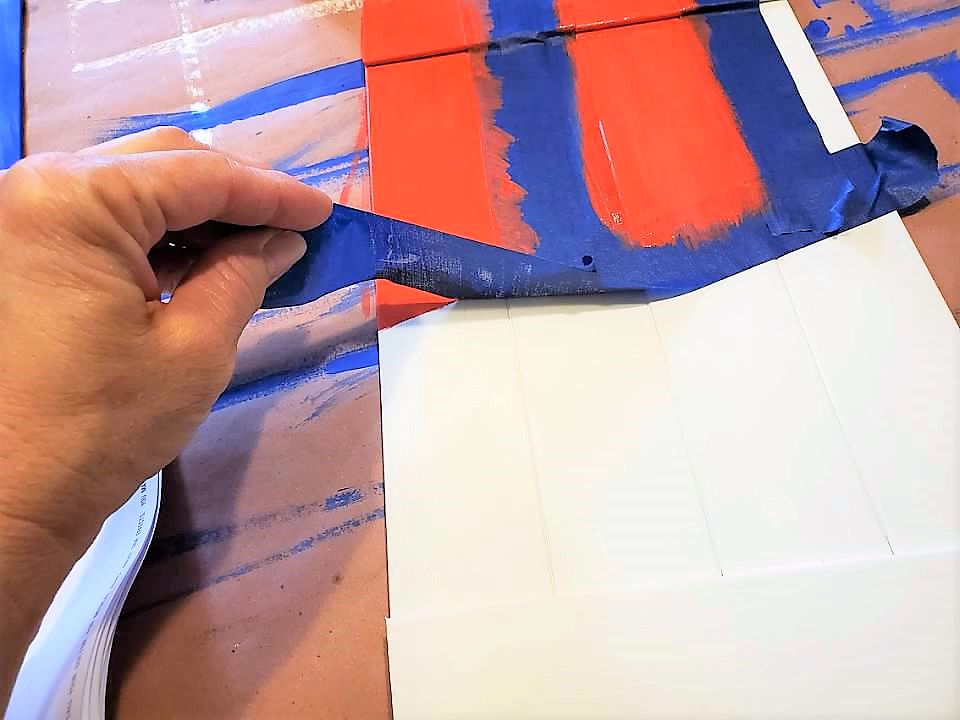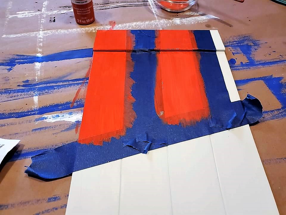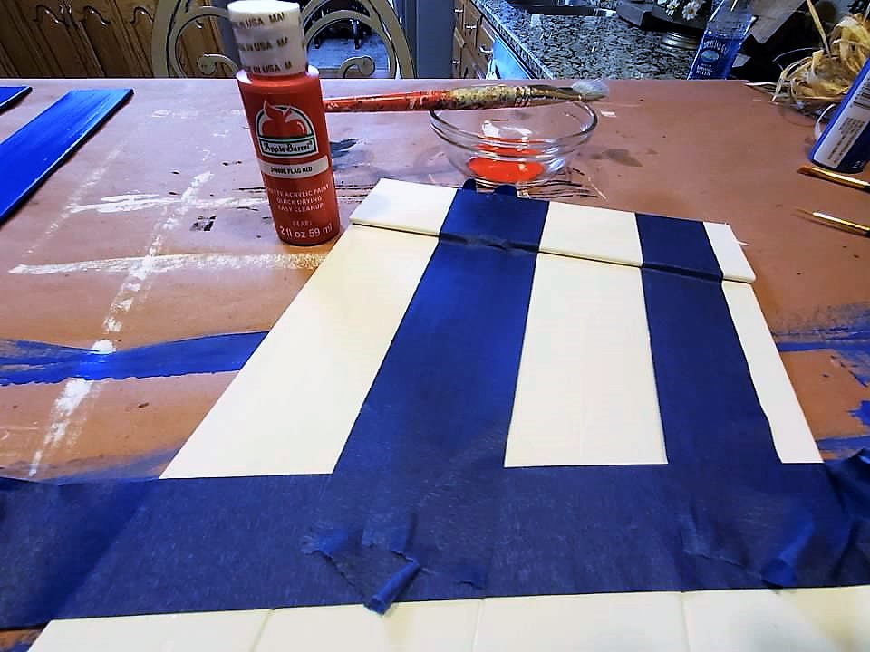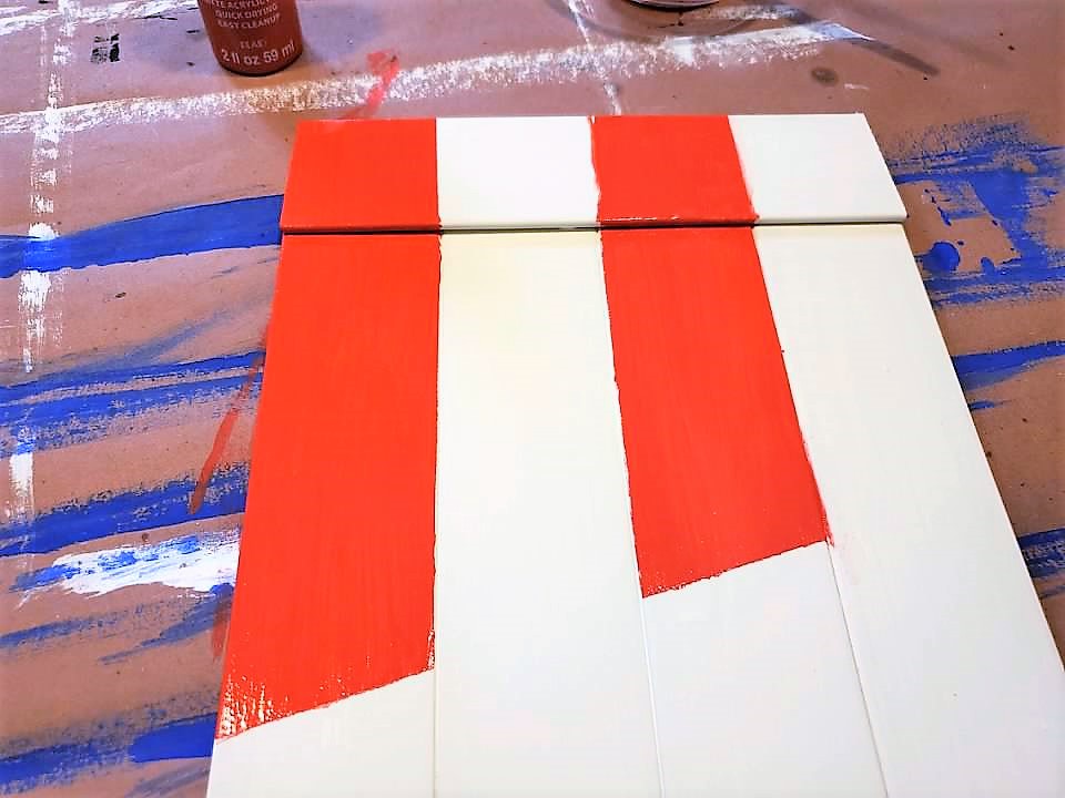 I am using Flag Red craft paint to the exposed slats above the diagonal tape.  I gave it 3 coats.  Remove the tape after the last coat before it dries.