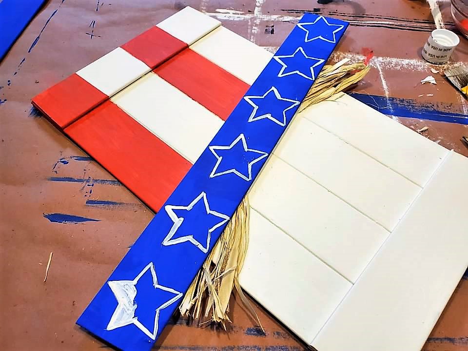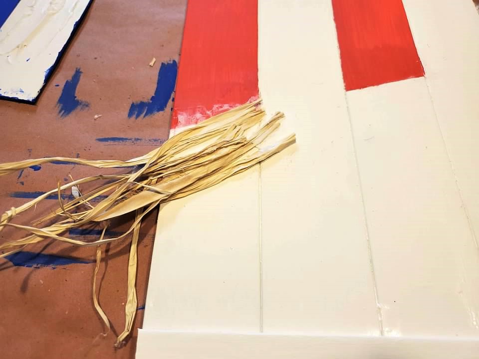 Turning it over and doing the same thing with the red and white paint.  Adding raffia in long strips across the slats and then adding the blue slat with painted white stars.
