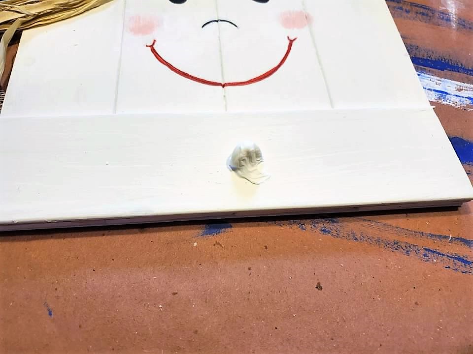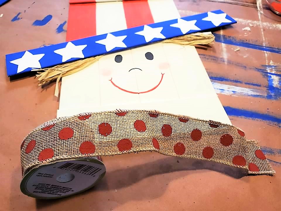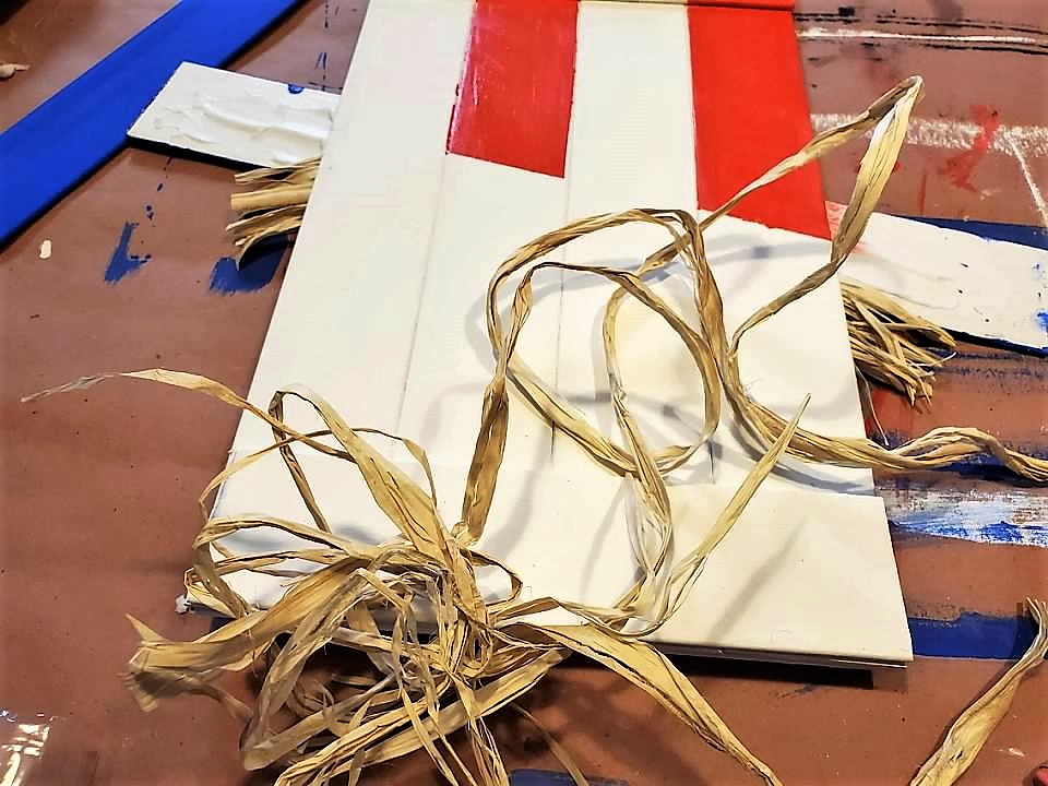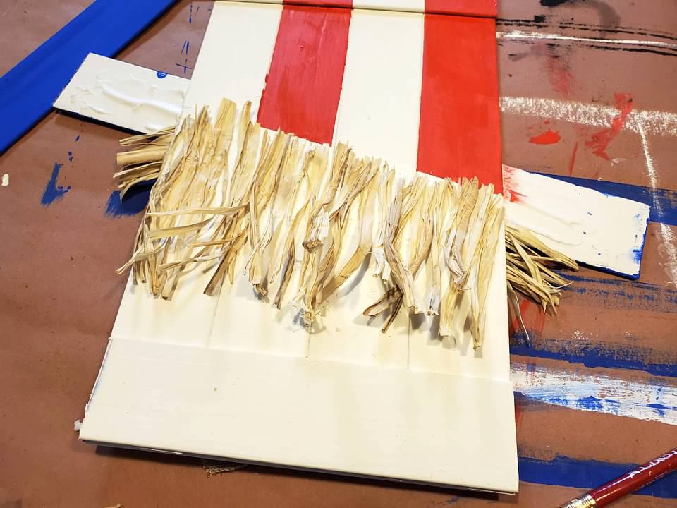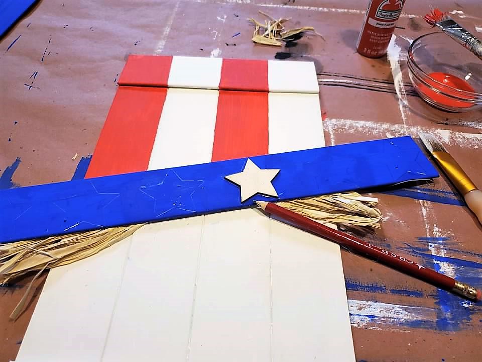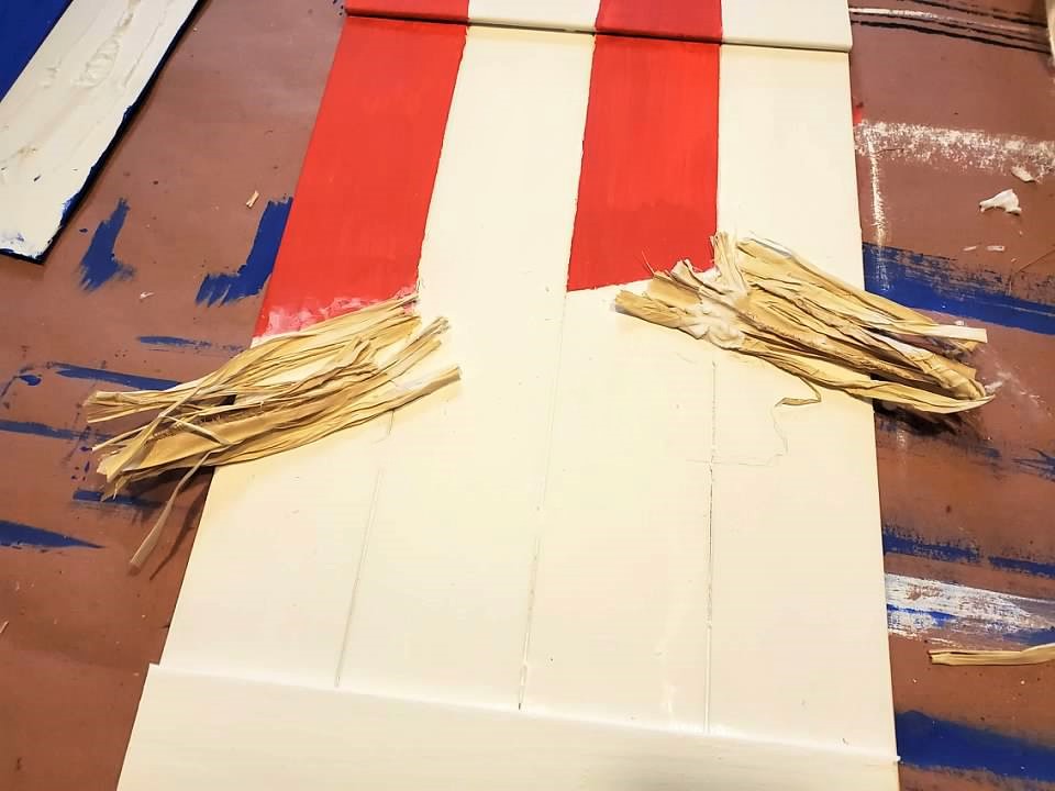 Let dry.  Taking some raffia and applying it underneath the red and white stripes.  I applied some power grab to each side under the red and white strips.  Adding raffia strips on the glue.  This will be Uncle Sam’s hair. 🙂