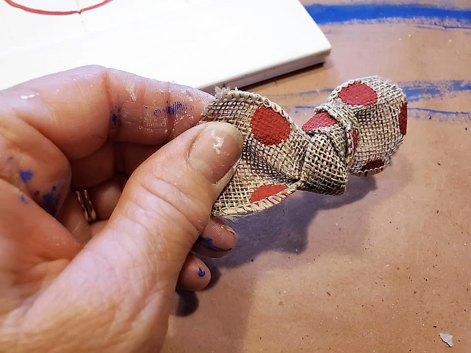 To give him a little bow tie I took a piece of ribbon and tied a knot in the center, added a drop of power grab in the lower center to attach the bow.